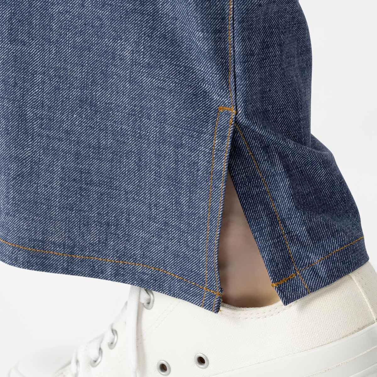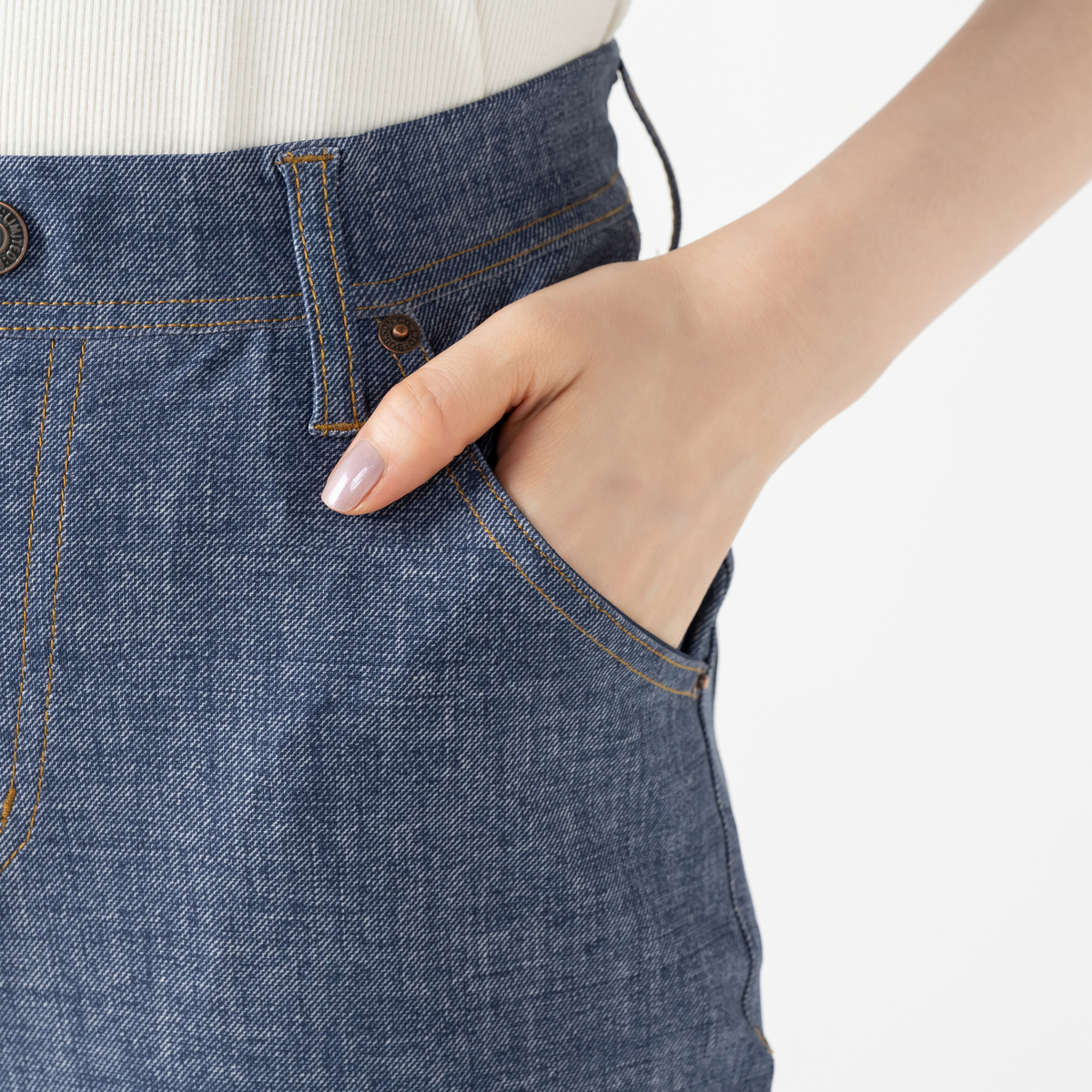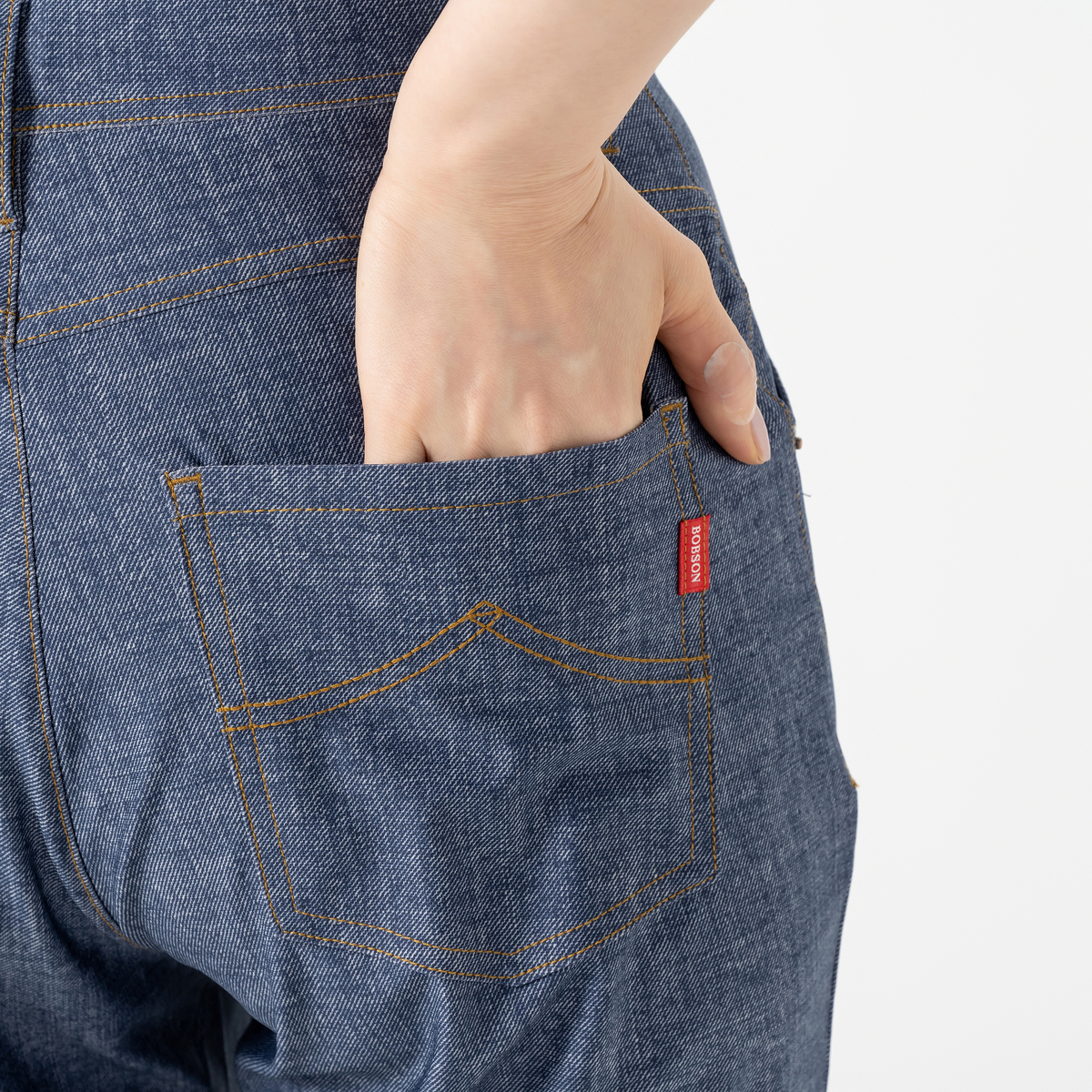生地は先染めと転写プリントでリアルなデニム見えを追求。フロントボタンや右後ろポケットのサイドネームに至るまで、品質を厳選したBOBSON名を入れたオリジナル品を付けています