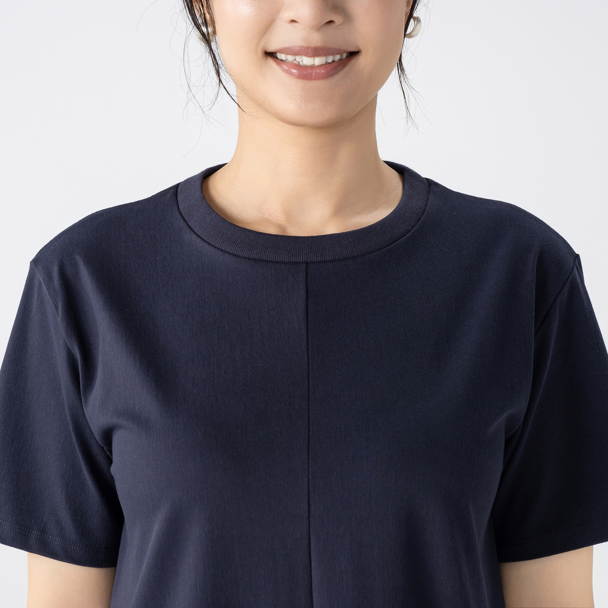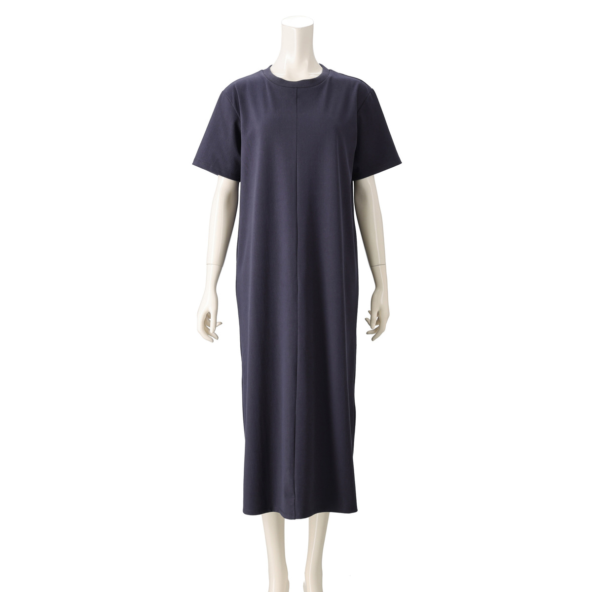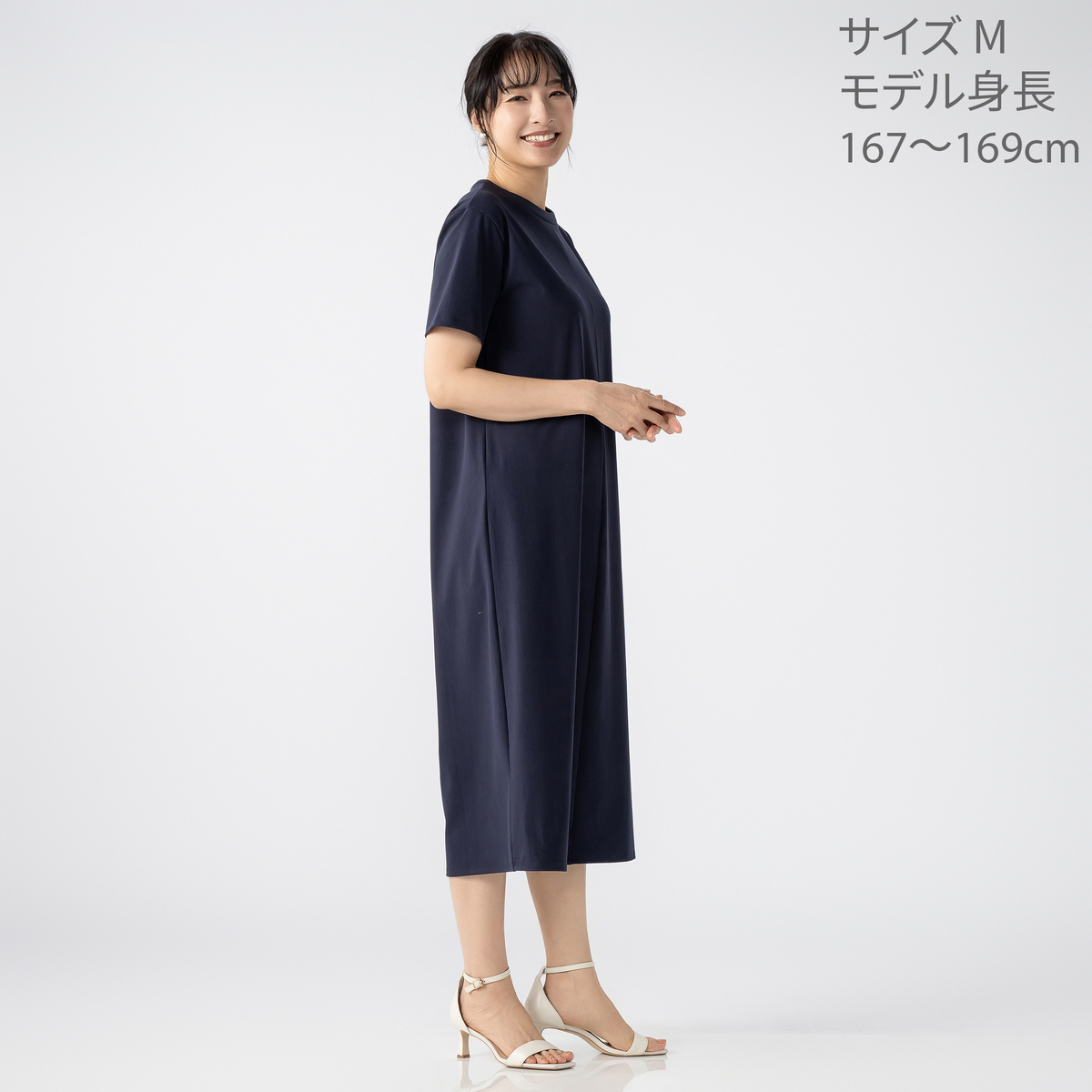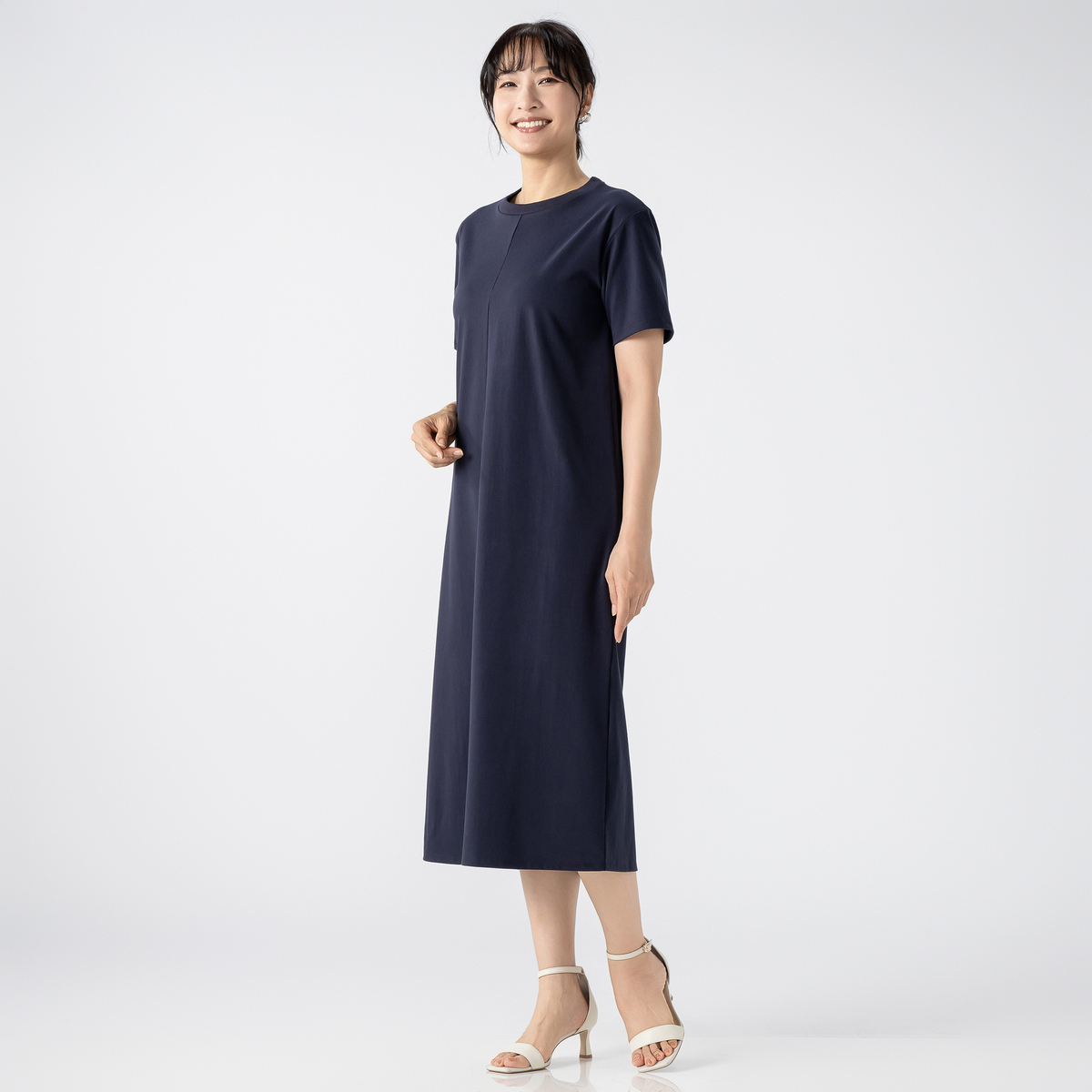 すっきりときれいなAラインのカットソーワンピース。1枚で着用しても体型が気になりにくくなっています。機能性を付与する後加工技術で冷感機能を重視して開発したCOVEROSS(R)のウルトラフリーザーを使用しました