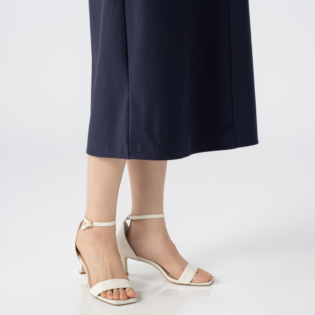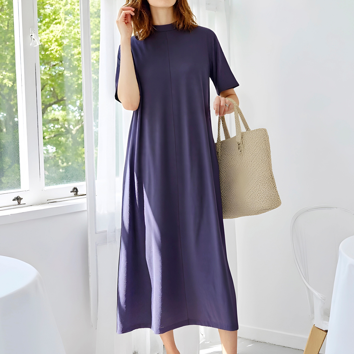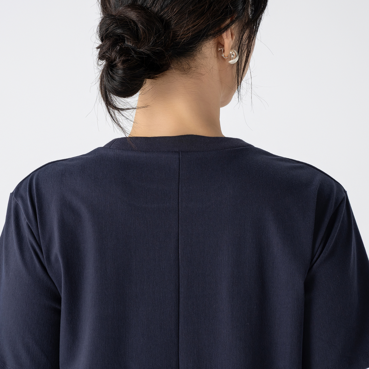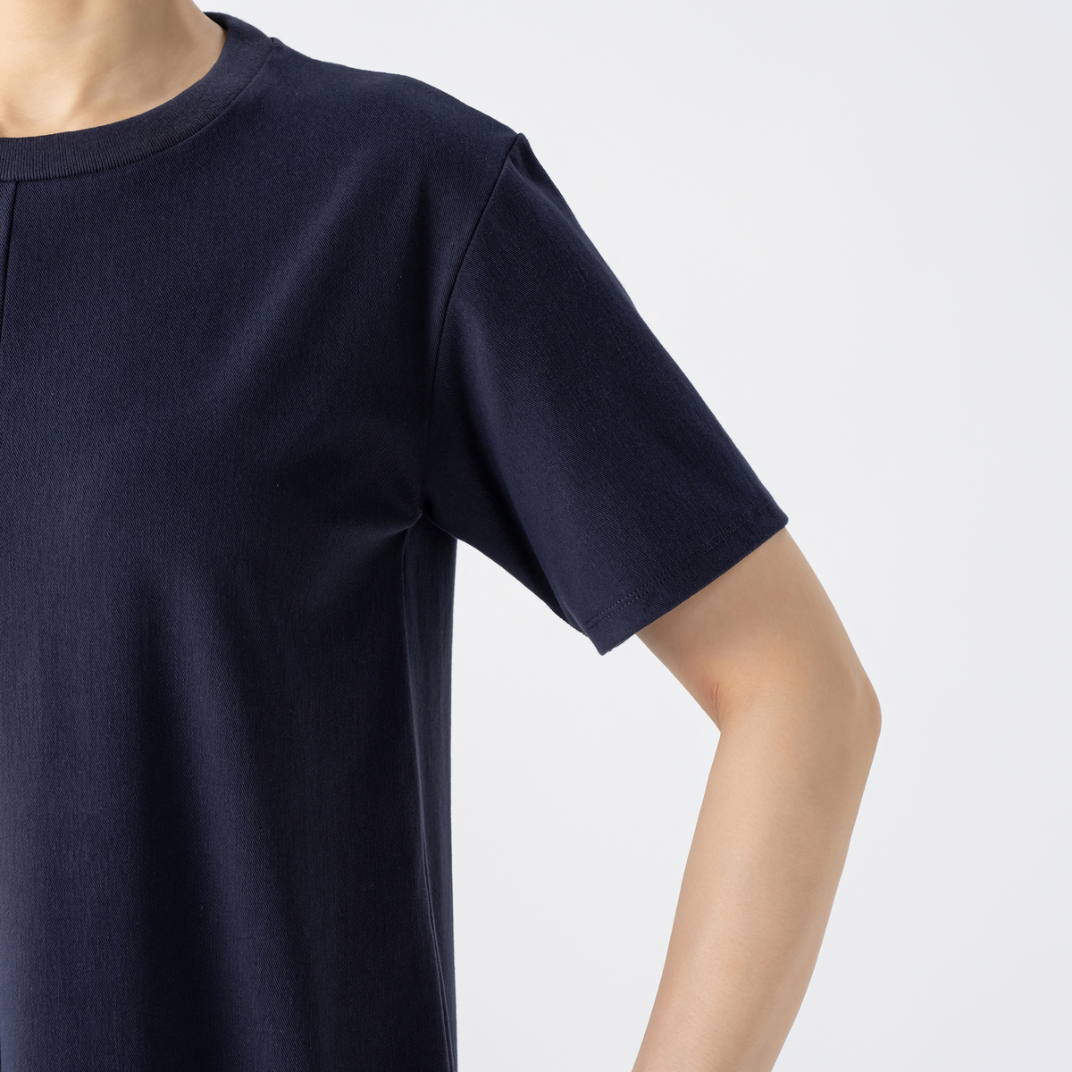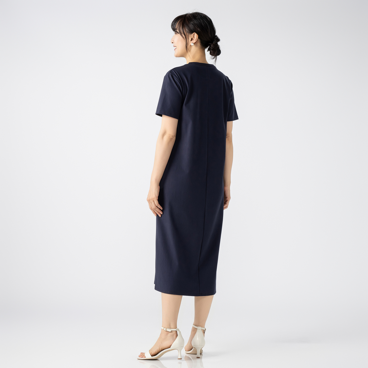 すっきりときれいなAラインのカットソーワンピース。1枚で着用しても体型が気になりにくくなっています。機能性を付与する後加工技術で冷感機能を重視して開発したCOVEROSS(R)のウルトラフリーザーを使用しました