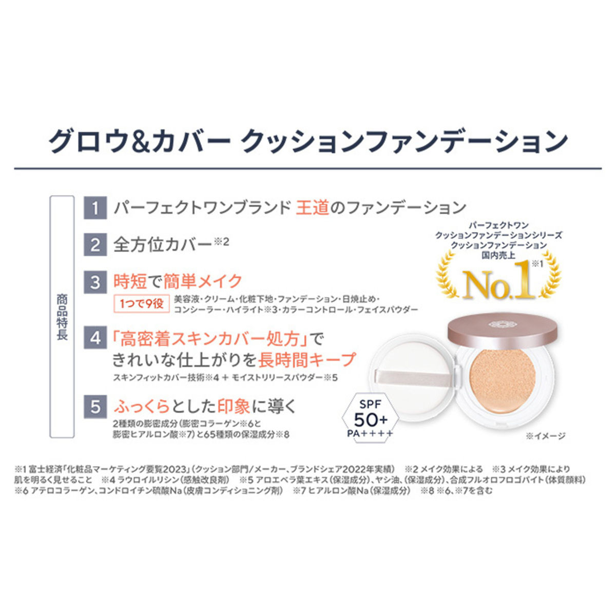 カバー力のあるクッションファンデーションです。プロ級のカバー力(*1)で若々しい仕上がりに。ポンポンと肌にのせるだけで、シミ・シワをカバーします