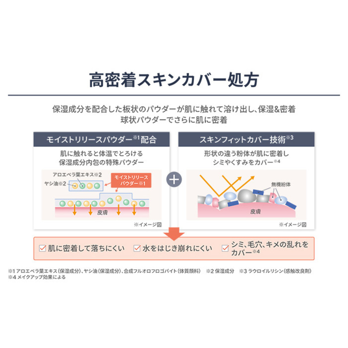 肌へのしっとり感と密着感を強化。保湿成分であるアロエベラ葉エキスやヤシ油を配合した特殊なパウダーのモイストリリースパウダーを採用しました。アロエベラ葉エキスが肌の温度で溶け出し、肌表面を保湿しながら密着。粉っぽくなりにくく、しっとりした仕上がりです(*3)