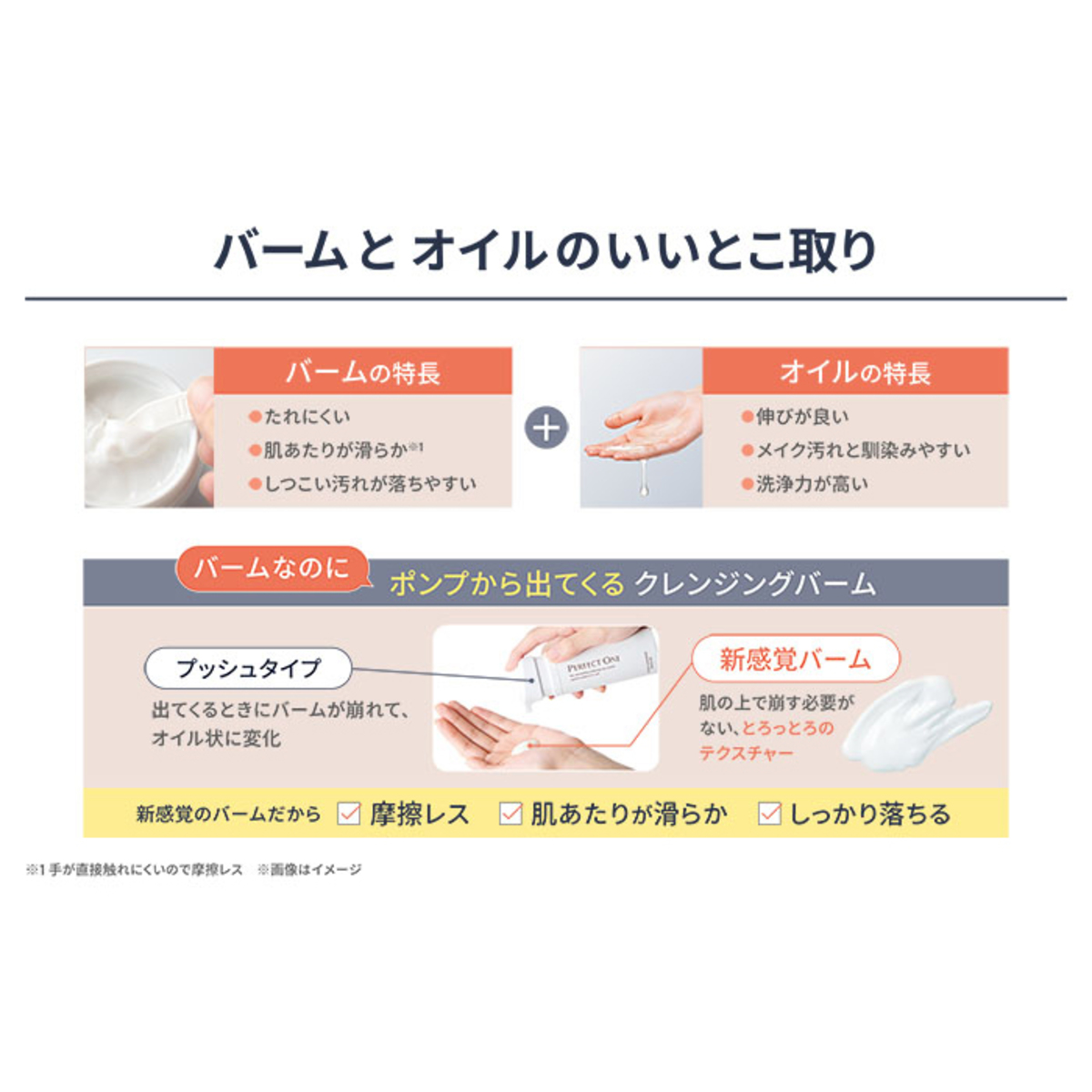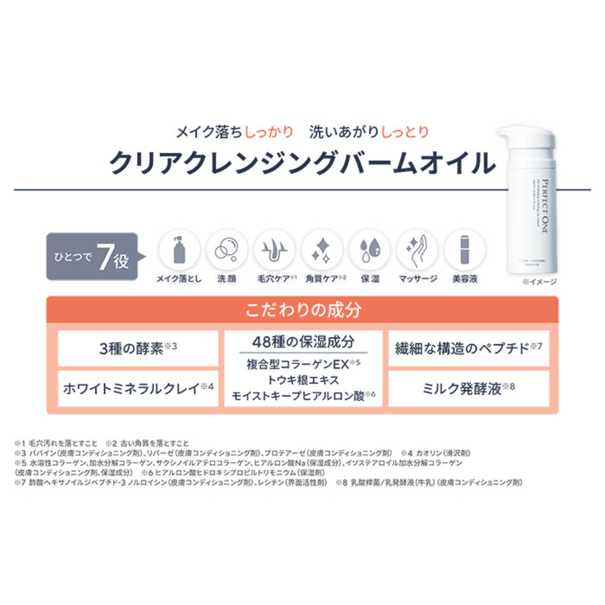 [セット内容] パーフェクトワン クリアクレンジングバームオイル80g×2 [使用方法] 初めてご使用になる際は、ストッパーを外し中身が出るまで数回ポンプをプッシュしてください 【メイクをしている場合】 ウォータープルーフのマスカラや落ちにくいポイントメイクをされている場合は、ポイント用クレンジング剤をあらかじめご使用ください 手や顔が濡れていてもお使いいただけますが、軽く水気をはらってからお使いください (1)適量(2〜3ブッシュ分)を手にとり、お顔全体に広げてください (2)お顔全体に広げた後、小鼻のまわりや額、髪との境目、口元などにもやさしくマッサージするようにメイクとなじませます (3)頬は、指の腹で内から外へメイクとなじませます (4)目元のアイメイクはゴシゴシこすらず、ゆっくりと優しくメイクとなじませます (5)その後、水又は、ぬるま湯で丁寧に洗い流します 【メイクをしていない場合】 (1)適量(2プッシュ分)を手にとり、お顔全体に広げてください (2)お顔全体になじませた後、水又は、ぬるま湯で丁寧に洗い流します [注意事項] ※お肌に異常が生じていないかよく注意して使用してください。化粧品がお肌に合わないとき即ち次のような場合には、使用を中止してください。そのまま化粧品類の使用を続けますと、症状を悪化させることがありますので、皮膚専門医等にご相談されることをおすすめします (1)使用中、赤味、はれ、かゆみ、刺激、色抜け(白斑等)や黒ずみ等の異常が現れた場合 (2)使用したお肌に、直射日光があたって上記のような異常があらわれた場合 ※傷やはれもの、しっしん等、異常のある部位にはお使いにならないでください ※目に入らないようご注意ください。入った場合は、こすらずにすぐ洗い流してください ※目に異物感が残る場合は、眼科医にご相談ください ※保管及び取扱い上の注意 (1)開封後はすみやかにお使いください (2)乳幼児の手の届かないところに保管してください (3)極端に高温又は低温の場所、直射日光のあたる場所には保管しないでください 【日本製】 [成分]パルミチン酸エチルヘキシル、 トリイソステアリン酸PEG-20グリセリル、 トリ(カプリル酸/カプリン酸)グリセリル、水添ポリイソブテン、 合成ワックス、 ヘキサ(ヒドロキシステアリン酸/ステアリン酸/ロジン酸) ジペンタエリスリチル、トリイソステアリン酸PEG-5グリセリル、 カオリン、水溶性コラーゲン、加水分解コラーゲン、 サクシノイルアテロコラーゲン、 イソステアロイル加水分解コラーゲン、ヒドロキシプロリン、 ヒアルロン酸ヒドロキシプロピルトリモニウム、ヒアルロン酸Na、 グリシン、アラニン、セリン、グルタミン酸、アルギニン、 トレオニン、プロリン、酢酸ヘキサノイルジペプチド-3ノルロイシン、乳酸桿菌/乳発酵液(牛乳)、ジヒドロキシプロピルアルギニンHCl、異性化糖、パルミチン酸アスコルビルリン酸3Na、 酢酸トコフェロール、ツボクサエキス、マデカッソシド、 アシアチコシド、アルガニアスピノサ核油、ホホバ種子油、 セイヨウナシ枝エキス、アーチチョーク葉エキス、 セイヨウネズ果実エキス、パパイン、リパーゼ、プロテアーゼ、 ココイル加水分解コラーゲンK、 サピンヅストリホリアツス果実エキス、トウキ根エキス、 ヒドロキシアパタイト、ユキノシタエキス、カミツレ花エキス、 グレープフルーツ果実エキス、サンザシエキス、ナツメ果実エキス、 リンゴ果実エキス、ハトムギ種子エキス、ムラサキ根エキス、水、 BG、スクワラン、PPG-9ジグリセリル、イソステアリン酸、 マルトデキストリン、グリセリン、乳糖、ベタイン、デキストリン、 アセチルヒドロキシプロリン、PCA-Na、乳酸Na、PCA、ライム果汁、 オレンジ果汁、レモン果汁、アルギン酸Na、リシンHCl、キトサン、 ポリグルタミン酸、ヤシ油脂肪酸PEG-7グリセリル、カルボマーNa、 タルク、ジメチルシリル化シリカ、シリカ、 ジイソステアリン酸ポリグリセリル-10、 カプリル酸ポリグリセリル-6、コハク酸ジエトキシエチル、 トコフェロール、レシチン、ベヘニルアルコール、水添レシチン、 キサンタンガム、ダイズステロール、乳酸、フェノキシエタノール、 オレンジ油