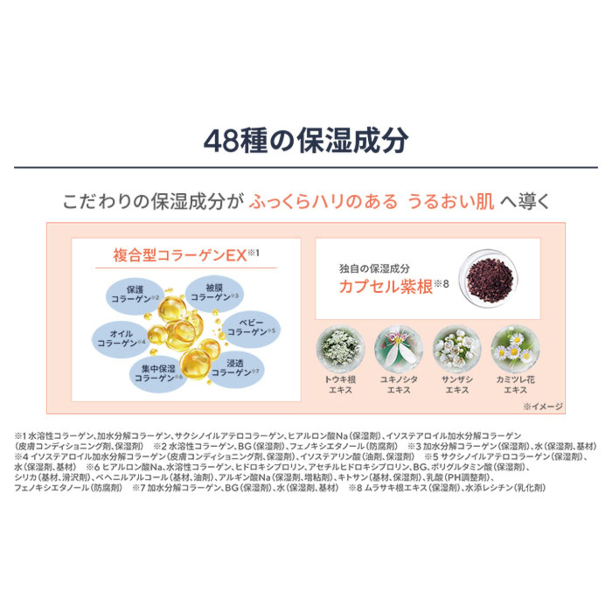 *2)水溶性コラーゲン、加水分解コラーゲン、サクシノイルアテロコラーゲン、ヒアルロン酸Na(保湿剤)、イソステアロイル加水分解コラーゲン(皮膚コンディショニング剤、保湿剤)