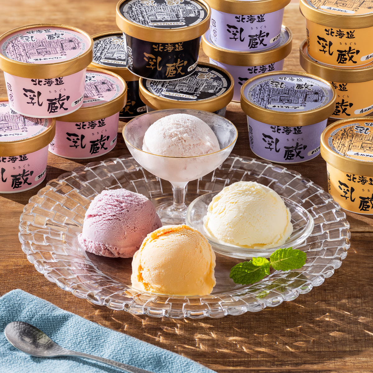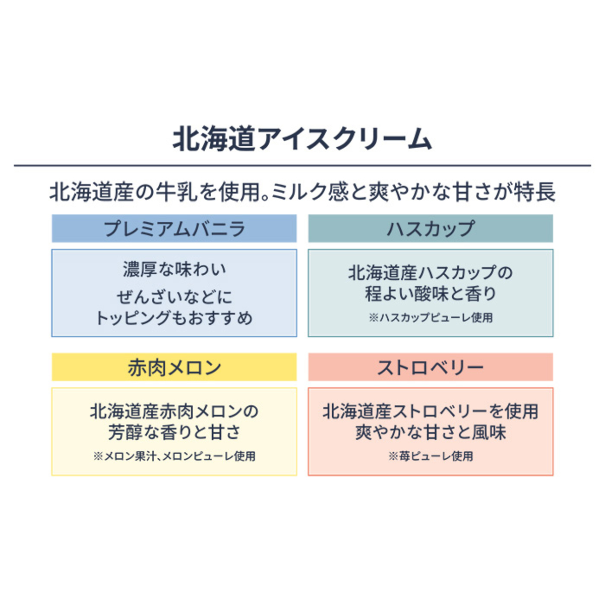 北海道の牛乳を使った、ミルク感と爽やかな甘さが楽しめる4種類のアイスクリームです。牛乳だけでなく、ストロベリー、ハスカップ、赤肉メロン*も北海道産を使用。プレミアムバニラ、ハスカップ、ストロベリー、赤肉メロンをセットにしました