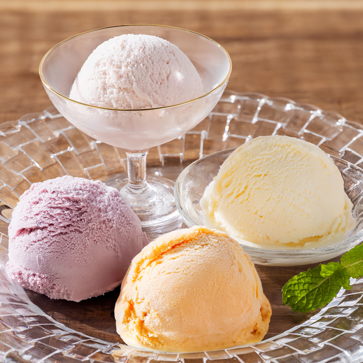 プレミアムバニラは濃厚な味わいで、ぜんざいなどのトッピングにもおすすめ。ハスカップはハスカップピューレを10%使用し、程よい酸味と香りに。ストロベリーは苺ピューレを30%加え、爽やかな甘さと風味です。赤肉メロン*は芳醇な香りと甘さが広がります