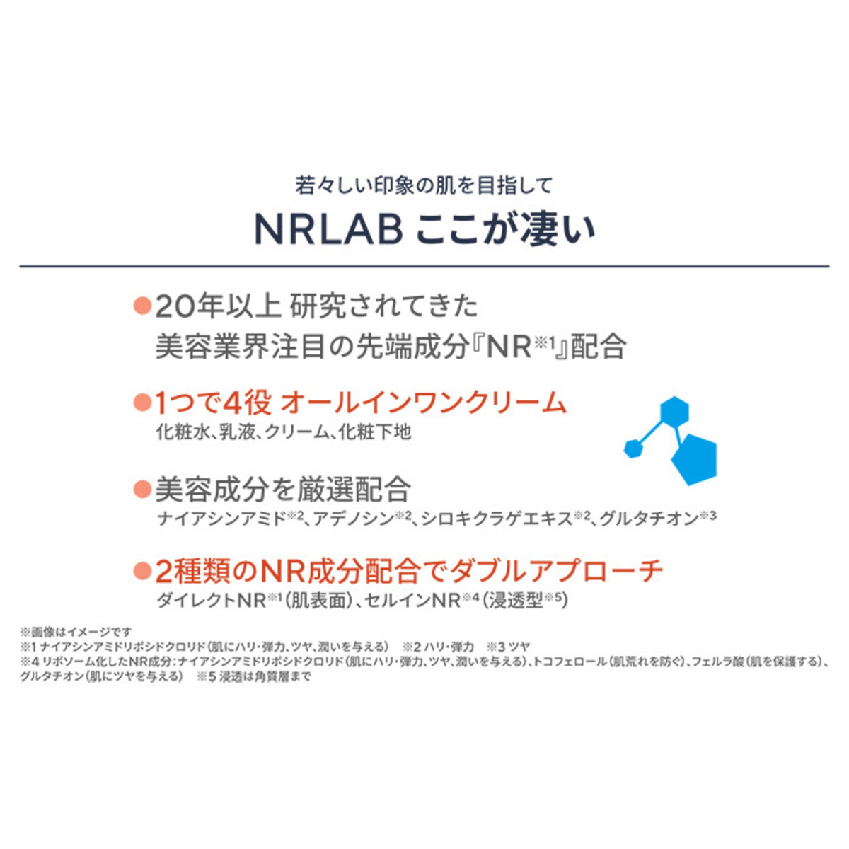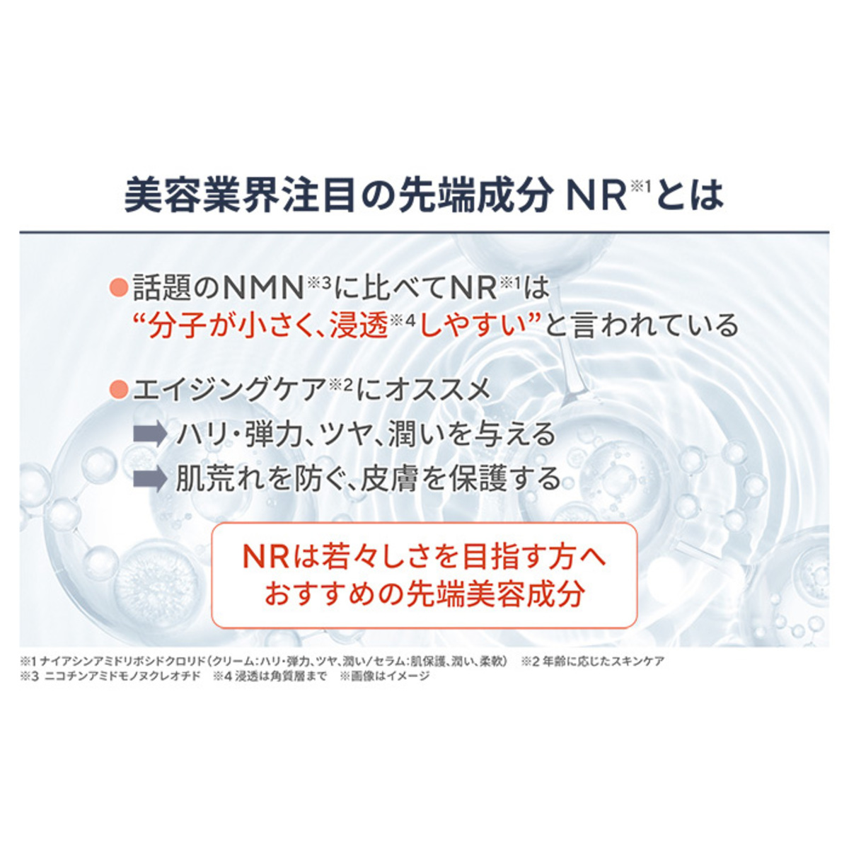 化粧水、乳液、クリーム、化粧下地がひとつになったクリーム。エイジングケア(年齢に応じたケア)を考え、NR(ナイアシンアミドリボシドクロリド*)を配合しています。お肌に薄くのばし、手のひらで顔全体を押さえ、マッサージするようになじませてください
