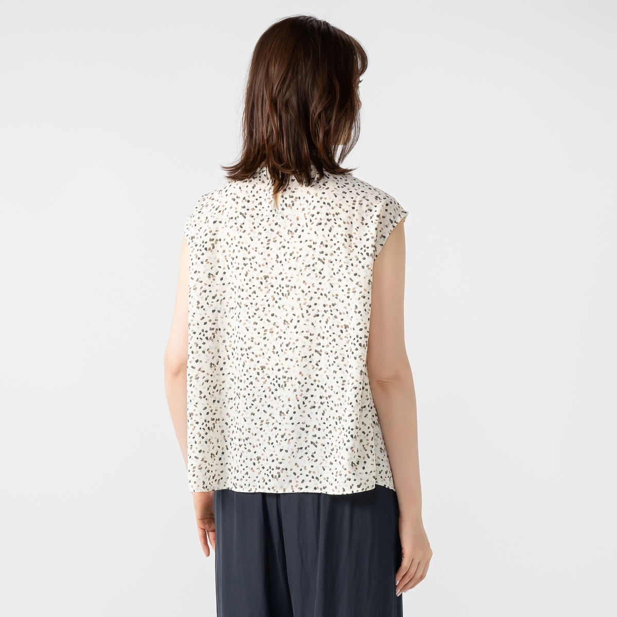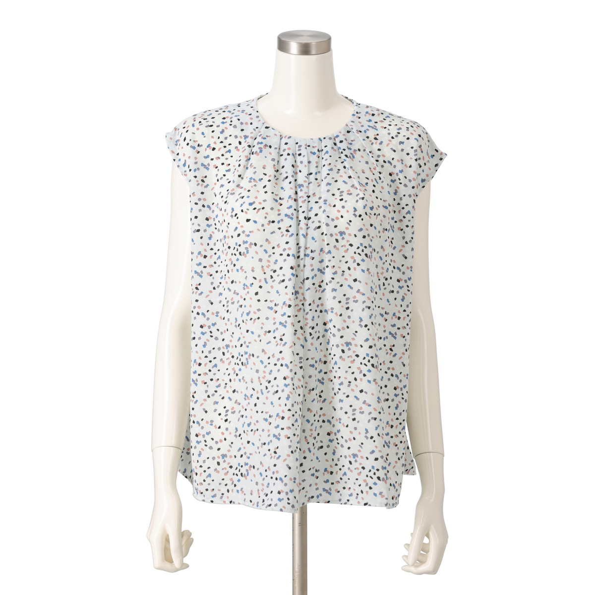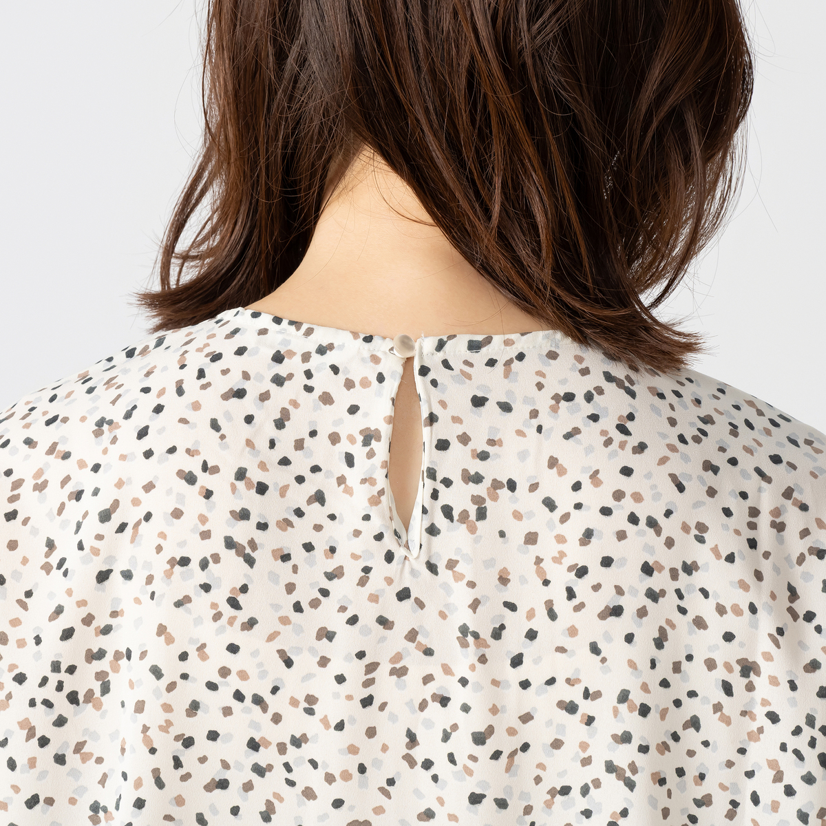 ベーシックなクルーネックにタックをあしらった、シンプルなブラウス。シャリ感のある涼し気な素材に、小石のような幾何柄が広がるデザイン。ジャケットやアウターにも合う着回ししやすい一枚です