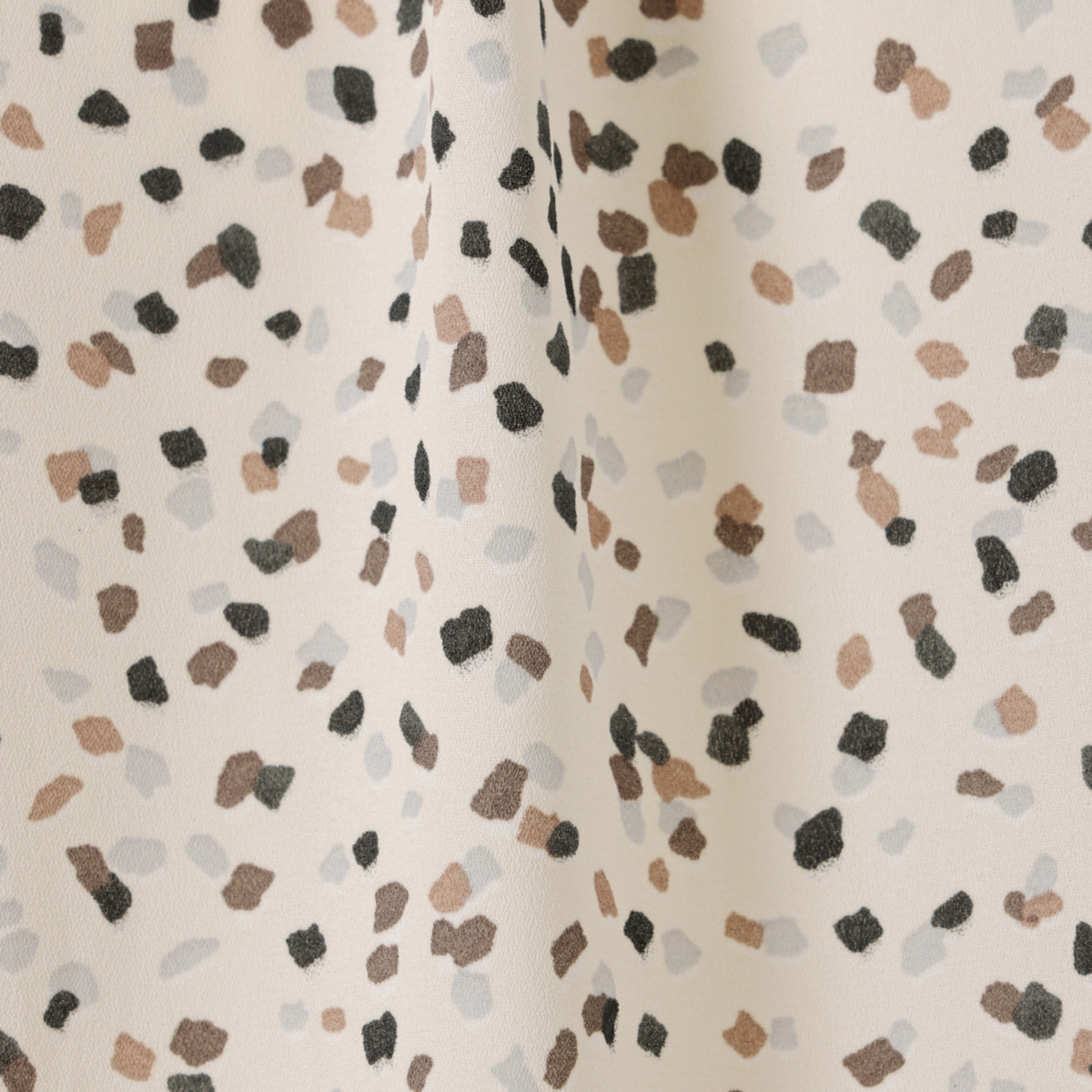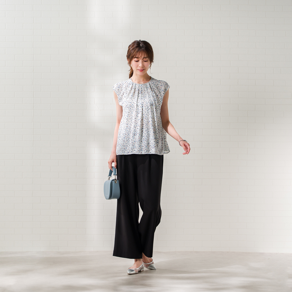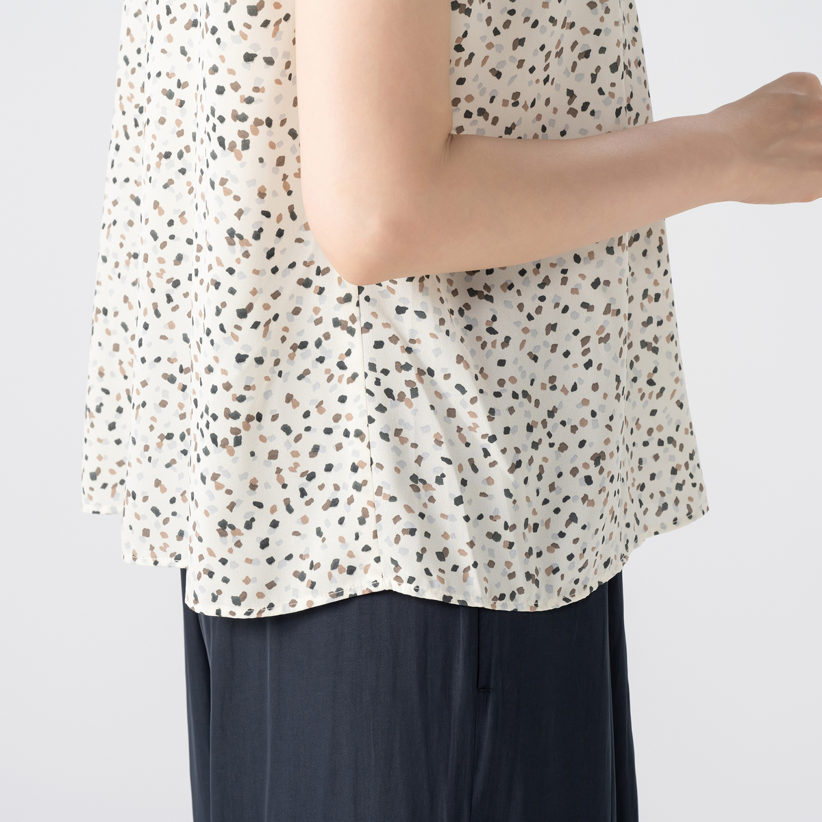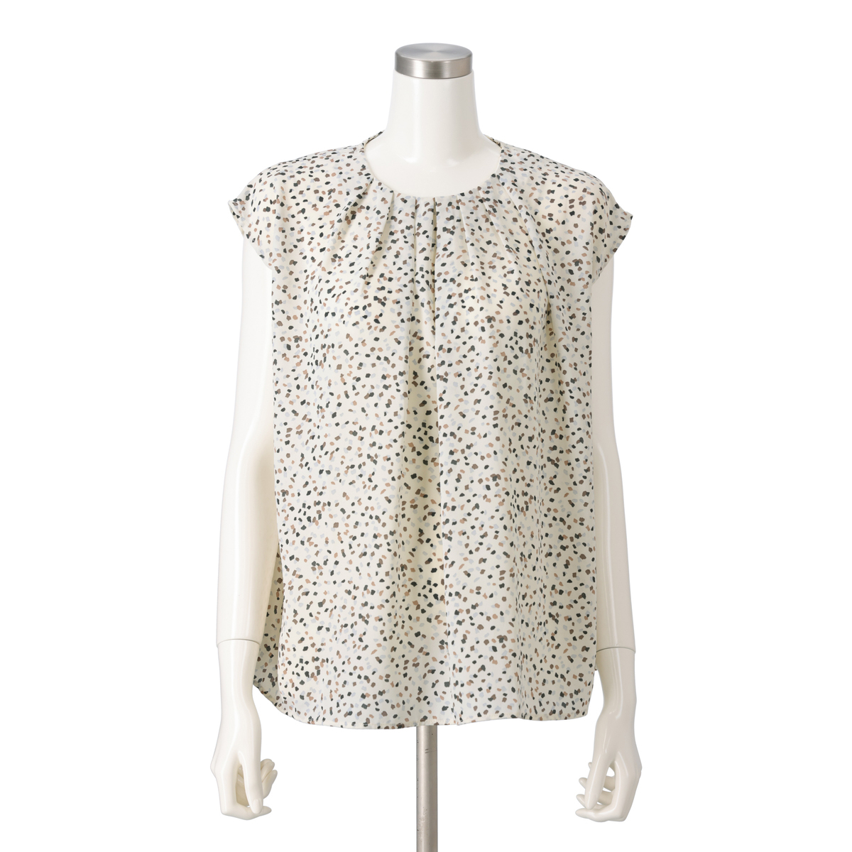ベーシックなクルーネックにタックをあしらった、シンプルなブラウス。シャリ感のある涼し気な素材に、小石のような幾何柄が広がるデザイン。ジャケットやアウターにも合う着回ししやすい一枚です