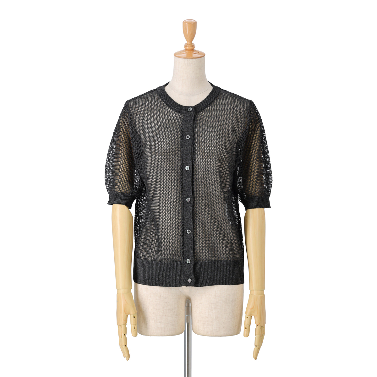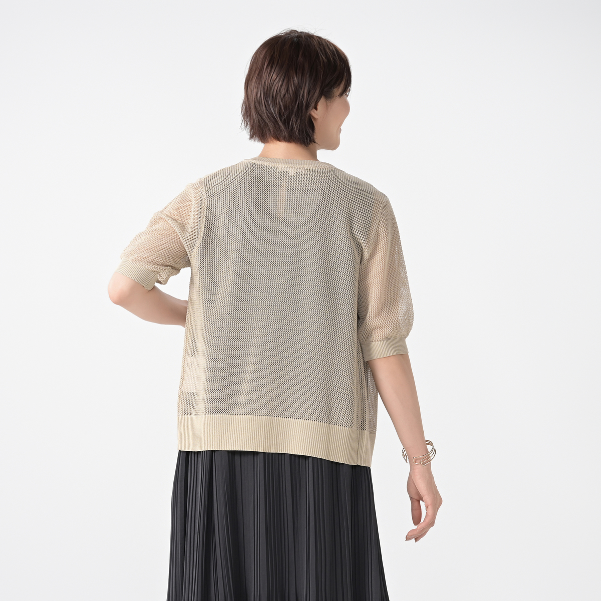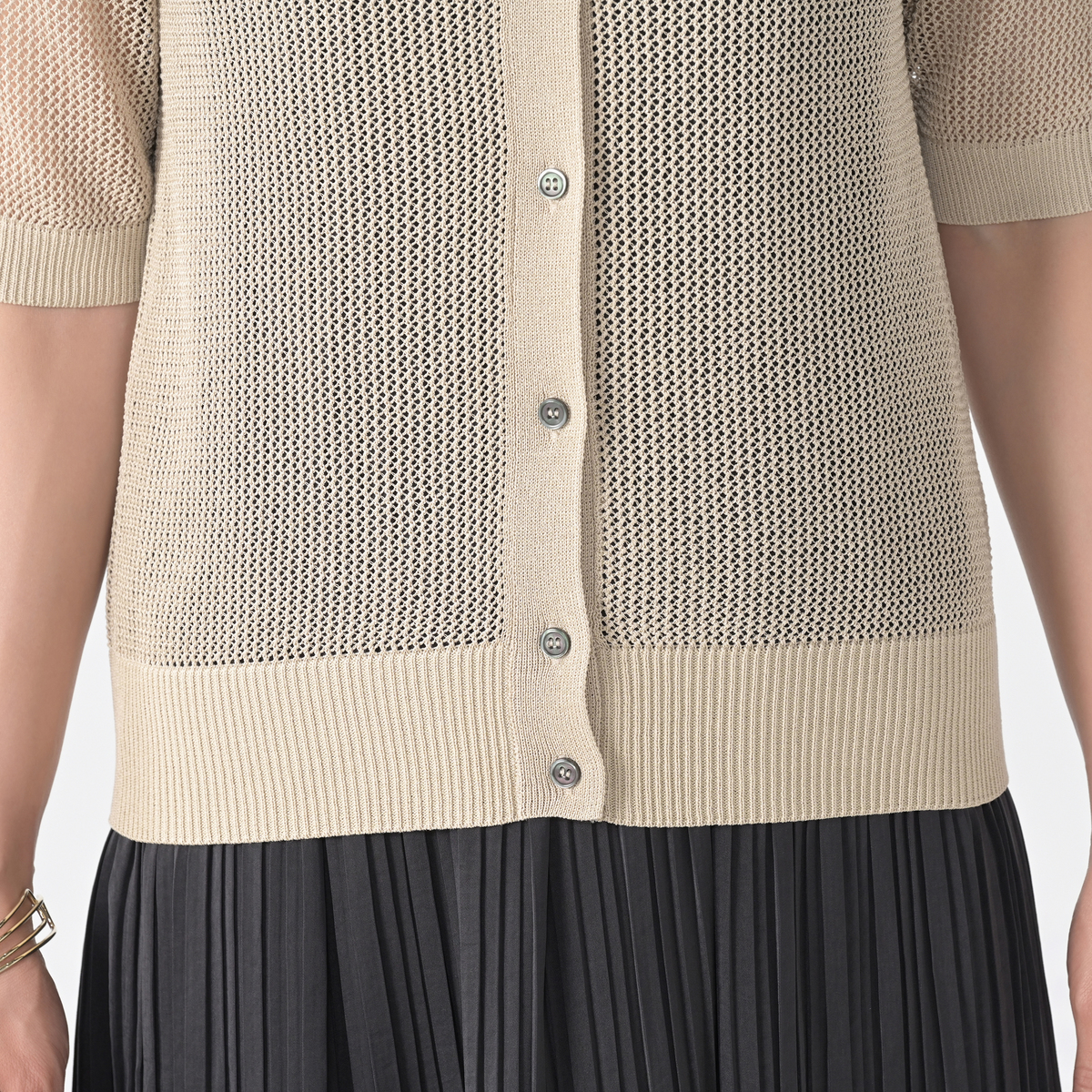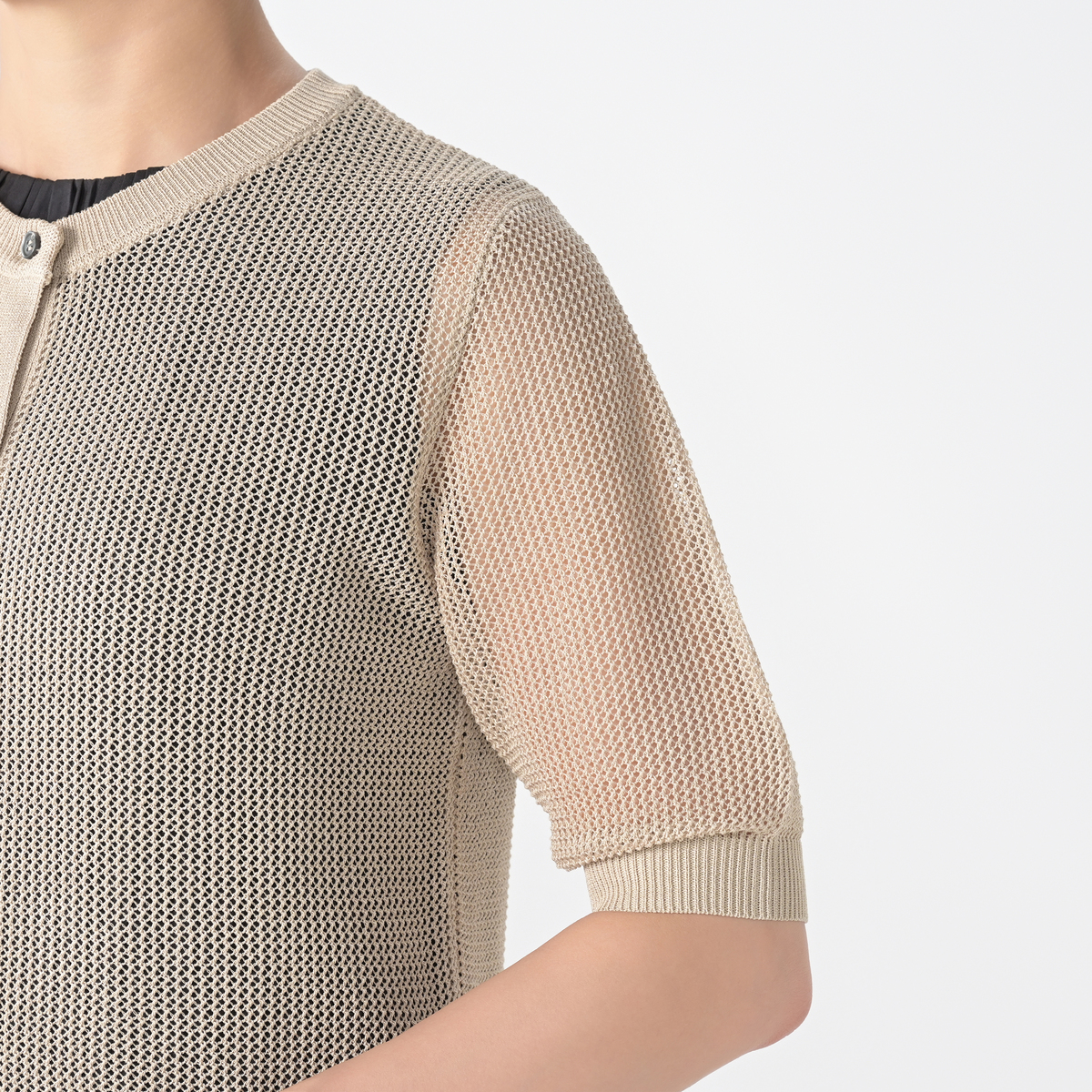 メッシュ素材で旬な表情を添える半袖カーディガン。微光沢感ある素材で編み立てました。さらさらタッチで涼し気な素材を使用しています