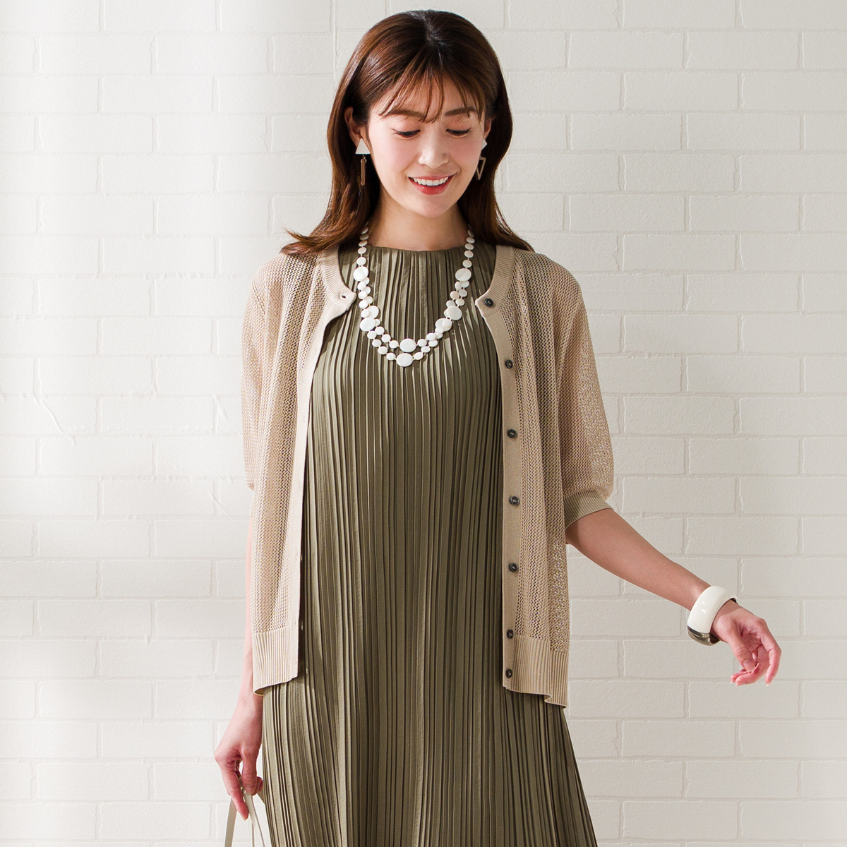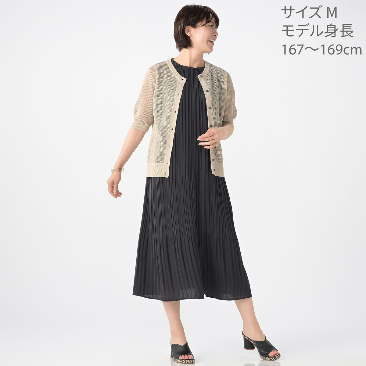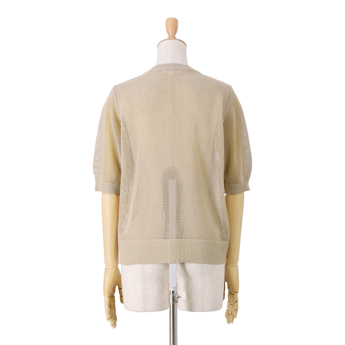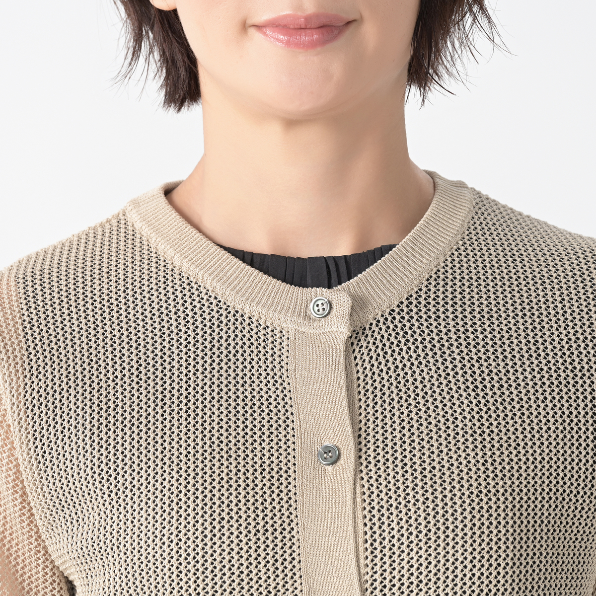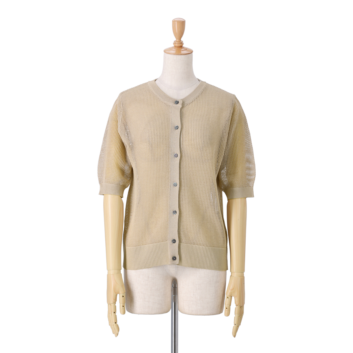 メッシュ素材で旬な表情を添える半袖カーディガン。微光沢感ある素材で編み立てました。さらさらタッチで涼し気な素材を使用しています