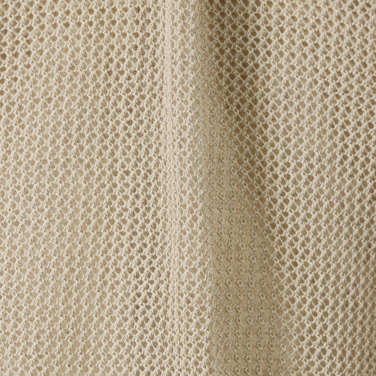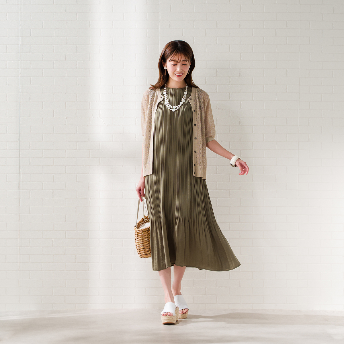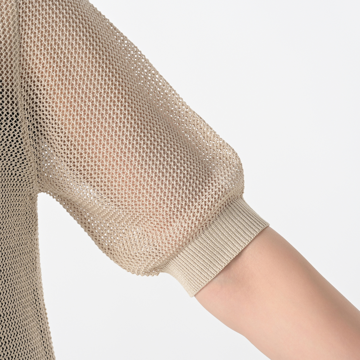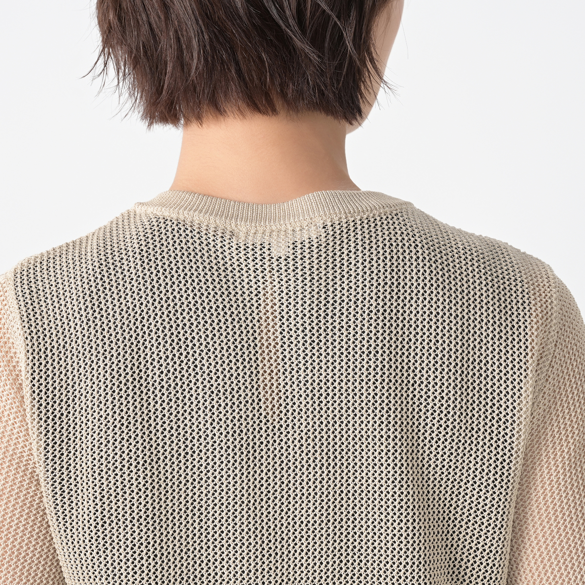 メッシュ素材で旬な表情を添える半袖カーディガン。微光沢感ある素材で編み立てました。さらさらタッチで涼し気な素材を使用しています