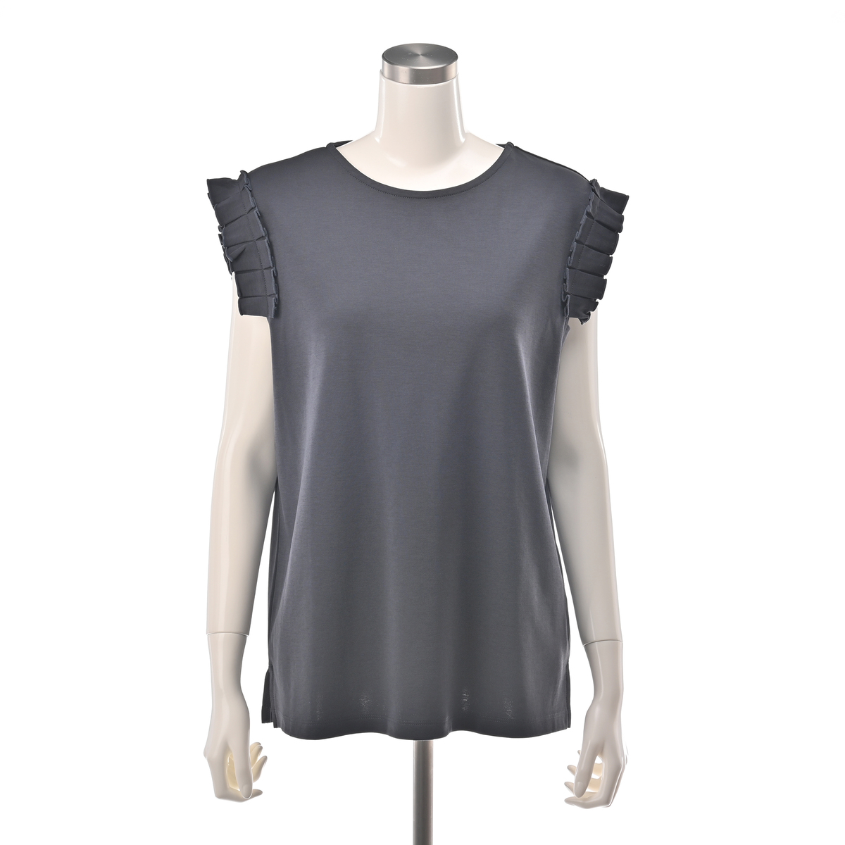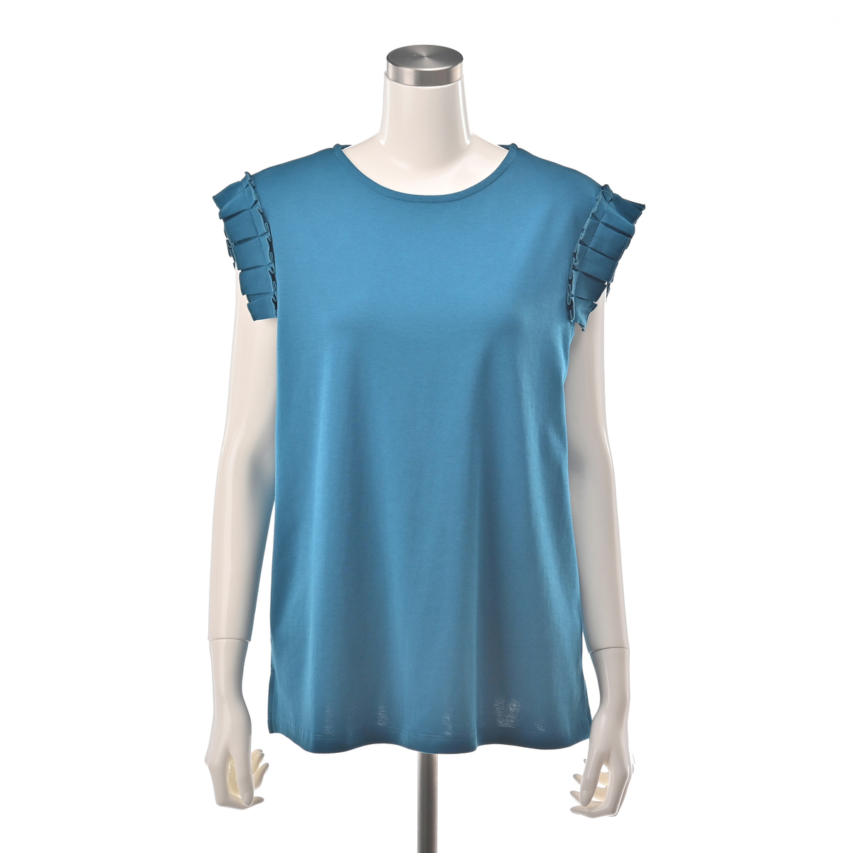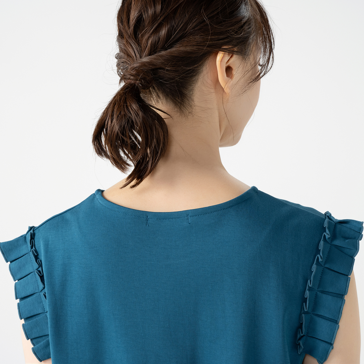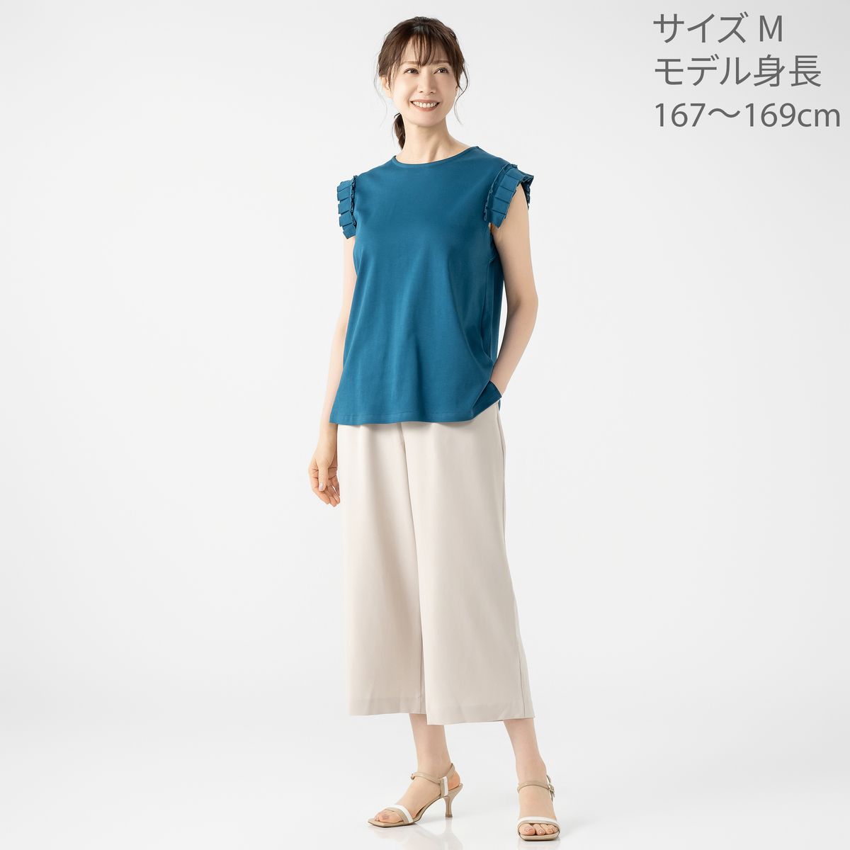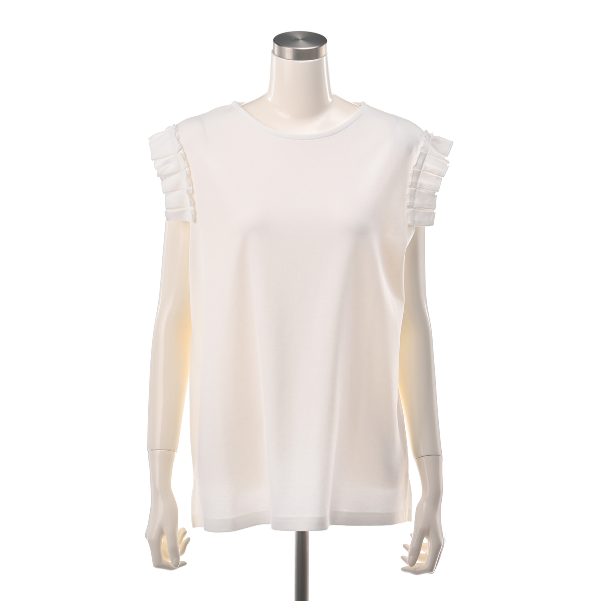 肩のタックを使ったフリルが上品なプルオーバーです。細番手の糸で編み上げた、さらっとした肌触りの素材を使用。綿100%なので通気性もあります