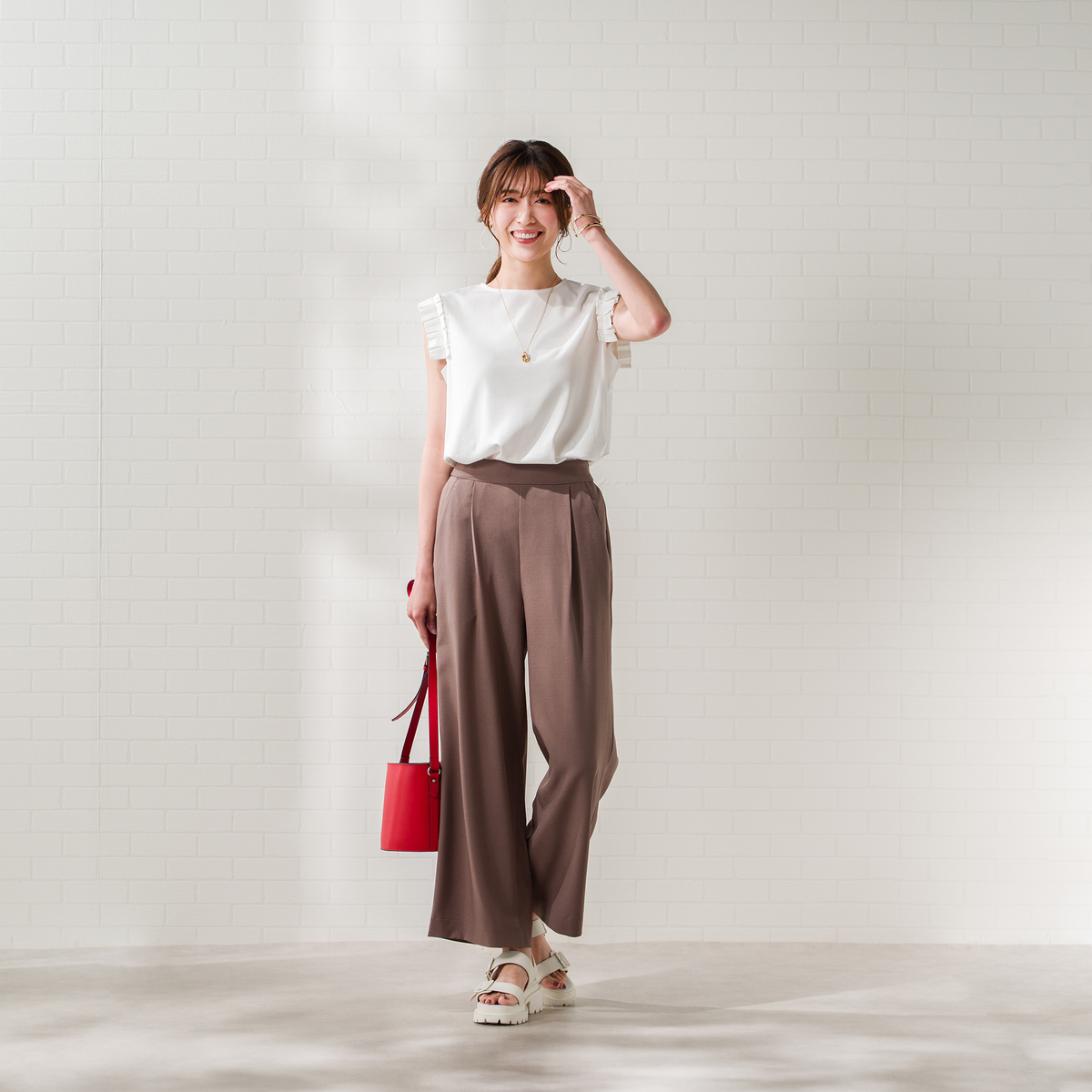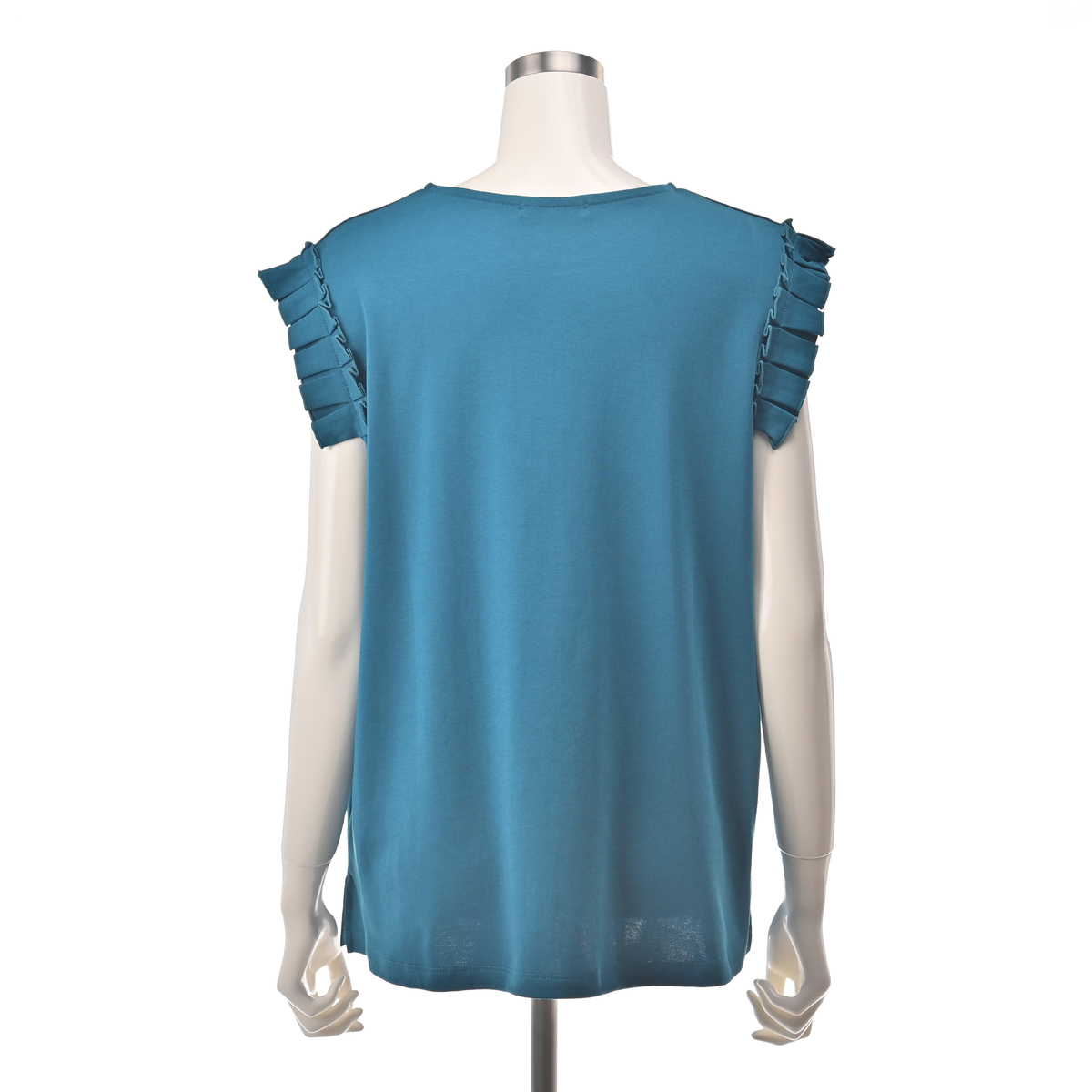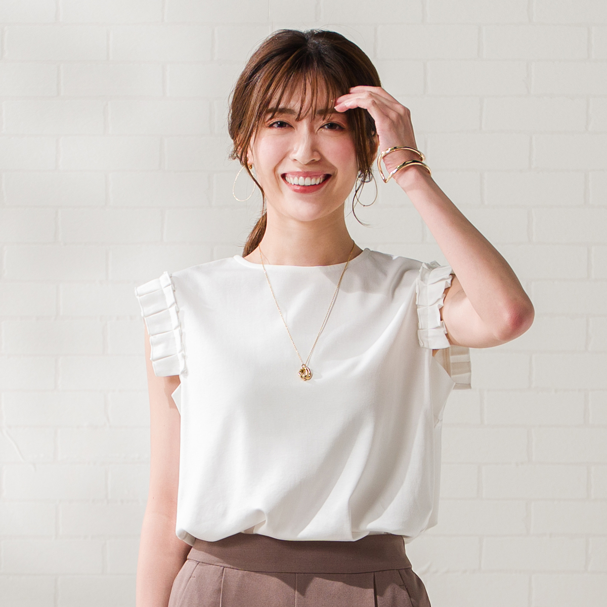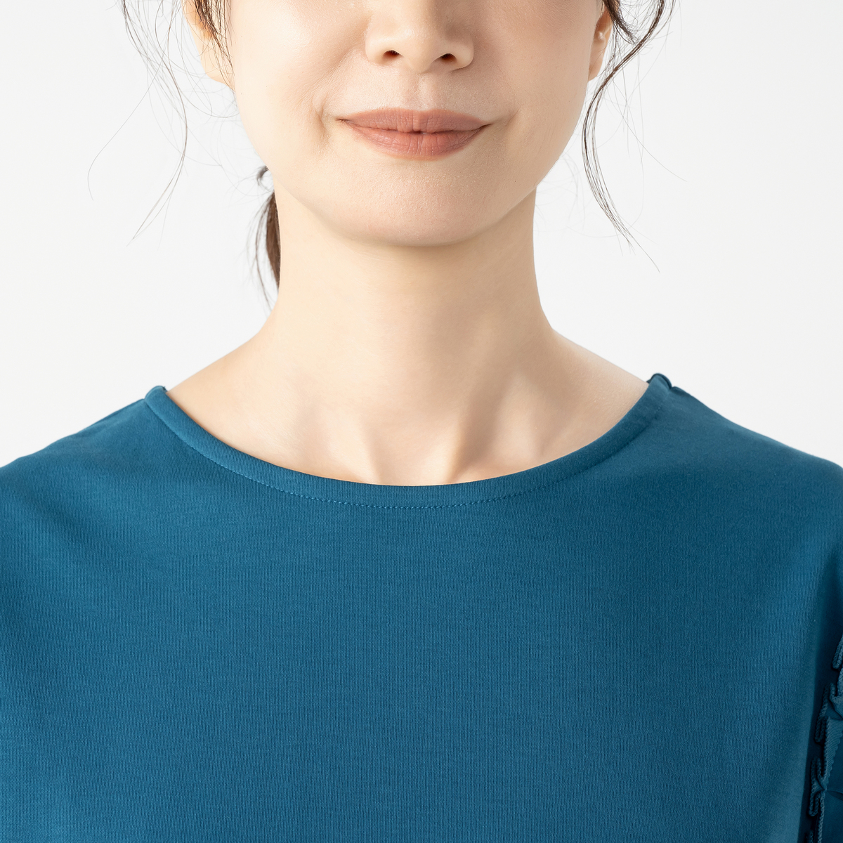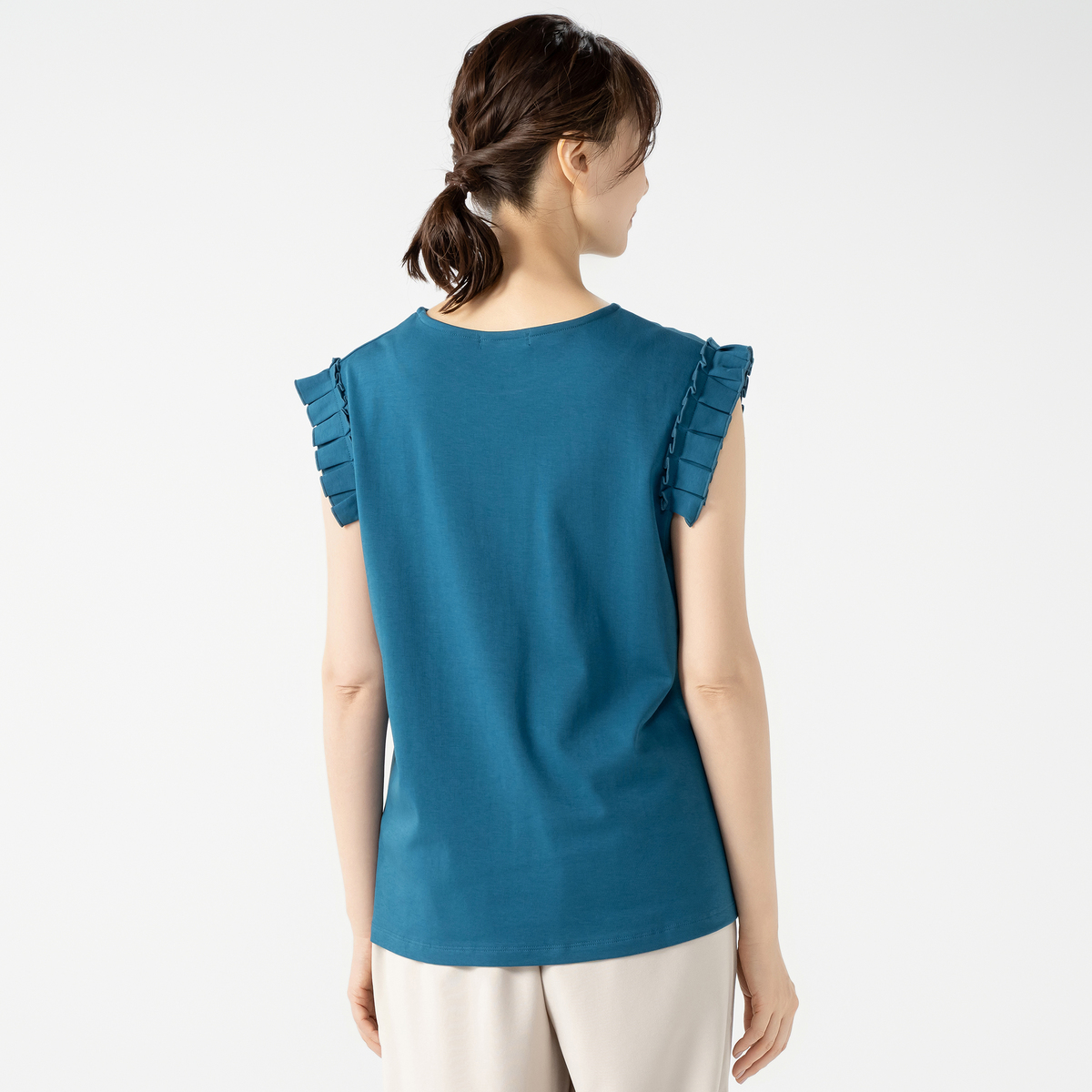 肩のタックを使ったフリルが上品なプルオーバーです。細番手の糸で編み上げた、さらっとした肌触りの素材を使用。綿100%なので通気性もあります