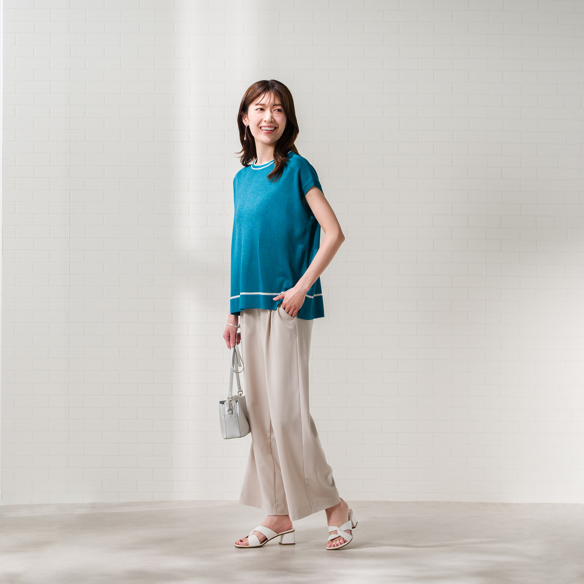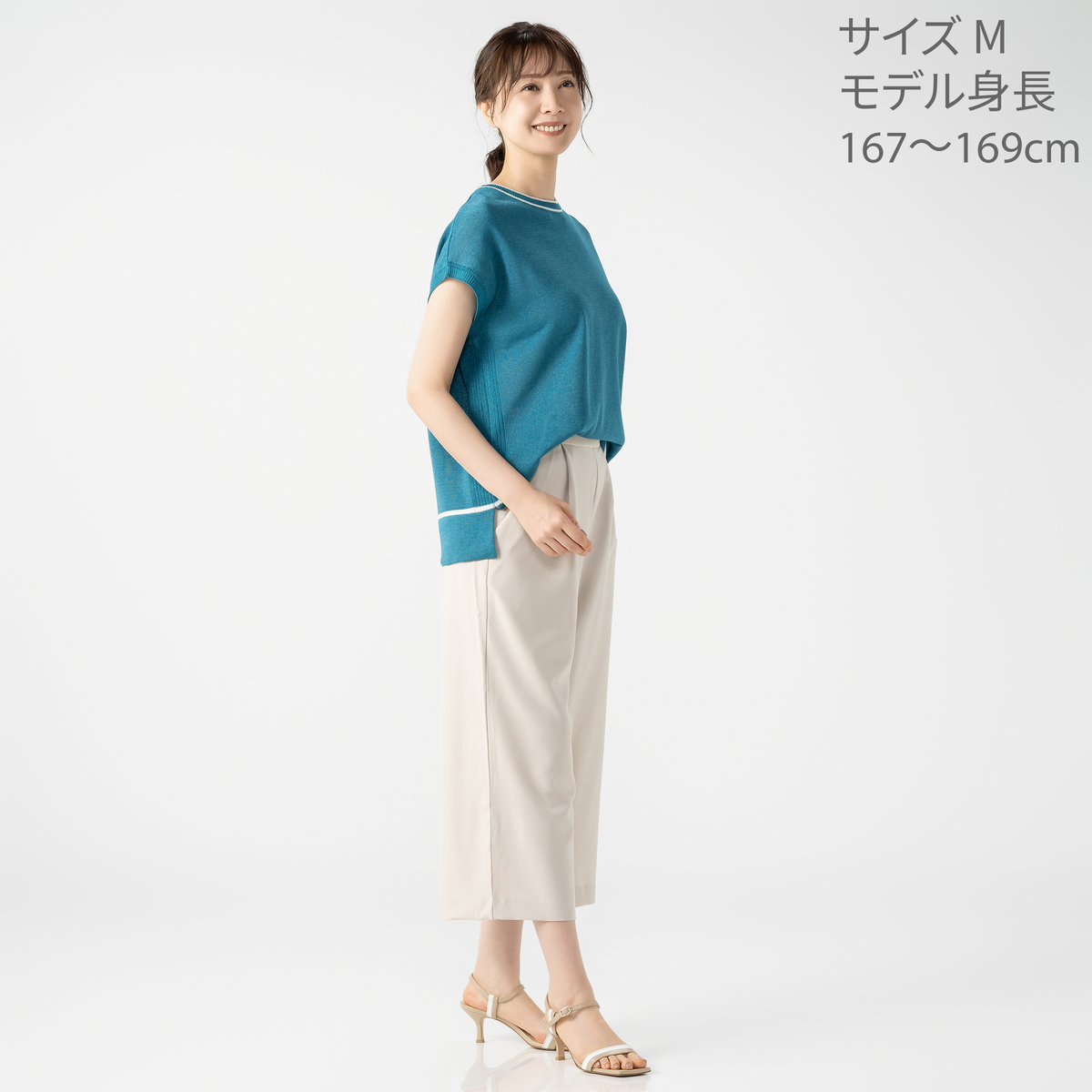 ゆったりとしたシルエットで身体のラインを拾いにくく、袖は二の腕をカバーするフレンチスリーブに。サラッとタッチの涼し気な素材を使用しています