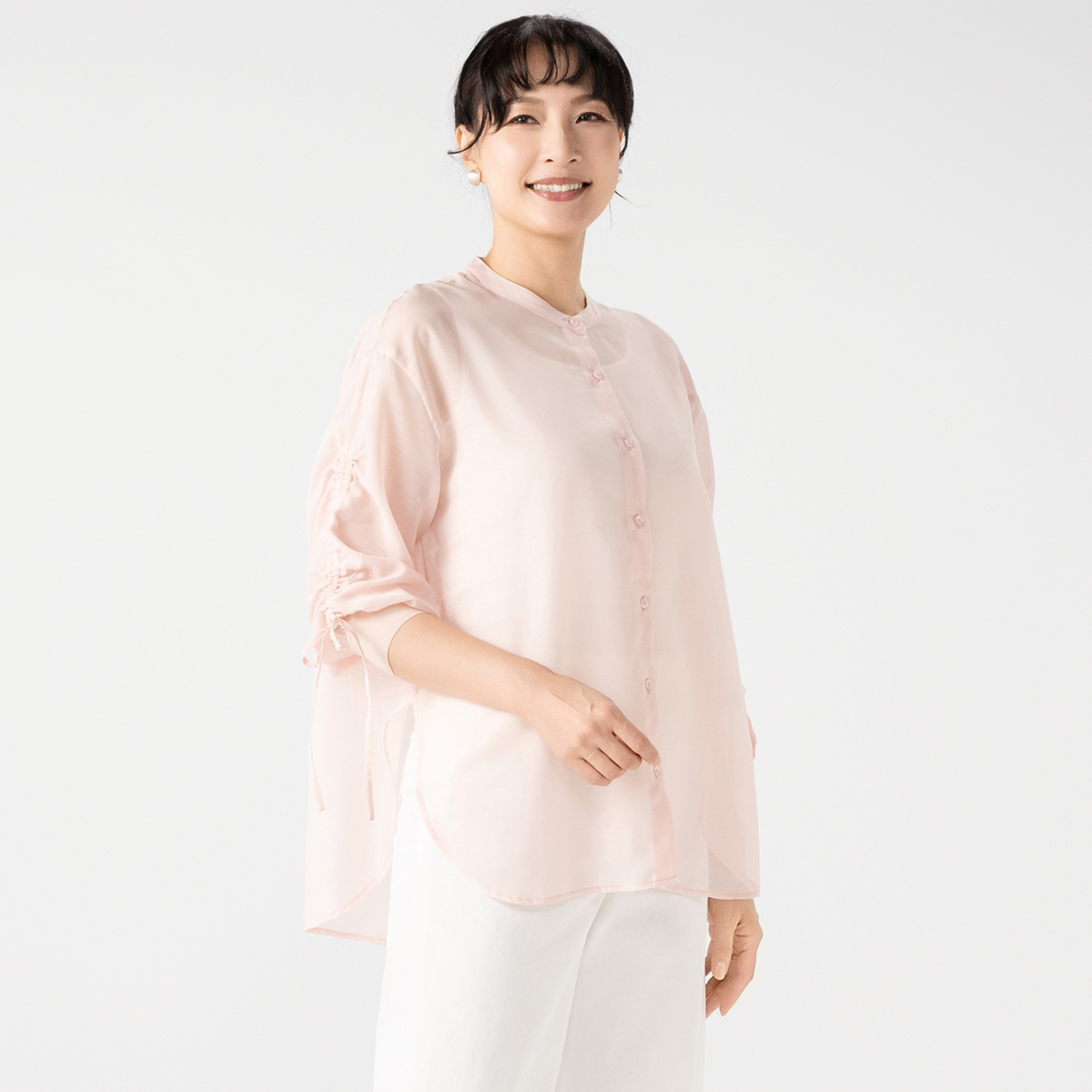 シャリ感のあるシアー素材を使い、シャツとしてもカーディガンとしても着用可能。肌離れが良く、さまざまなコーディネートに取り入れやすい一枚です