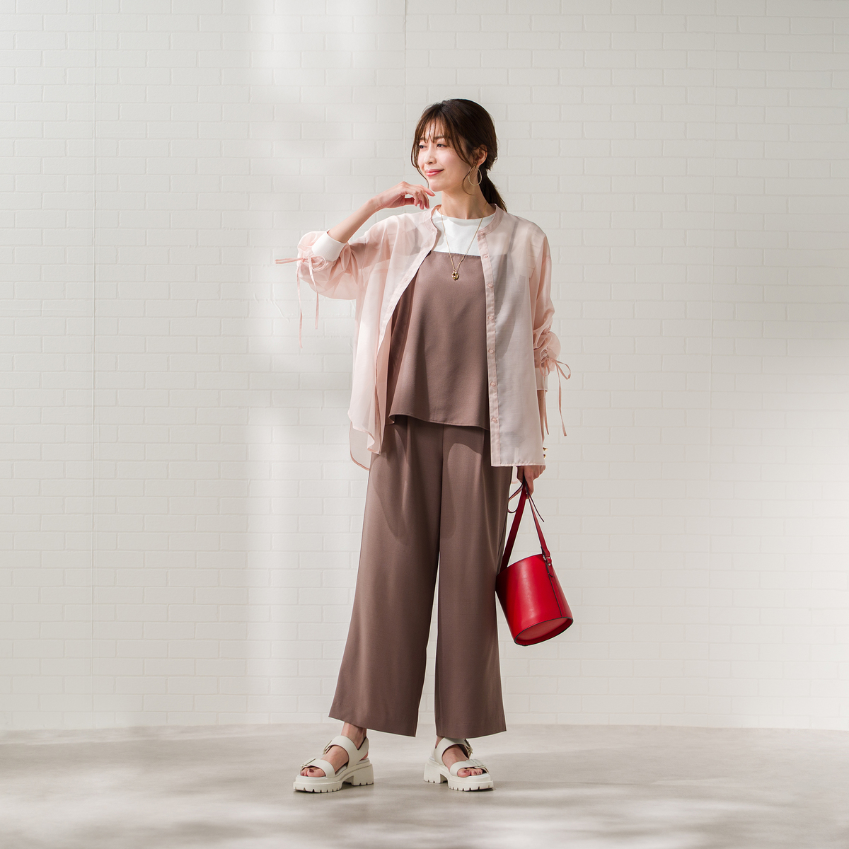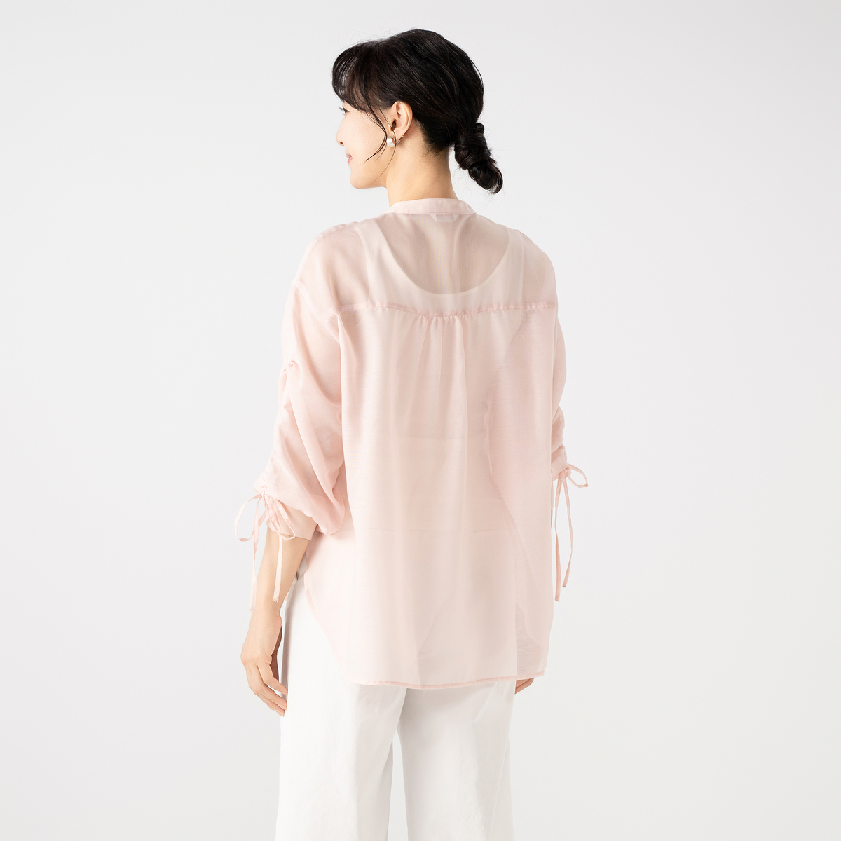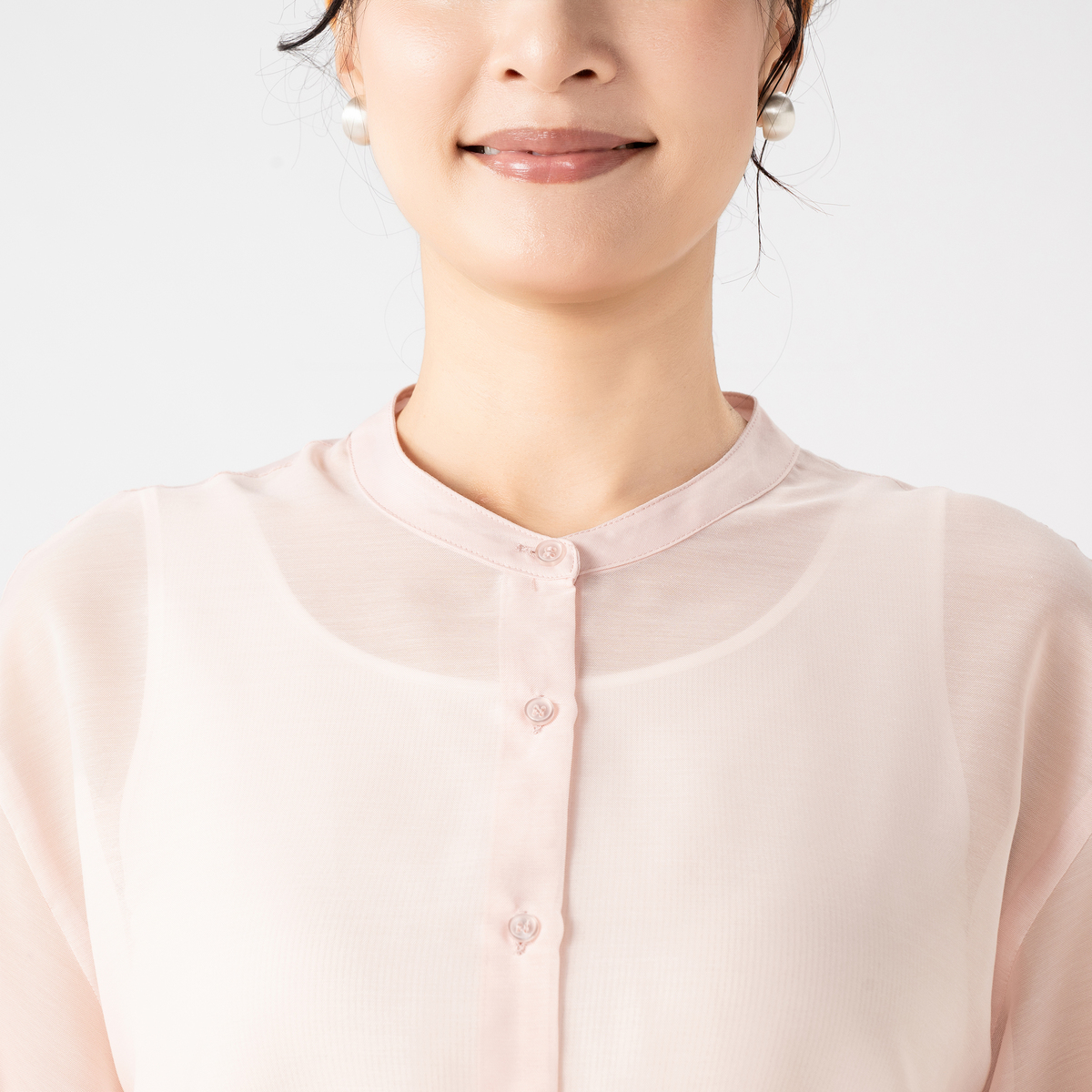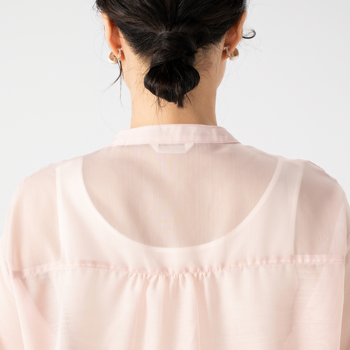 シャリ感のあるシアー素材を使い、シャツとしてもカーディガンとしても着用可能。肌離れが良く、さまざまなコーディネートに取り入れやすい一枚です