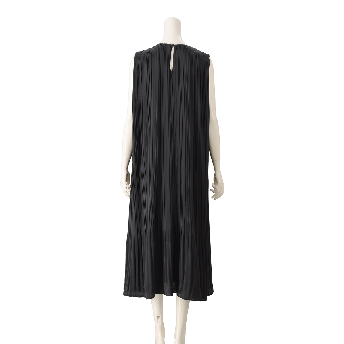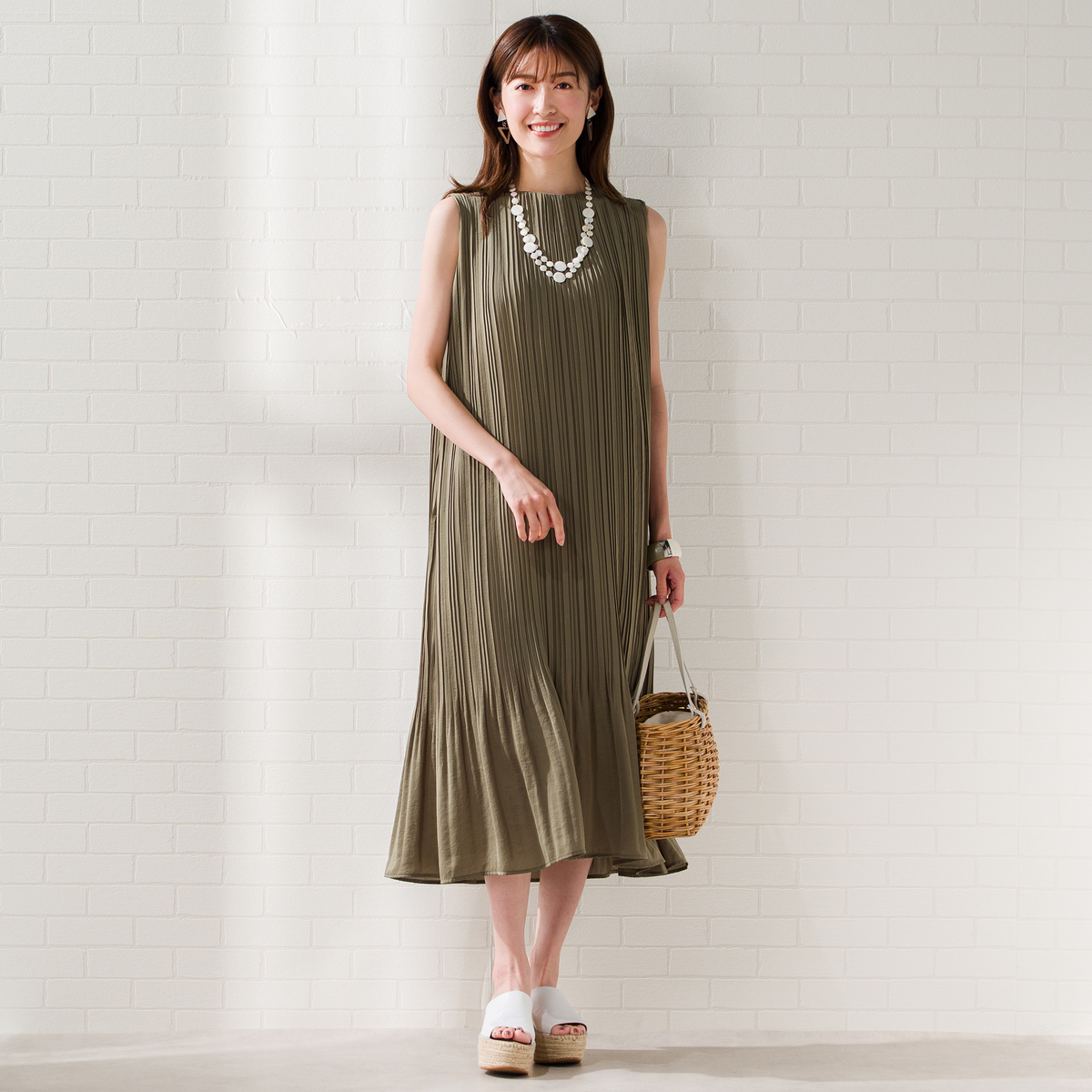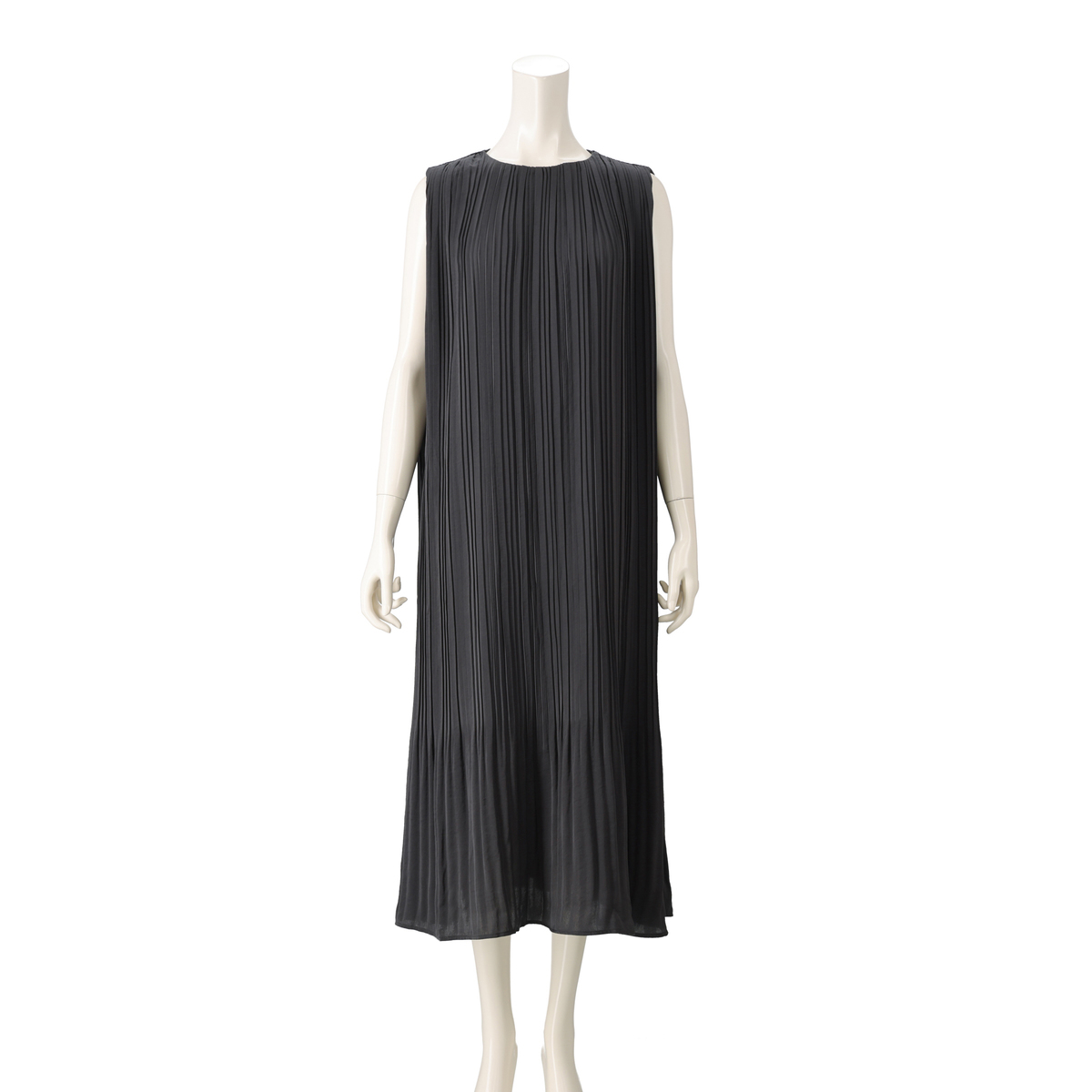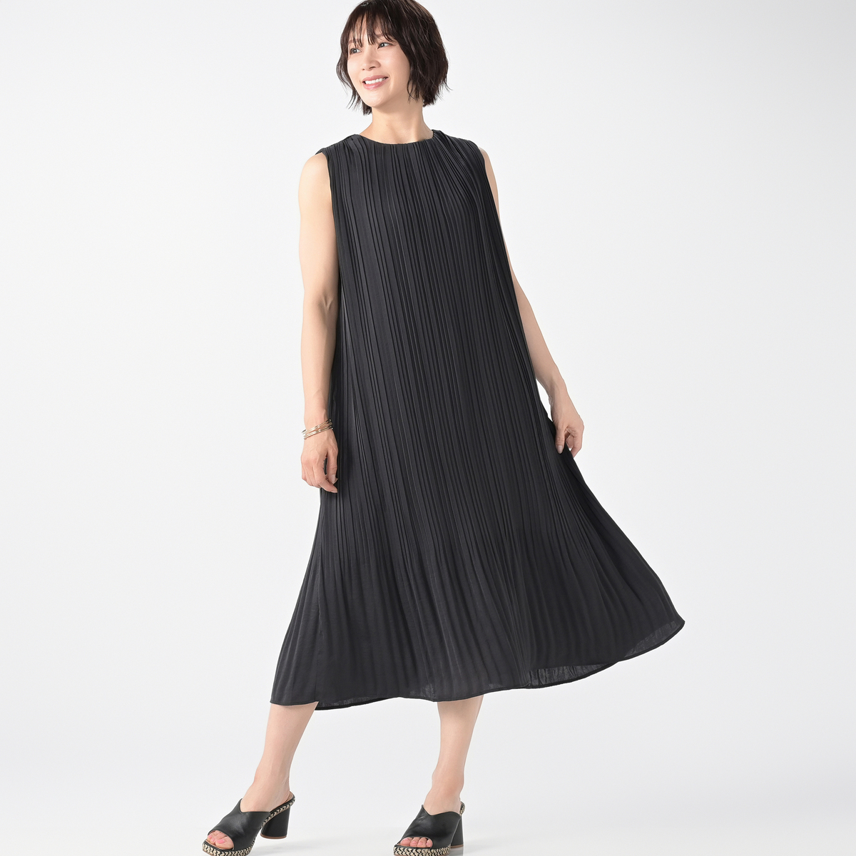 繊細なプリーツがかかったワンピース。プリーツが生み出す縦ラインがすっきりとしたシルエットを描き、動くたびキレイになびいてエレガントな表情を見せてくれます