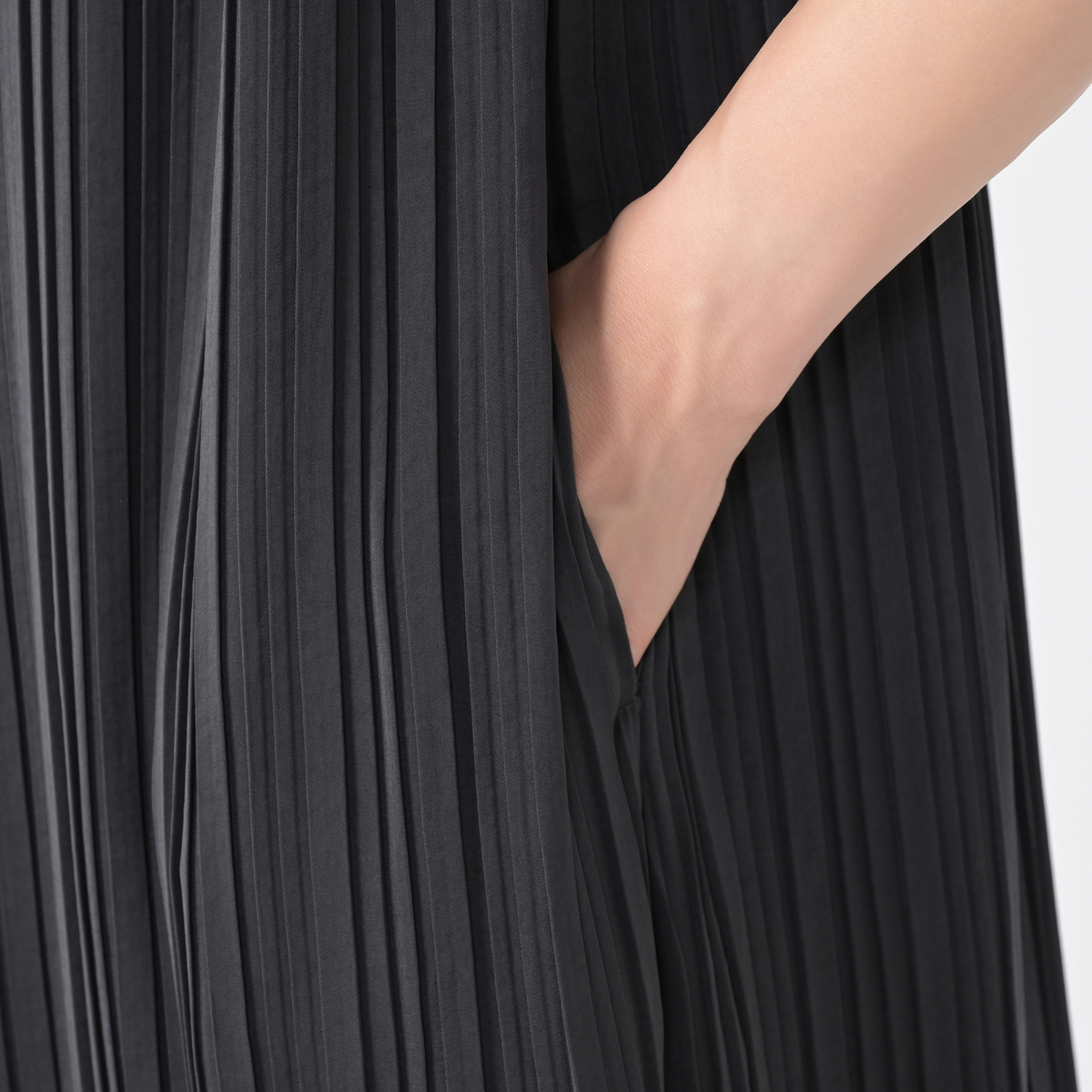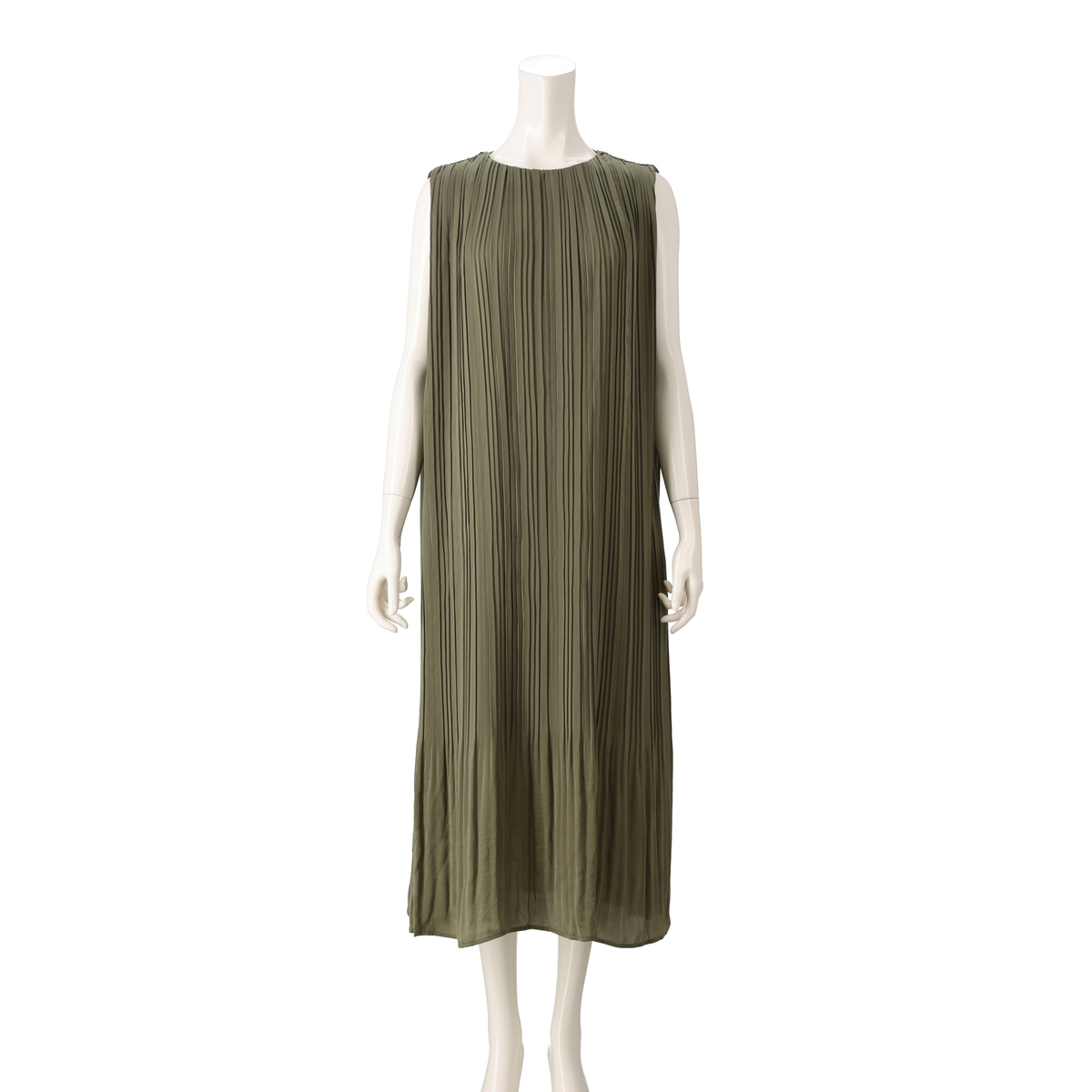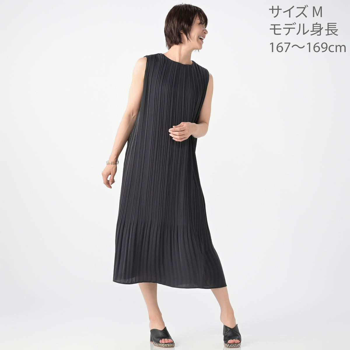 繊細なプリーツがかかったワンピース。プリーツが生み出す縦ラインがすっきりとしたシルエットを描き、動くたびキレイになびいてエレガントな表情を見せてくれます