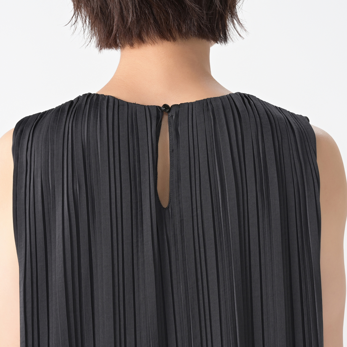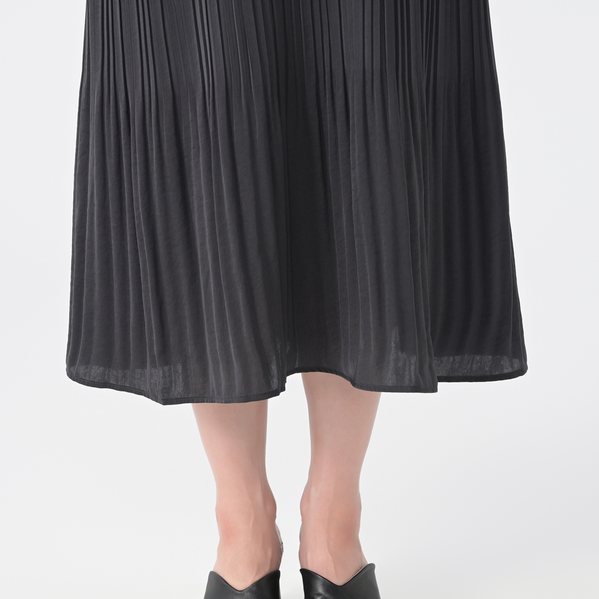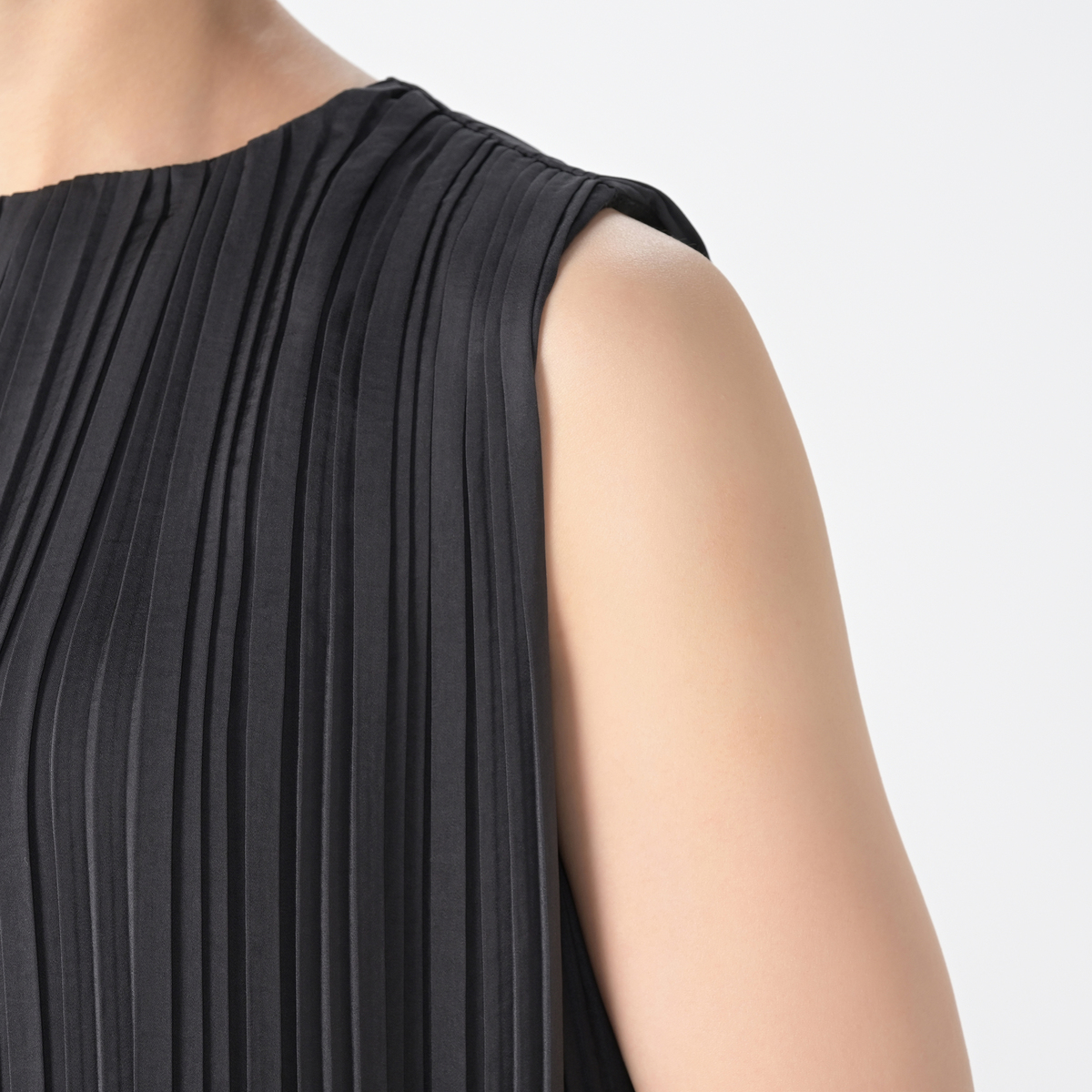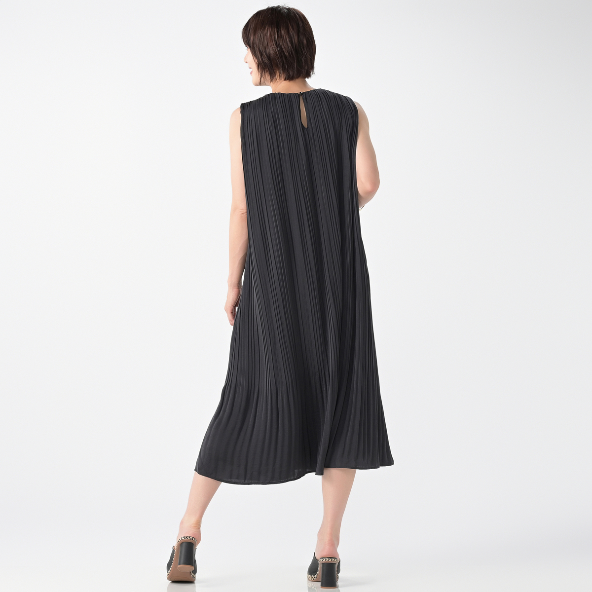 繊細なプリーツがかかったワンピース。プリーツが生み出す縦ラインがすっきりとしたシルエットを描き、動くたびキレイになびいてエレガントな表情を見せてくれます