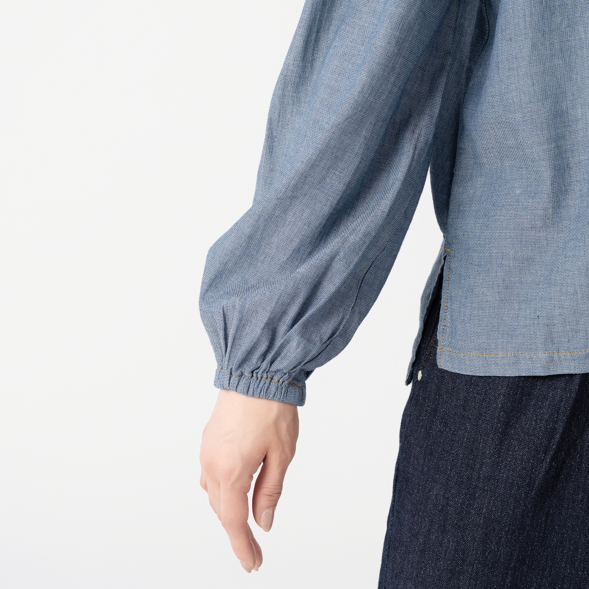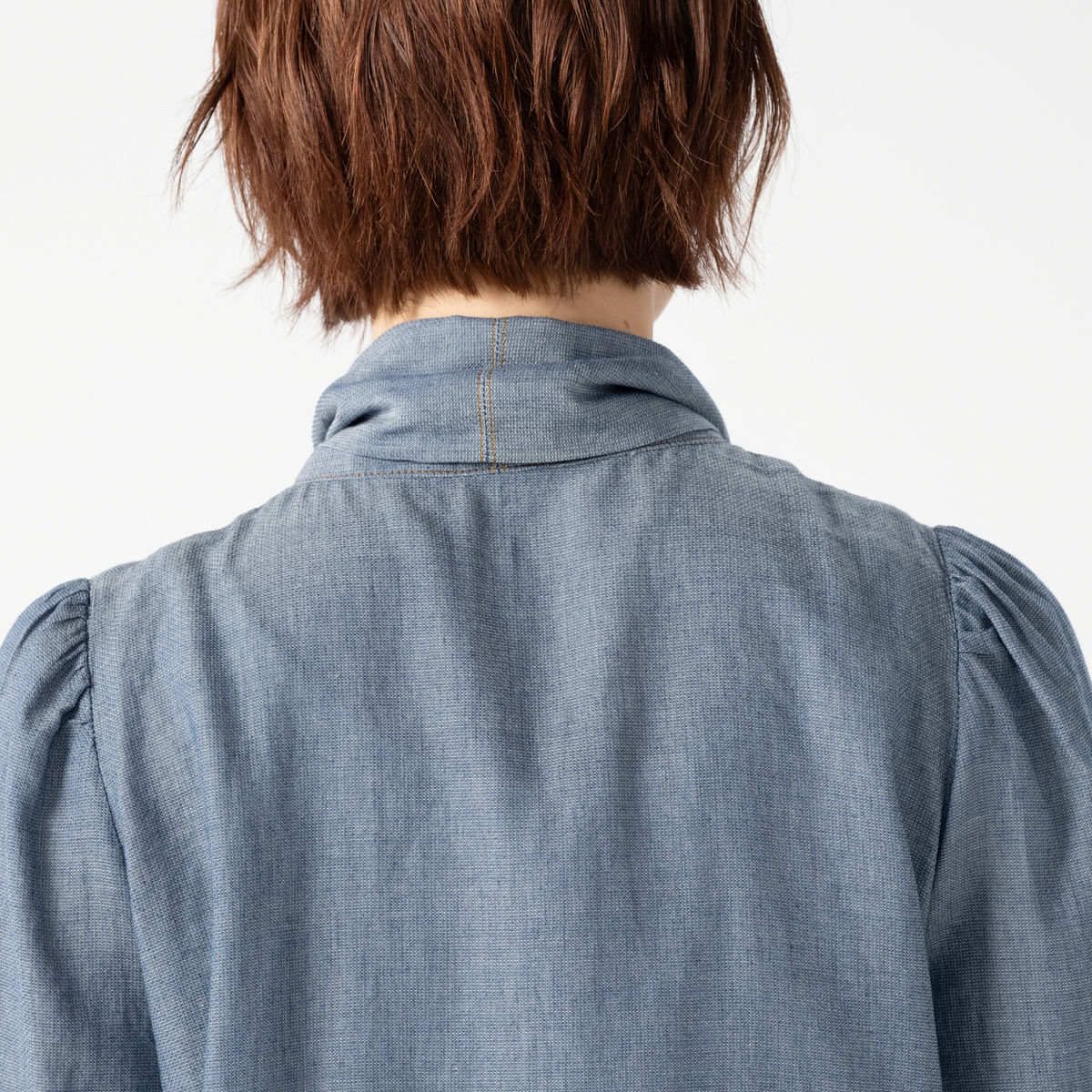 ライトオンスのドビーデニム生地でお作りしたブラウス。たっぷりとギャザーを寄せたパフスリーブと、フロントのビッグリボンがフェミニンで、前中心のオリジナルの金色ボタンが高級感を醸し出しています。両脇はスリット入りで、後ろ丈は少し長く設定しました