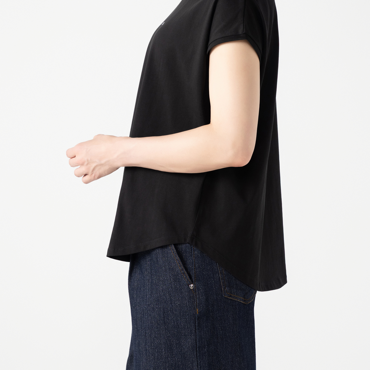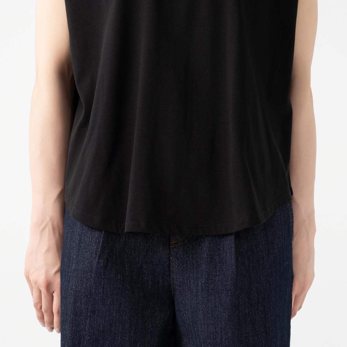 接触冷感の機能性や、抗菌防臭加工を施した素材を使用しました。少し長めの着丈がヒップトップを隠してスタイルアップの効果も期待できます