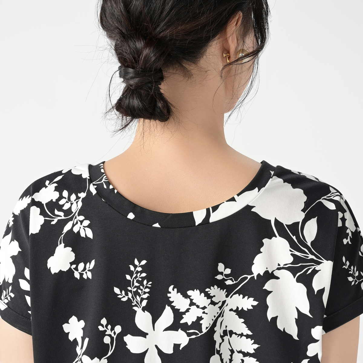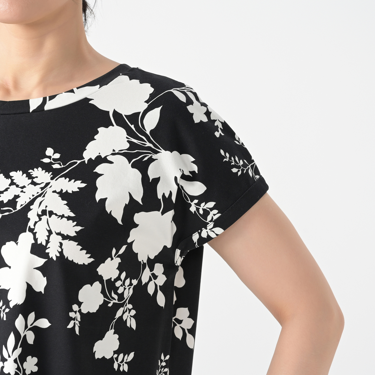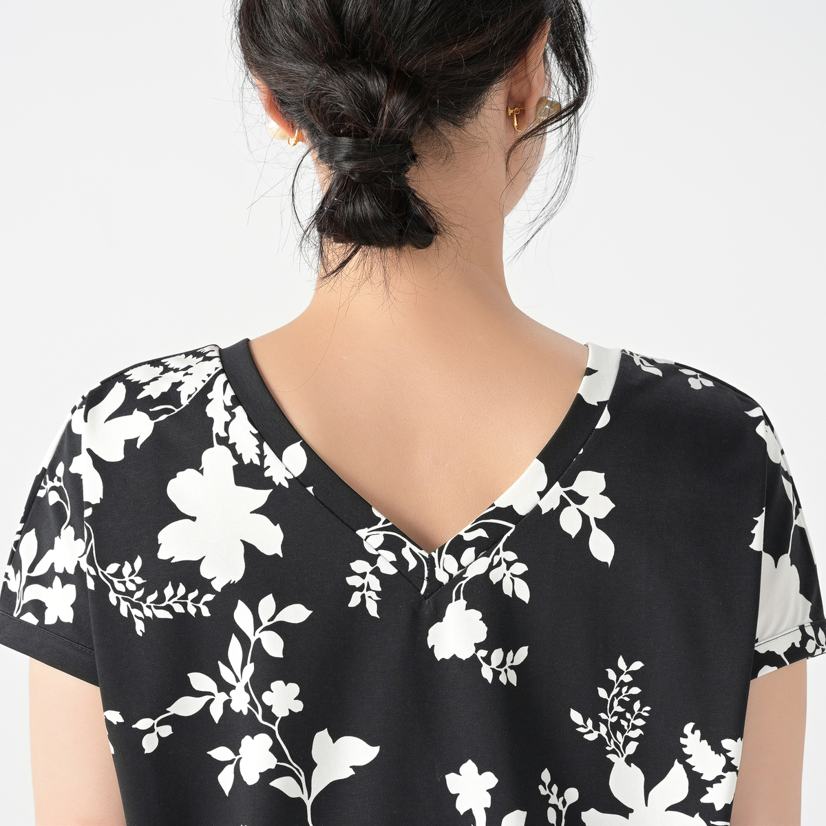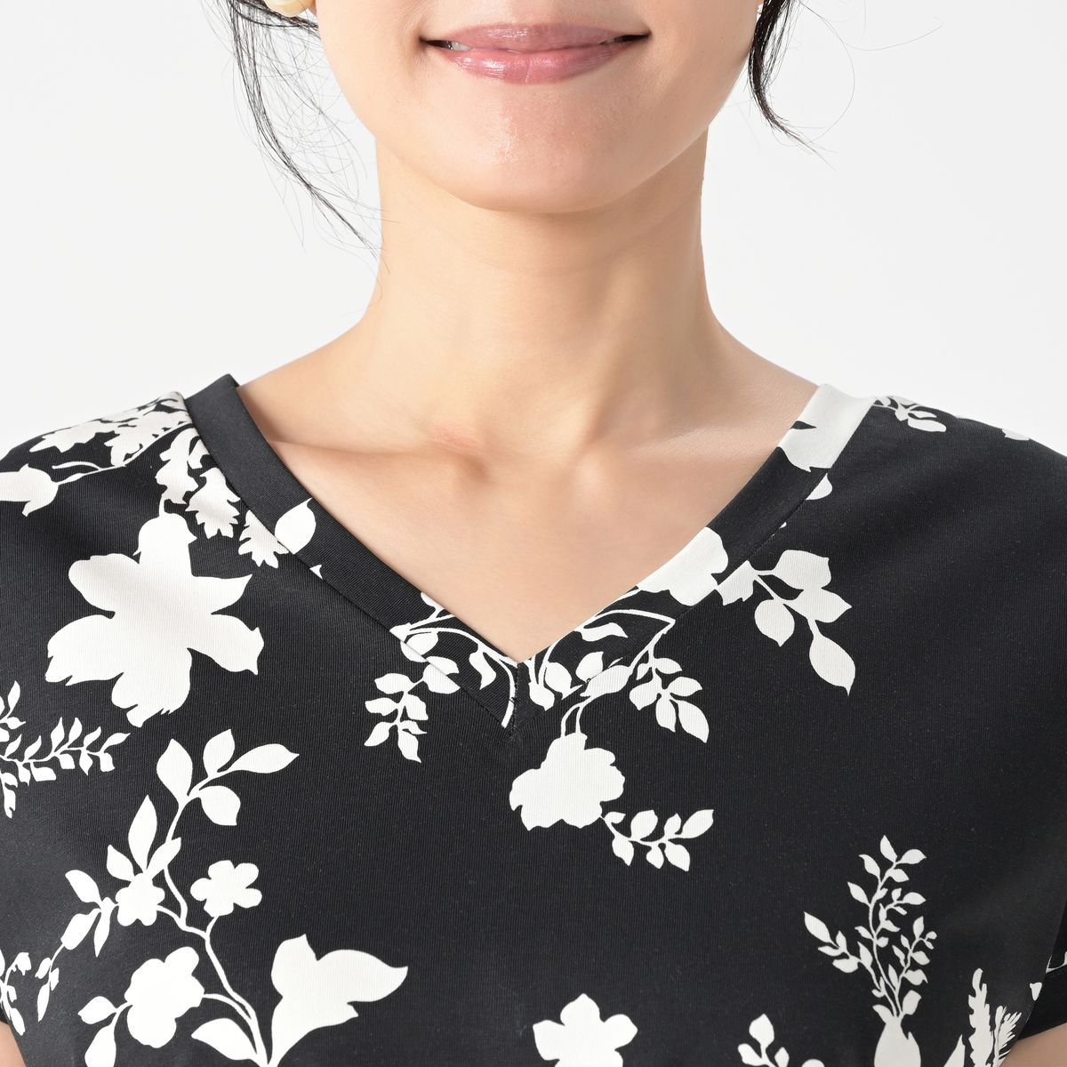 二の腕を隠す嬉しいフレンチスリーブは、長すぎない丈感もポイントに。ソロテックスの一部には植物由来原料を使用。さらにUVカット素材を使用しています