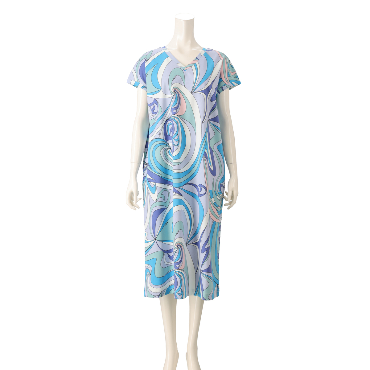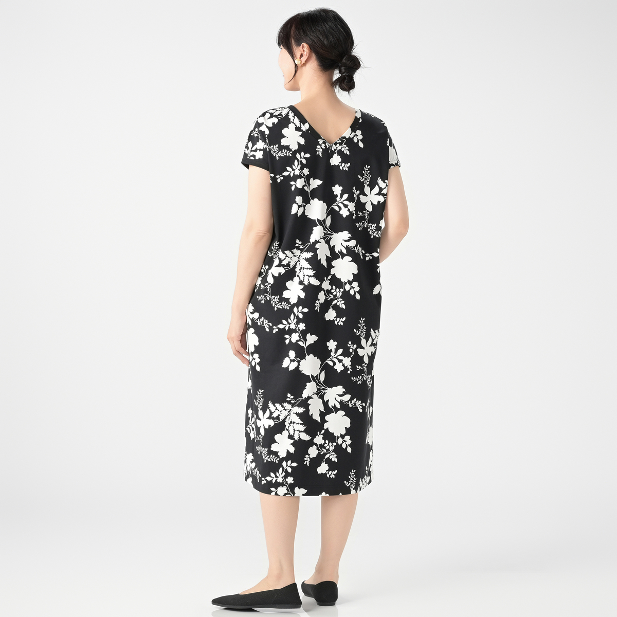 前後2WAYで着用できるワンピース。フロントはVネックライン、後ろ衿ぐりは深めのラウンドネックラインで、お好みで衿元を楽しめます