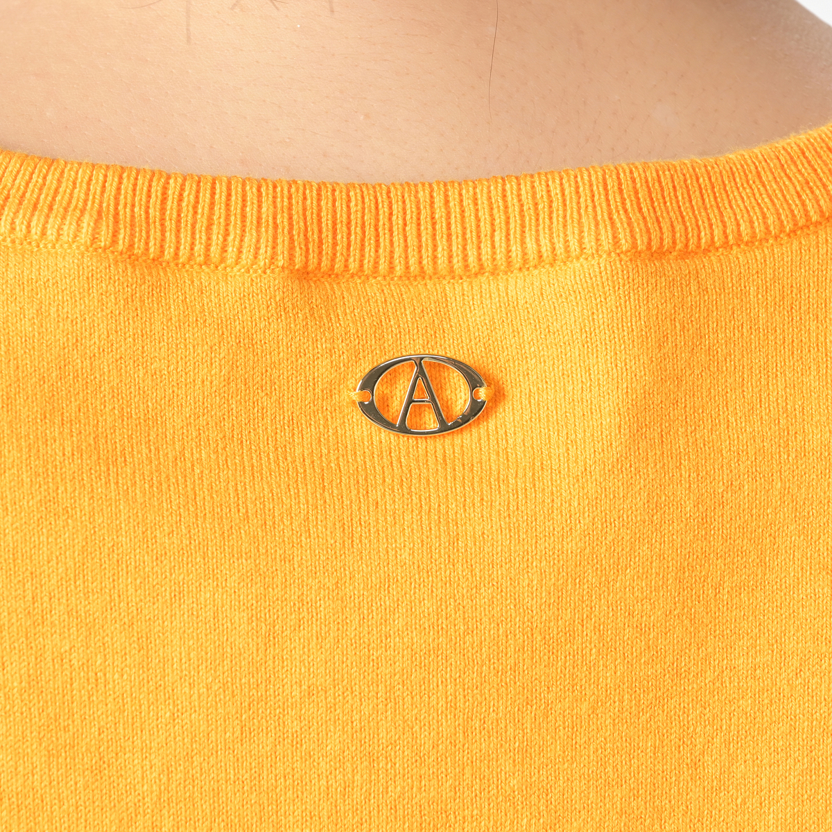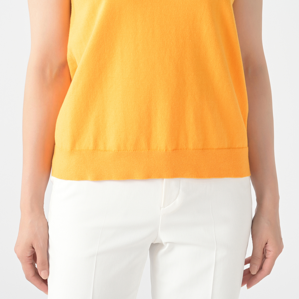 しなやかで光沢のあるシルクコットン混の上質な糸を使ったプルオーバー。Vネックラインのノースリーブデザインで、ボディラインを拾いにくく、カジュアルにもドレッシーにも着まわせます。後ろ衿ぐり下にオリジナルの金色プレートで高級感をプラスしました