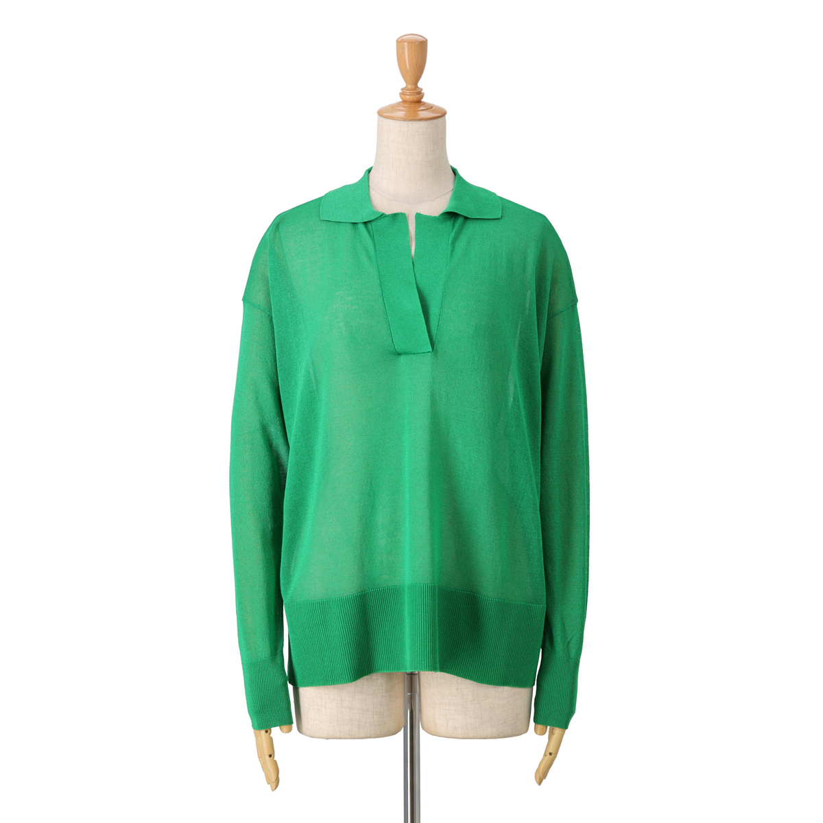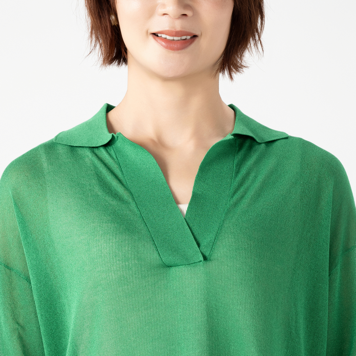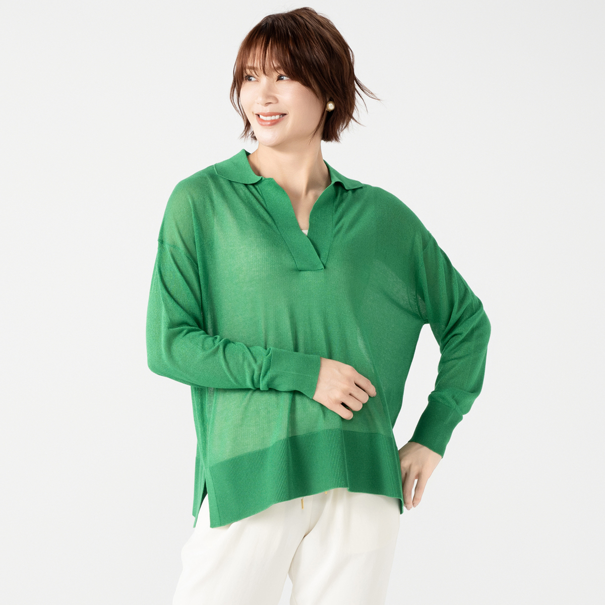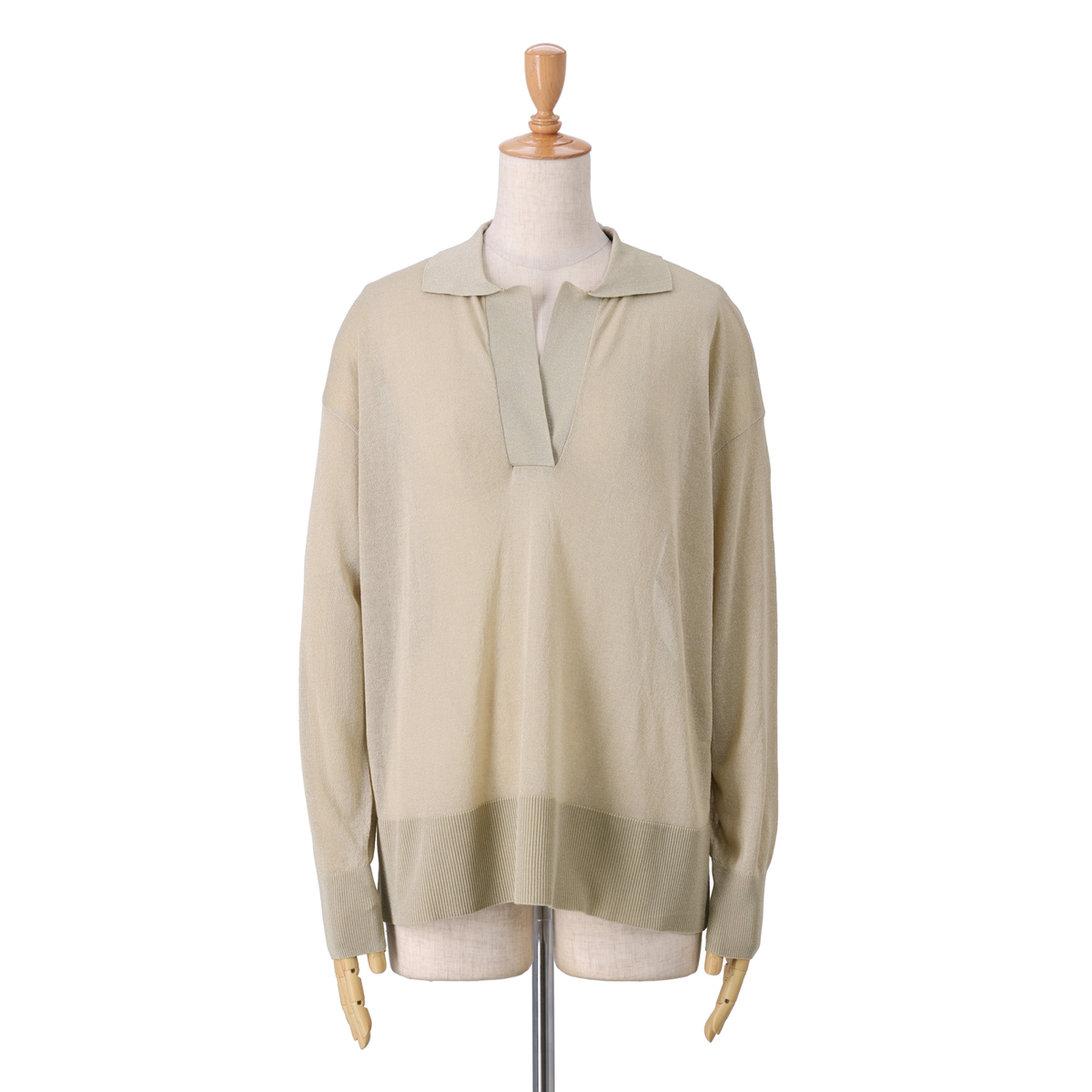 ラメハイゲージニットを使ったシアーなプルオーバー。落ち感のある編地を活かし、布帛のようなシャツチュニックに仕上げました。衿元はスキッパータイプで大きめのシャツ衿がアクセントになっています