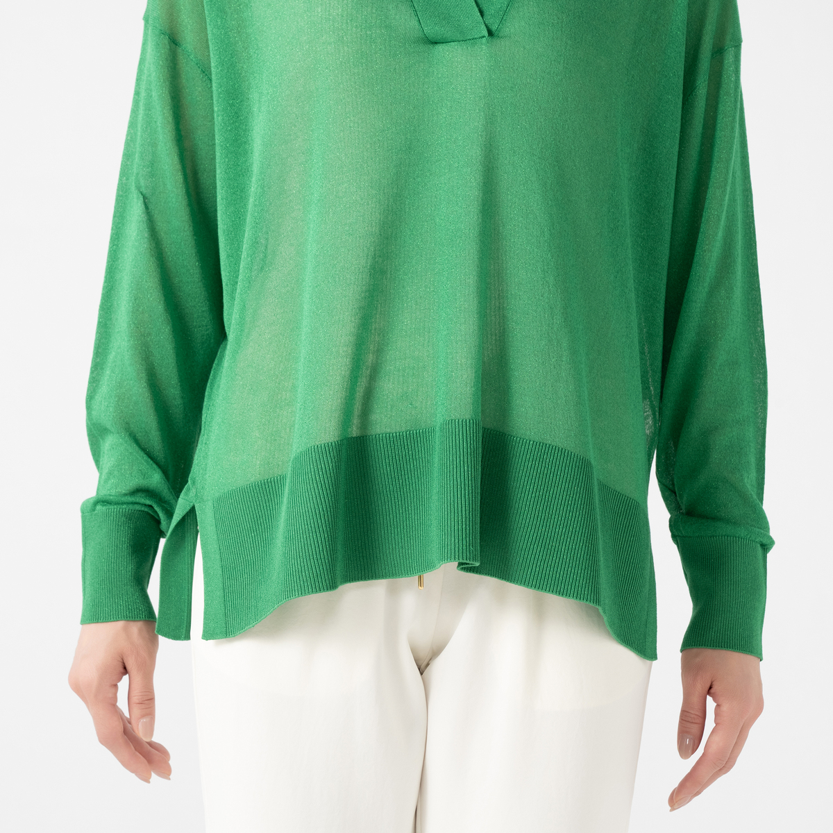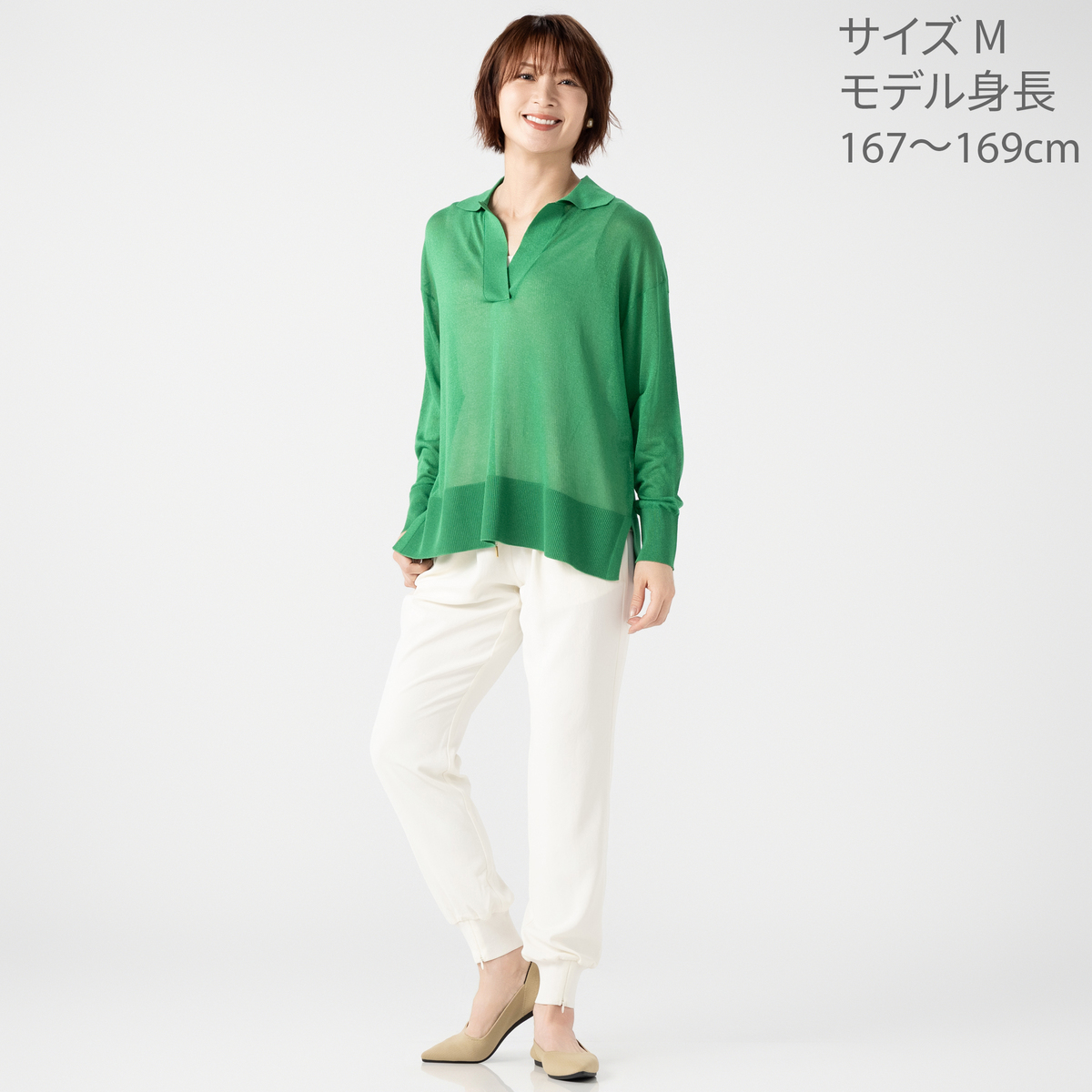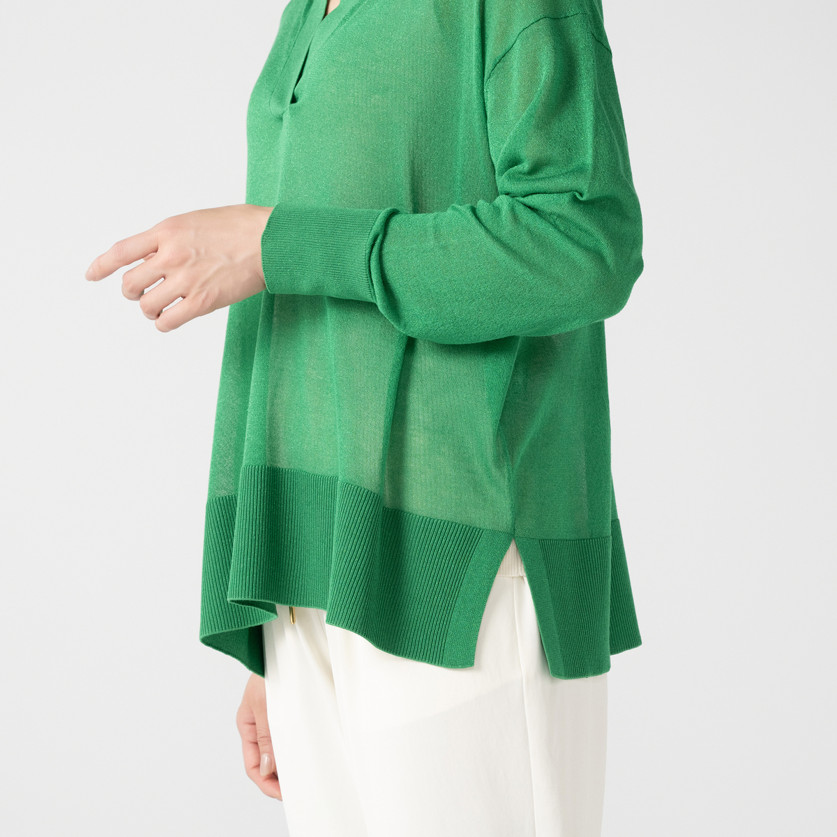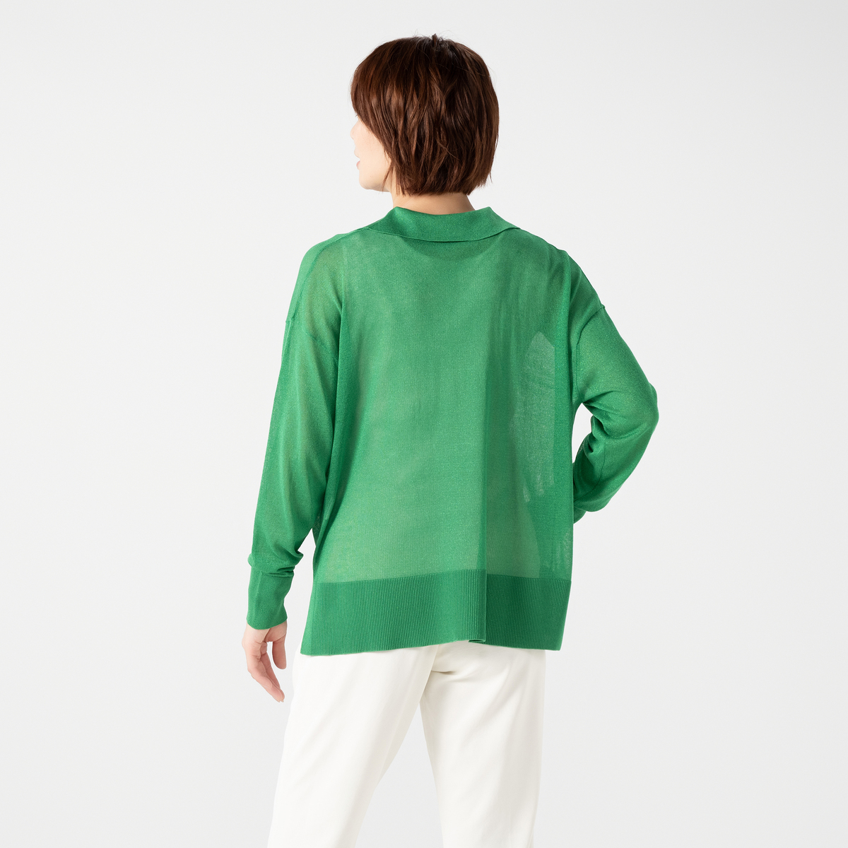 ラメハイゲージニットを使ったシアーなプルオーバー。落ち感のある編地を活かし、布帛のようなシャツチュニックに仕上げました。衿元はスキッパータイプで大きめのシャツ衿がアクセントになっています