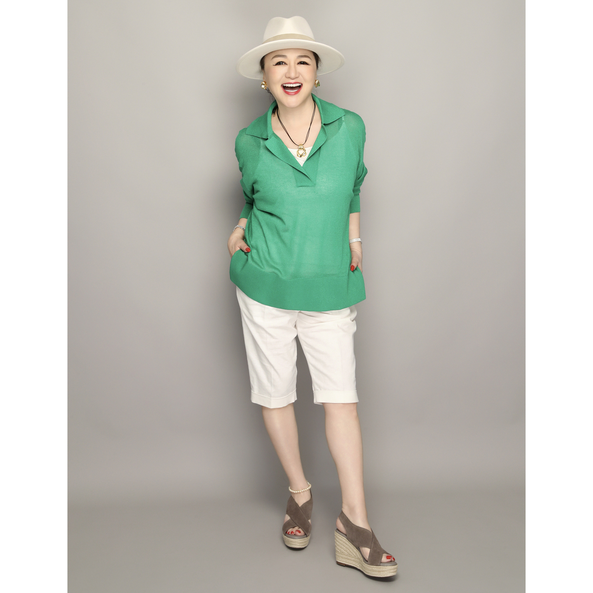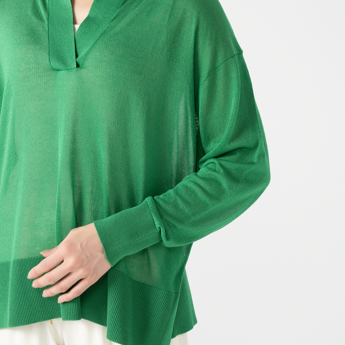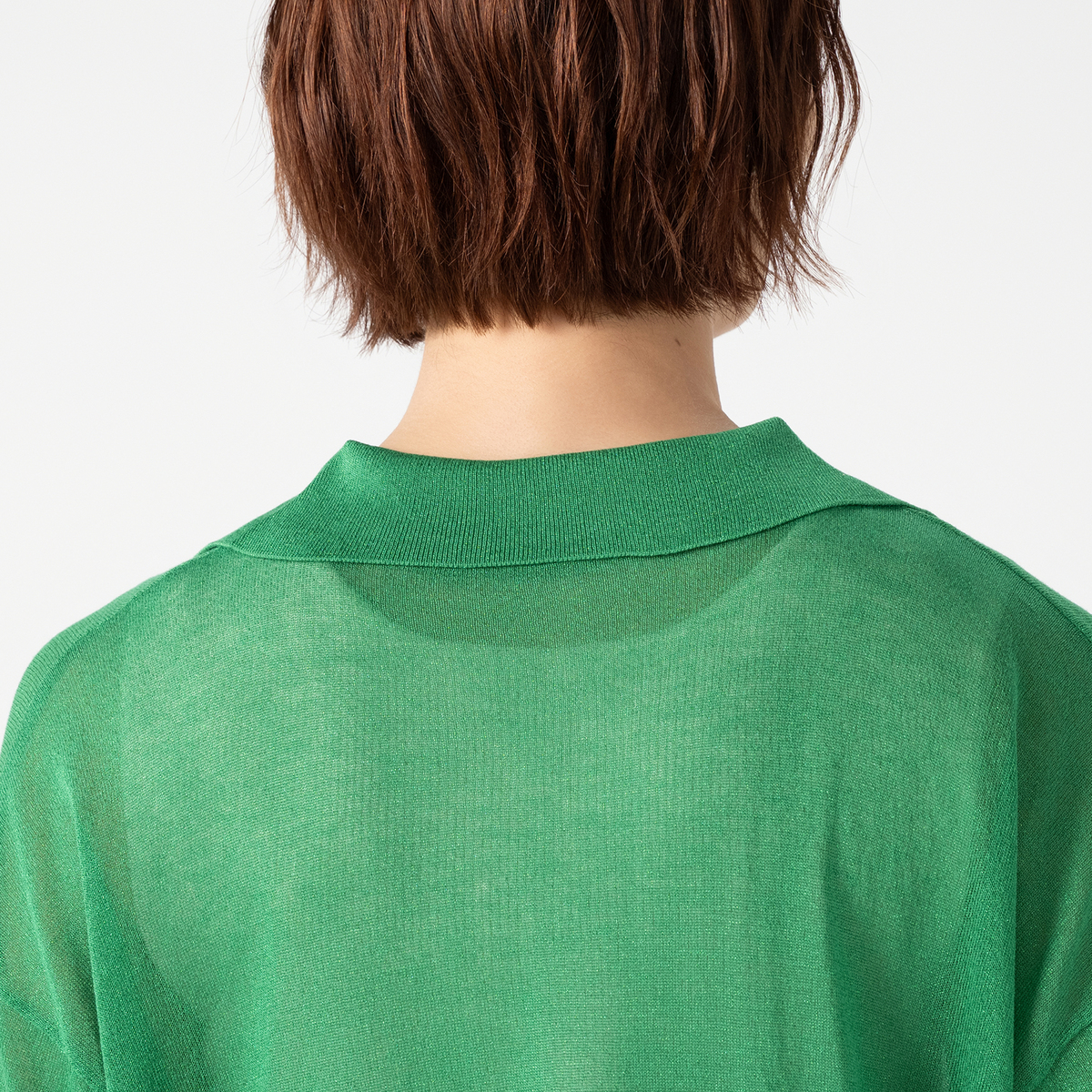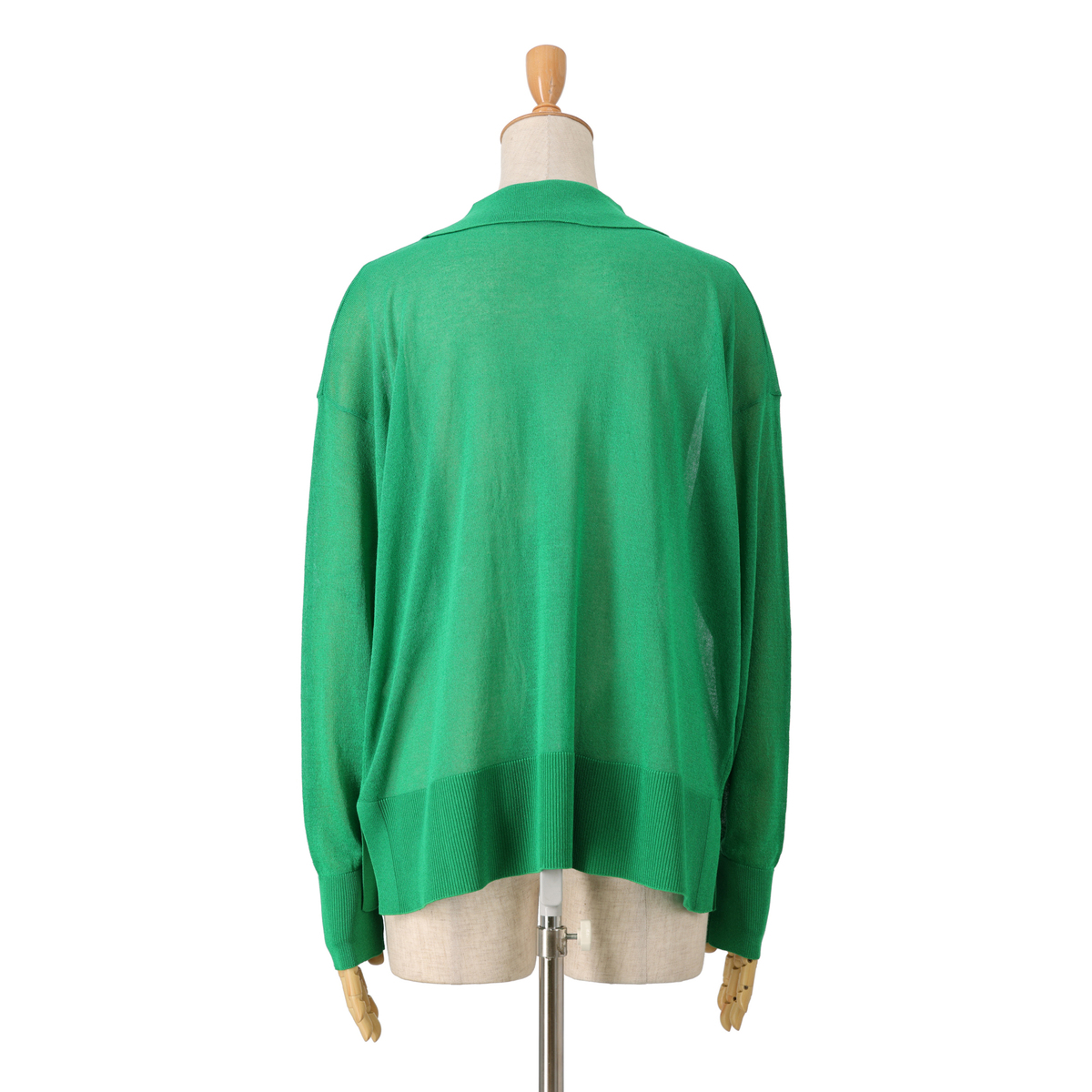 ラメハイゲージニットを使ったシアーなプルオーバー。落ち感のある編地を活かし、布帛のようなシャツチュニックに仕上げました。衿元はスキッパータイプで大きめのシャツ衿がアクセントになっています