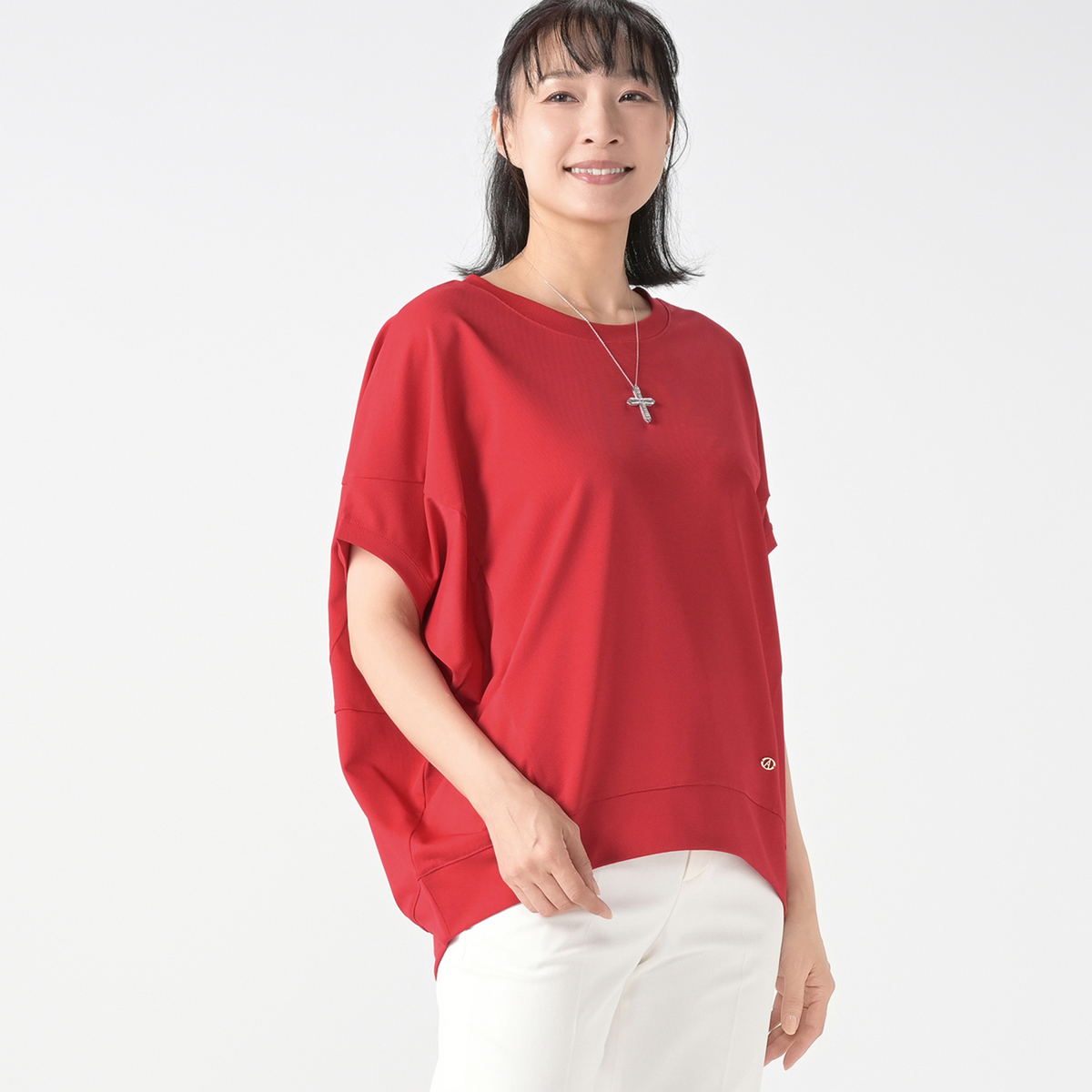 皆さんのコメントが凄く良いので期待して購入しましたが、生地にかなりハリがあるので横広になりブラックなのに太って見えます。 何度かお洗濯すると柔らかくなって、もう少し身体に沿ってくれるのかな? 首はVネックだと涼しさアップだと思います。