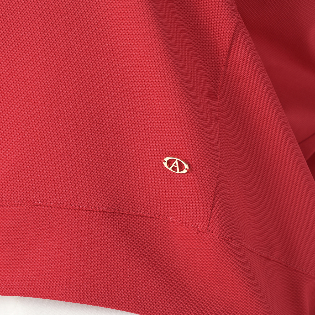 ヒップトップを自然に隠せる丈感。UVカット機能と吸水速乾性も備えました。左前にはオリジナルの金色プレート付きです
