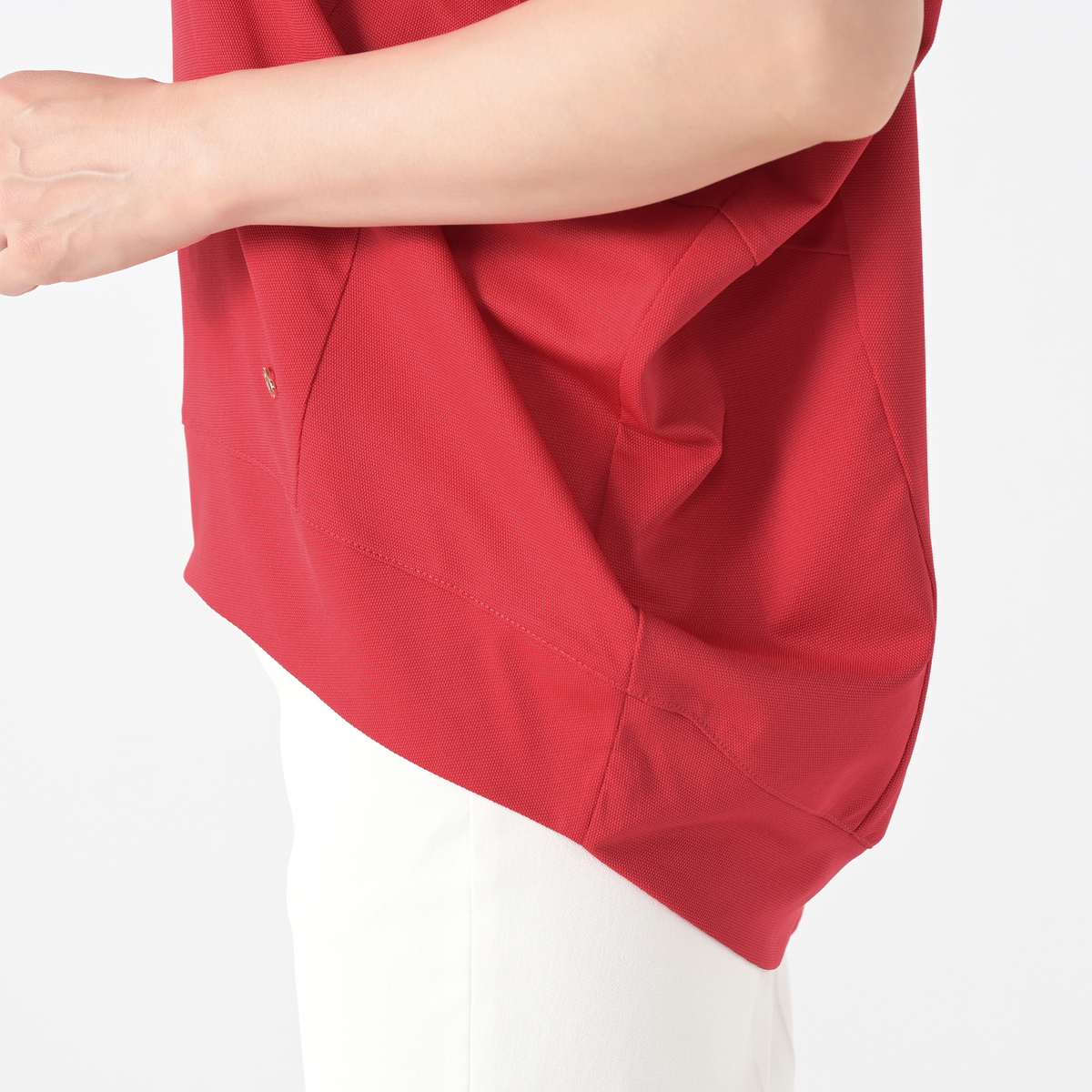 スポーティなカノコ素材を使った、変形ドルマンスリーブのデザインプルオーバー。二の腕をカバーする袖丈と、前後の切替えがアクセントになっています