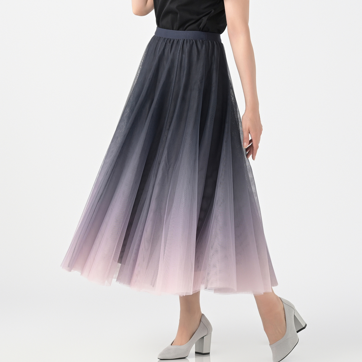 綺麗なチュールが重ねてあるのに軽くて素敵。グラデーションも美しい。良い大人ですがプリンセス気分でテンション上がります。 アンコのキラキラフィルムニットと合わせて着たいです。通年使えるスカートですね。