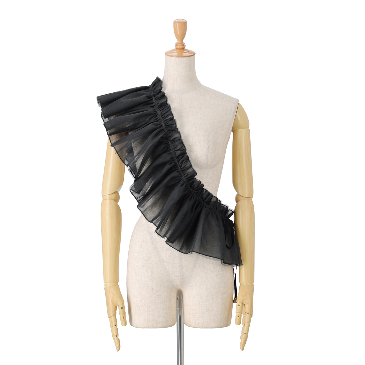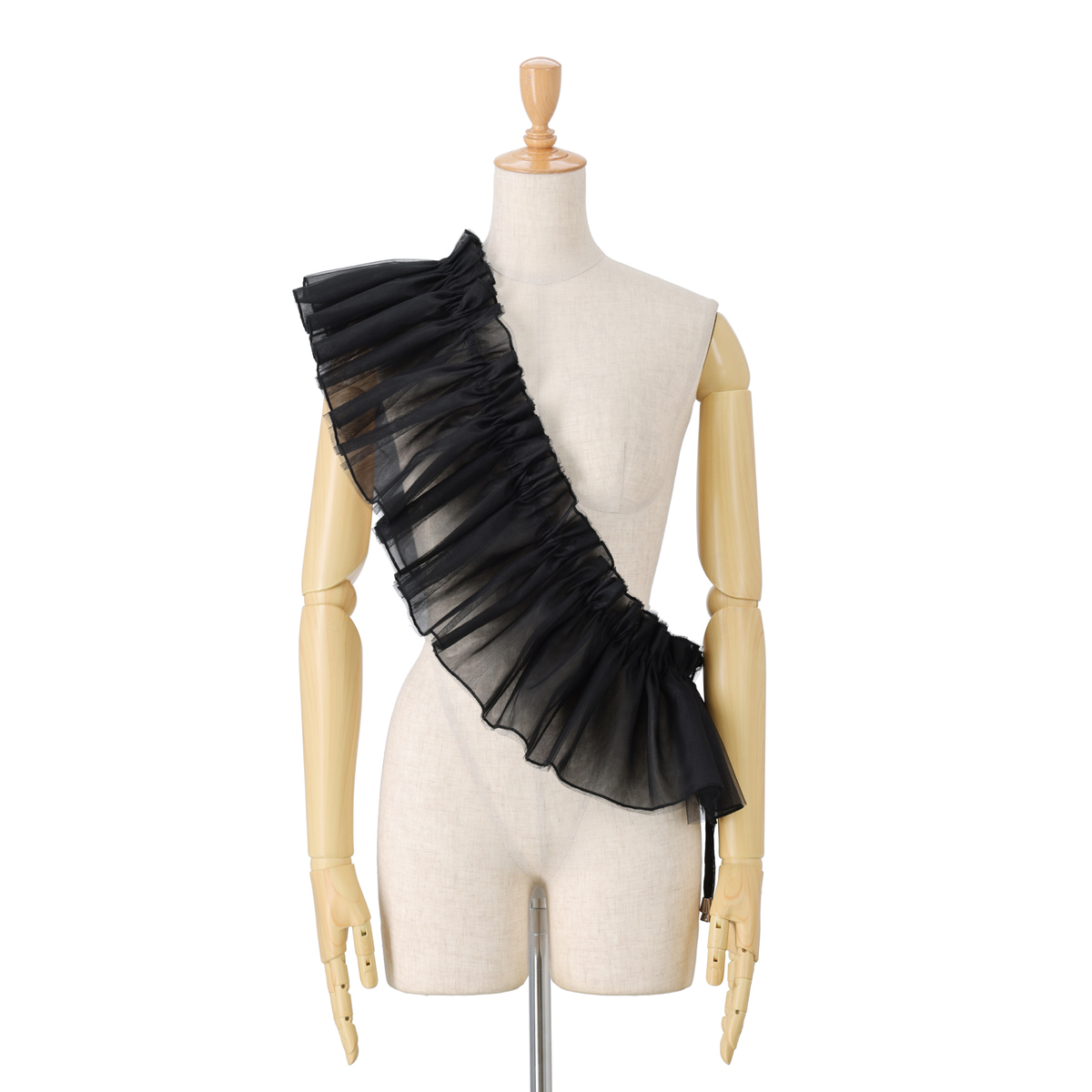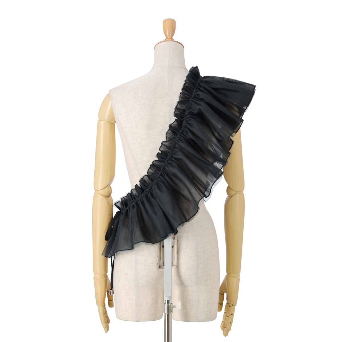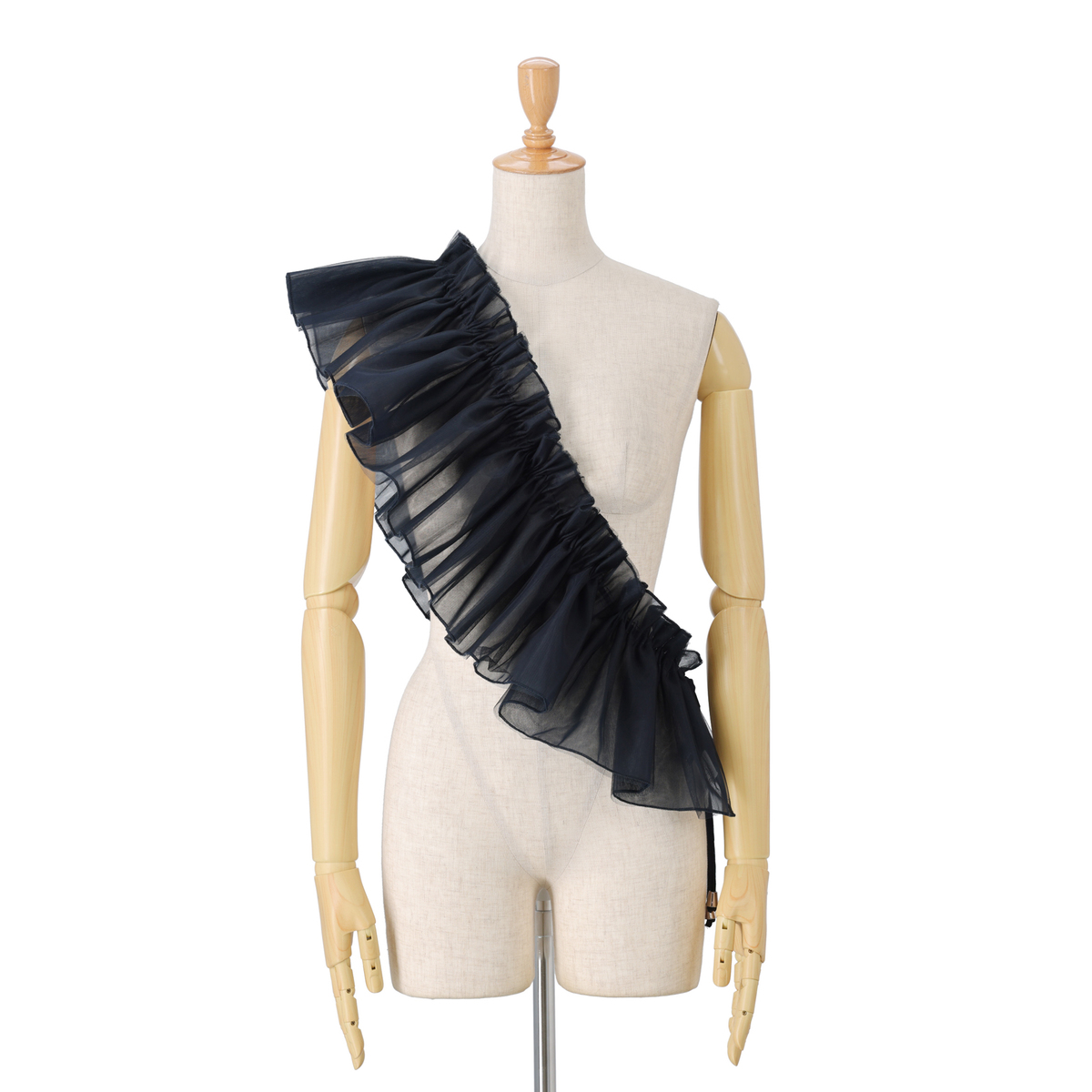 柔らかく落ちの良いソフトチュールと、張りのあるオーガンジーを組合せたフリルサッシュ。たすき掛けにしたり、ウエストやバストにコーディネートしてペプラムのようにアレンジしたり、肩に羽織ったり、マルチウェイでお洒落を楽しめるアイテムです