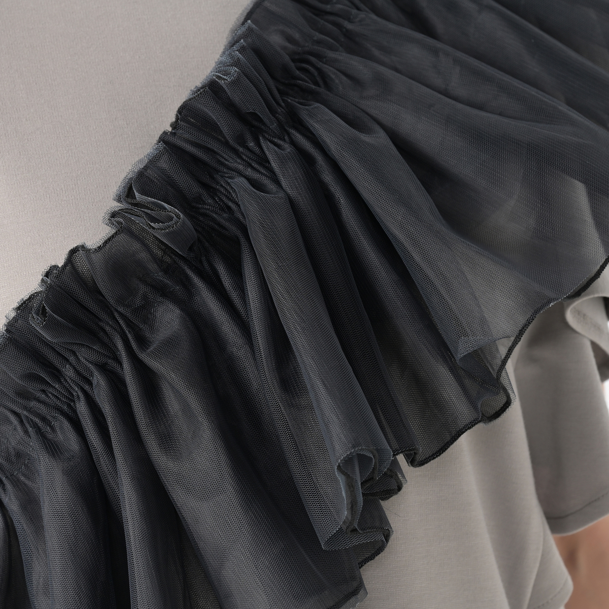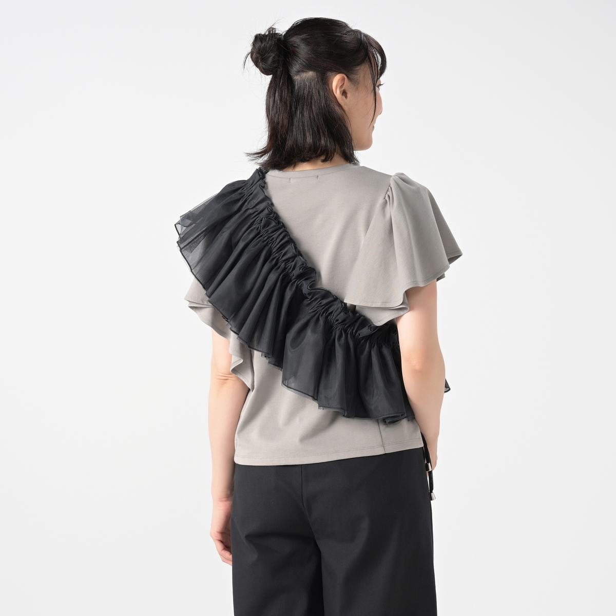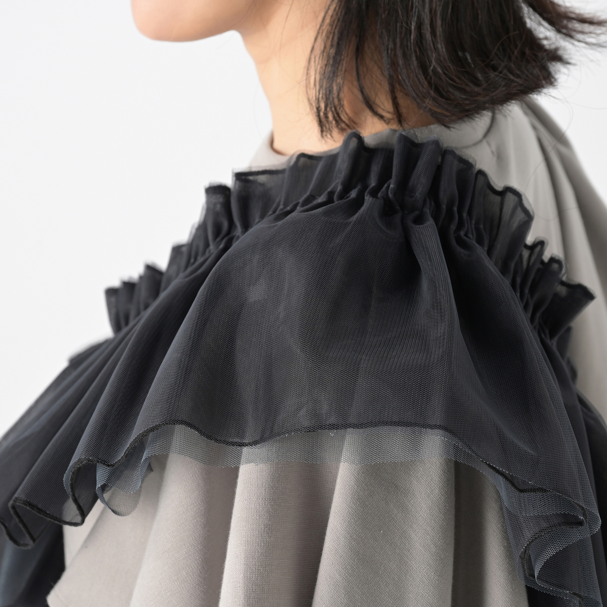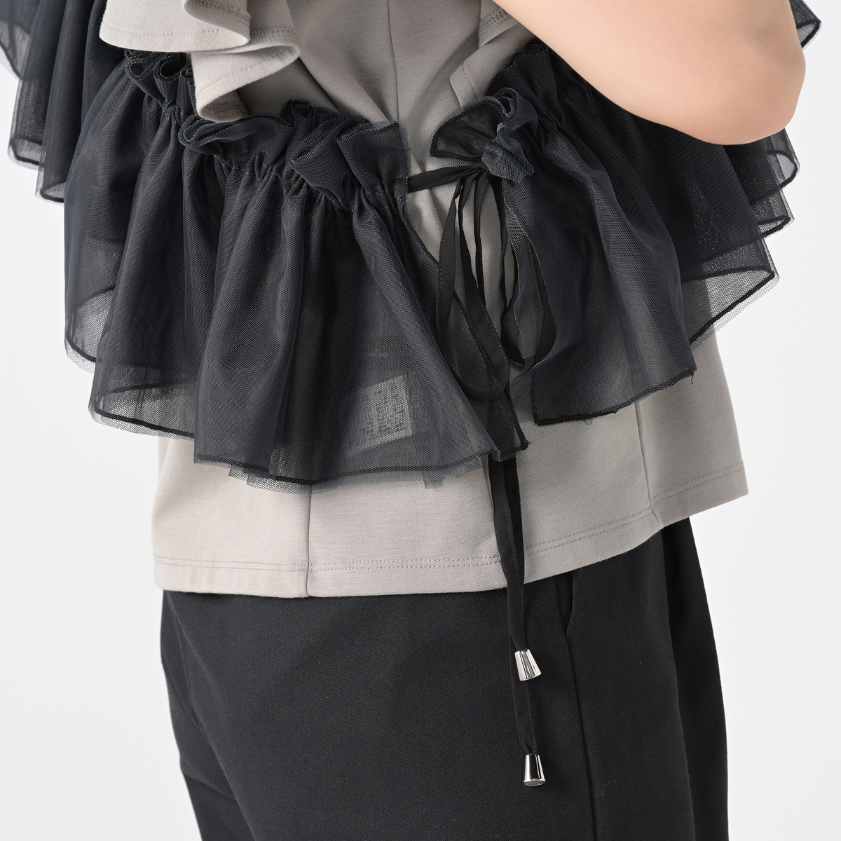 柔らかく落ちの良いソフトチュールと、張りのあるオーガンジーを組合せたフリルサッシュ。たすき掛けにしたり、ウエストやバストにコーディネートしてペプラムのようにアレンジしたり、肩に羽織ったり、マルチウェイでお洒落を楽しめるアイテムです