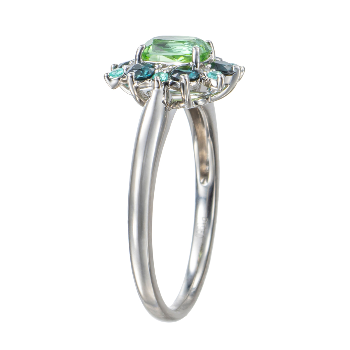 素材: [ミントカラートルマリン] クッションシェイプ 爪留め 1石 0.50ctUP [ダイヤモンド] ラウンドシェイプ 爪留め 6石 合計0.02ctUP [ブルーグリーンカラートルマリン] ラウンドシェイプ 爪留め 6石 [パライバトルマリン] ラウンドシェイプ 爪留め 6石 最大幅(約) 11.0mm 最小幅(約) 1.5mm 総重量(約) 3.3g [地金] プラチナ950 ■受注発注商品のためデザイン・価値に影響のない範囲で仕様が変わる場合がございます ■素材の大きさ・形・色合い、製品のサイズは1点1点多少異なります ■ミントカラートルマリンとブルーグリーンカラートルマリンは商業名で宝石名はトルマリンです 【日本製】