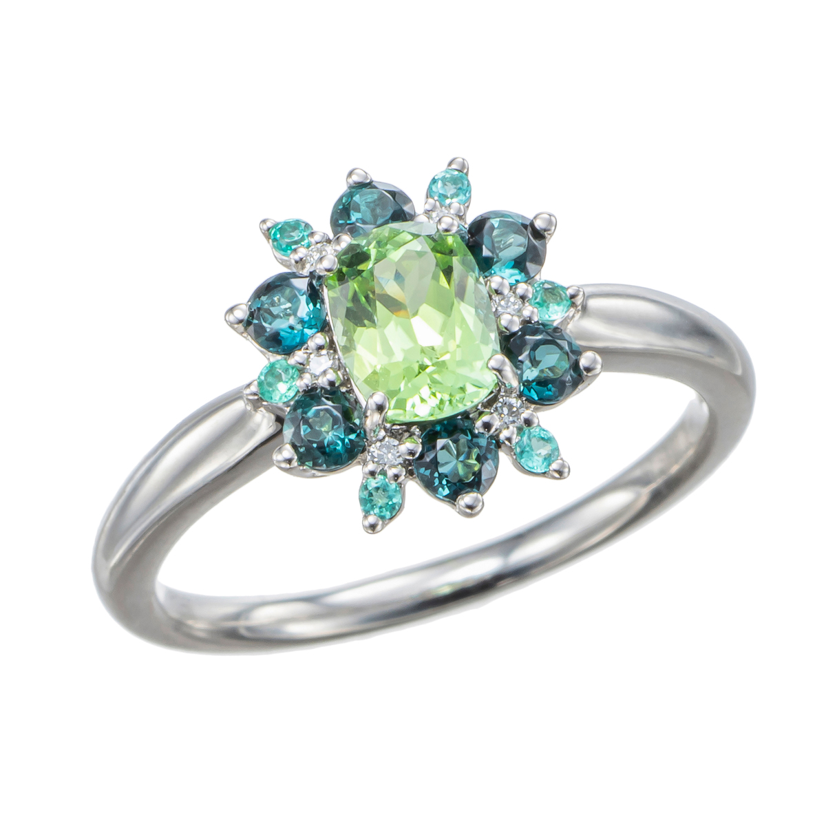 雄大な自然を思わせる色合いのリング。爽やかなグリーンにわずかにブルーが溶け込んだミントカラートルマリンを中心に、ディープフォレストのようなブルーグリーンのトルマリンとネオンブルーのパライバトルマリンを組合せました。安らぐ生命力を感じる色の重なりを、落ち着いた輝きのプラチナが上品に受け止め、ダイヤモンドがその繊細な煌きを引き立てます