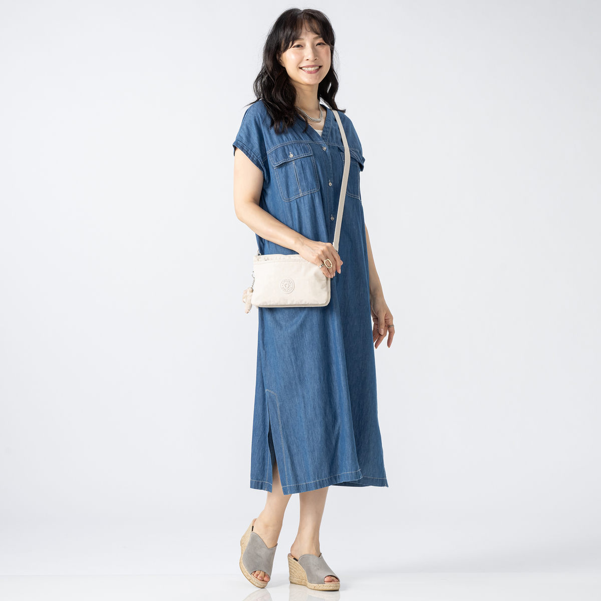 シンプルなデザインのポシェット。内部はファスナーポケットとオープンスペースに分かれているので、荷物の整理もしやすく。ショルダーベルトは長さ調整ができ、短くすればミニショルダーバッグに。ベルトを外せば、ポーチやクラッチバッグとして使えます
