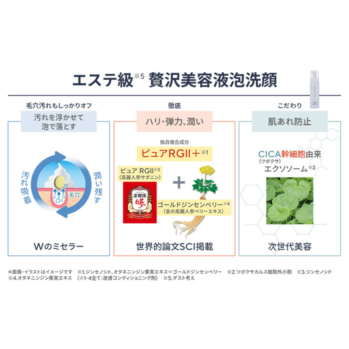 ハロゲイト炭酸水*1)が、皮脂や古い角質、毛穴の汚れを浮かしてきれいにオフ。ピュアRGII*2)にゴールドジンセンベリーエキス*3)を掛け合わせた独自複合成分のピュアRGII+を配合。さらに植物オイル成分など、こだわり抜いた75種類の美容成分を配合しました