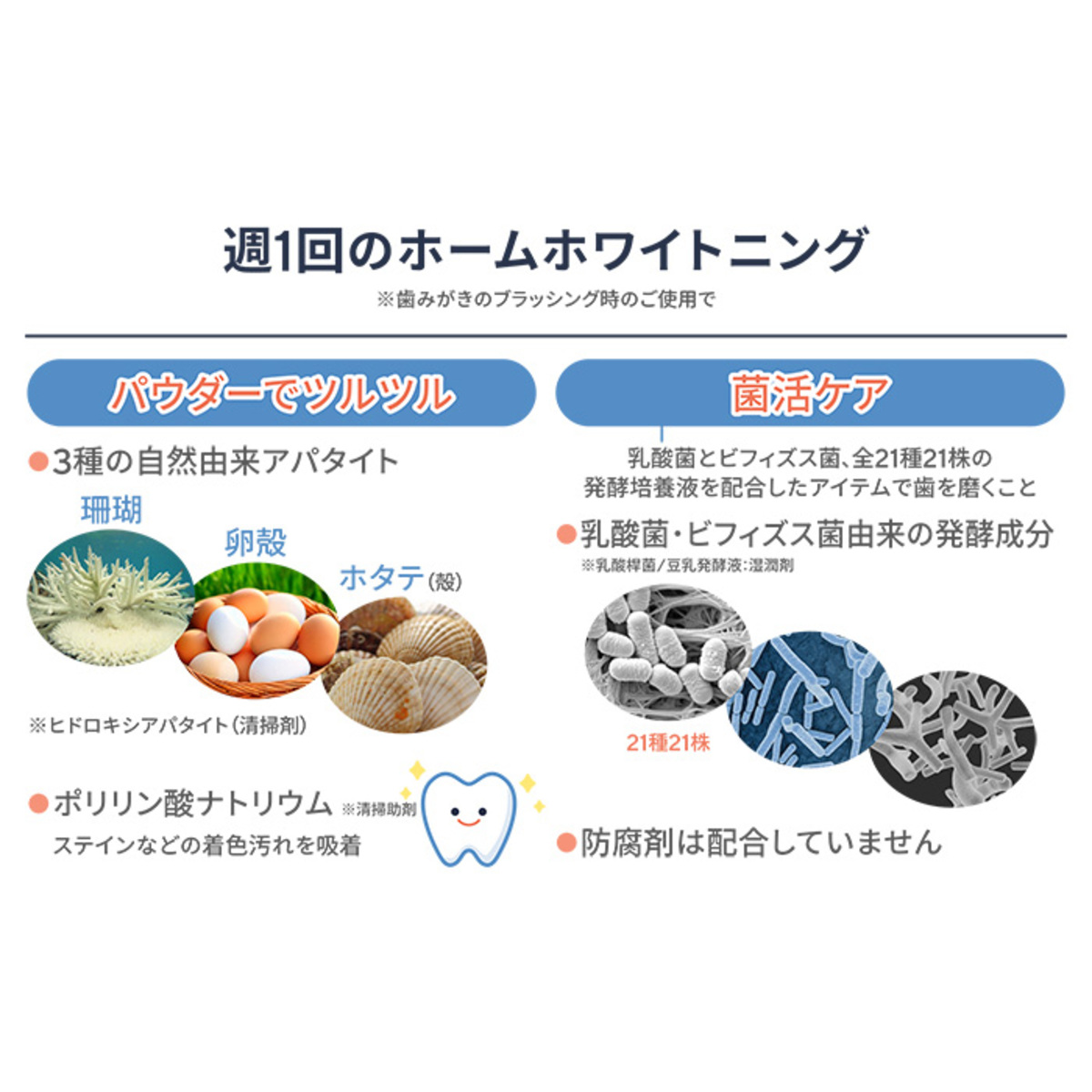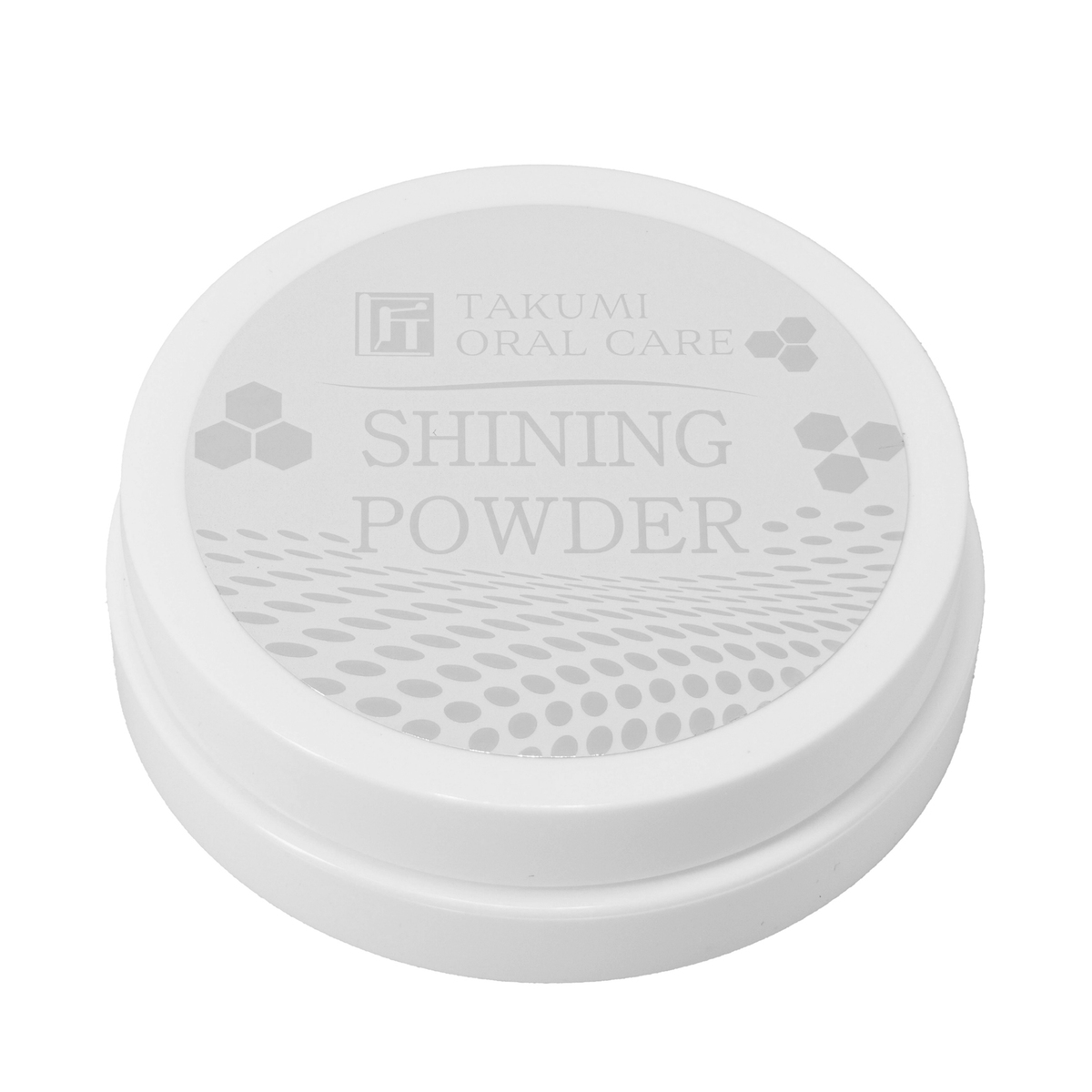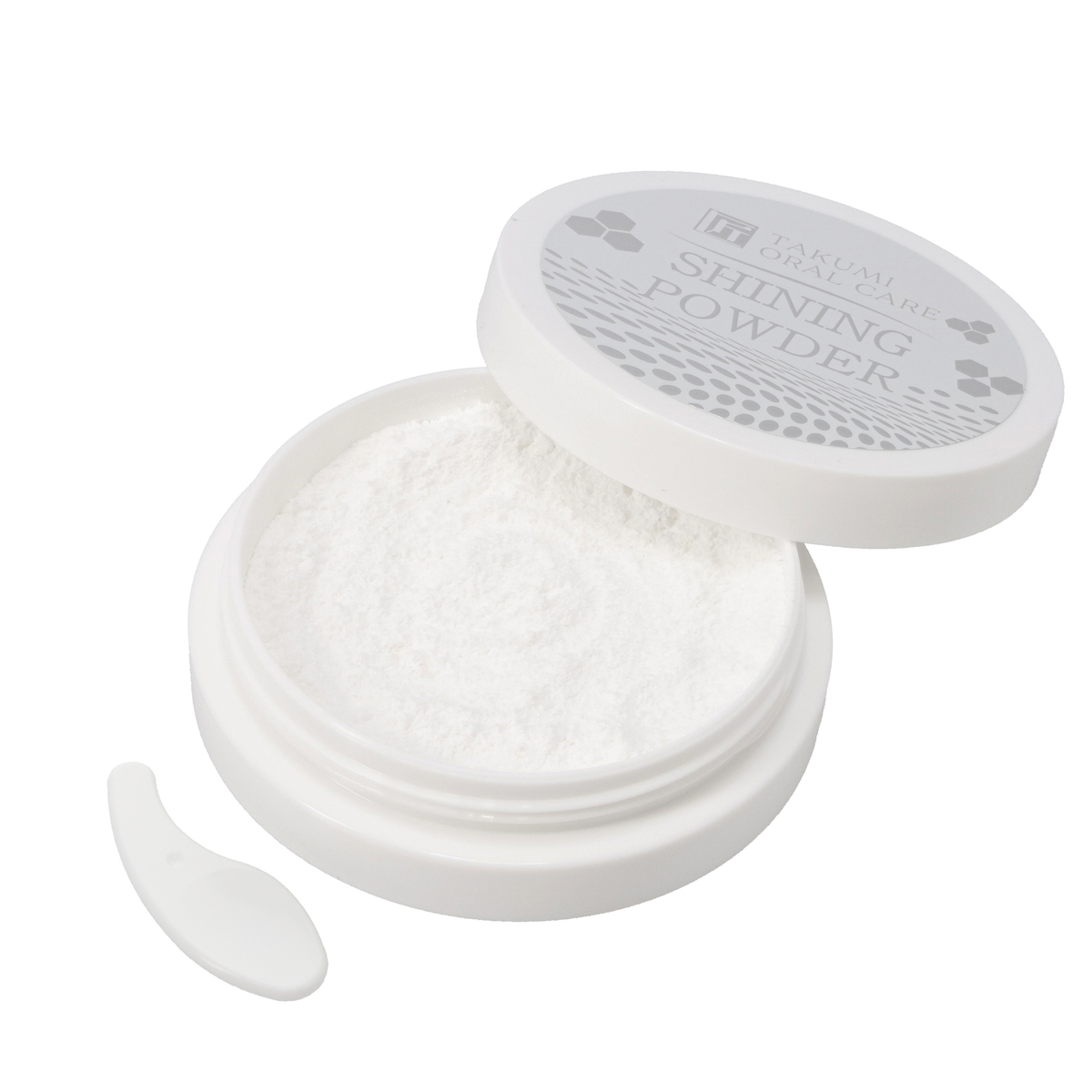 いつもの歯磨き粉をシャイニングパウダーに変えて、歯みがき時にご使用いただくパウダータイプの歯みがき粉。歯の着色汚れを取り、歯を白くし、本来の歯の色に近づけます。虫歯を防ぎ、歯垢を除去し、歯石の沈着を防ぎ、口臭を防ぎます
