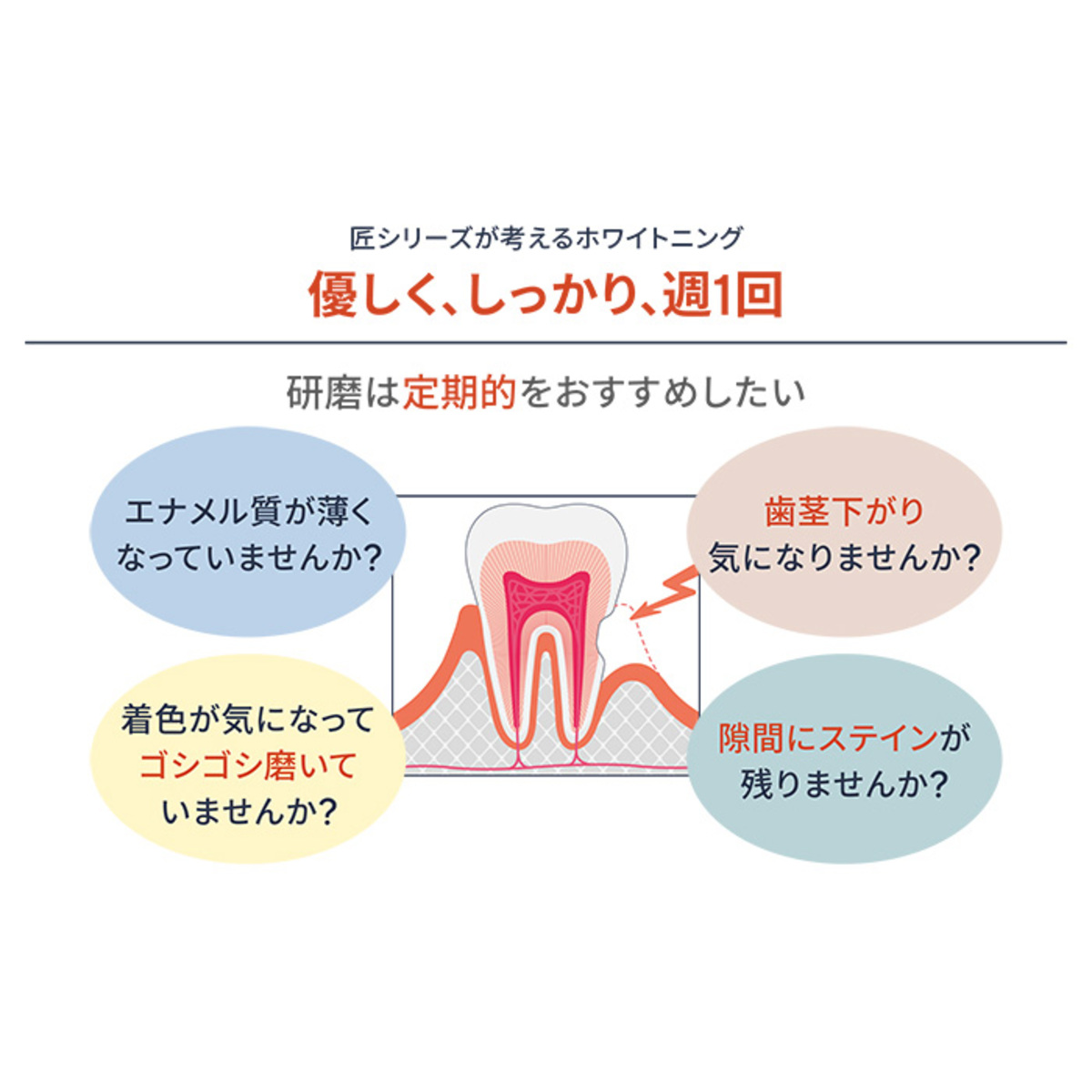 [商品内容] 匠のシャイニングパウダー 20g [使用方法] 付属のスパチュラで適量をすくい、歯ブラシにつけ、歯をブラッシングしてください。磨いたあとは、お口をよくすすいでください [注意事項] ※容器を開けるときは、キャップ面を必ず上にして平らなところに置き、粉歯磨がこぼれないようゆっくりと開けてください ※清潔な歯ブラシをお使いください。また、衣服につかないようにご注意ください ※口腔内に異常があらわれた場合は、ご使用を中止してください。そのままご使用を続けますと、症状を悪化させることがありますので、医師、歯科医師にご相談されることをおすすめします ※傷やはれもの等、異常のある部位にはご使用を控えてください ※本品は粉歯磨ですので、飲み込まないようにしてください ※使用後は必ずしっかりキャップを閉め乳幼児の手の届かないところに保管してください ※保管環境により経時的に粉がダマになる事があります。 歯ブラシの先等で軽くつぶしてほぐし、そのままご使用いただきましても品質に影響はございません ※水分が入りますと粉が固まる事があります ※入歯やさし歯の材質によっては、表面のツヤがなくなる場合があります。充分に注意してご使用ください ※直射日光の当たる場所、極端に低温または高温、多湿の場所を避けて保管してください ※開封後はなるべく早く使い切るようにしてください。長時間放置してからの再使用はお止めください 【日本製】 [成分] 清掃剤:ヒドロキシアパタイト、炭酸Ca、結晶セルロース、含水シリカ / 洗浄剤:ラウロイルグルタミン酸Na/ 甘味剤:キシリトール、ステビア葉/茎エキス/ 清掃助剤:三リン酸5Na、メタリン酸Na/ 保湿剤:乳酸桿菌/豆乳発酵液、シクロデキストリン、グリチルリチン酸2K、セージ葉エキス、タチジャコウソウ花/葉エキス、ローズマリー葉エキス/ 粘結剤:キサンタンガム / 香味剤:ハッカ油/ 溶剤:BG、水 ※1 ヒドロキシアパタイト(珊瑚・卵殻・ホタテ由来):清掃剤 ※2 乳酸桿菌/ 豆乳発酵液:保湿剤