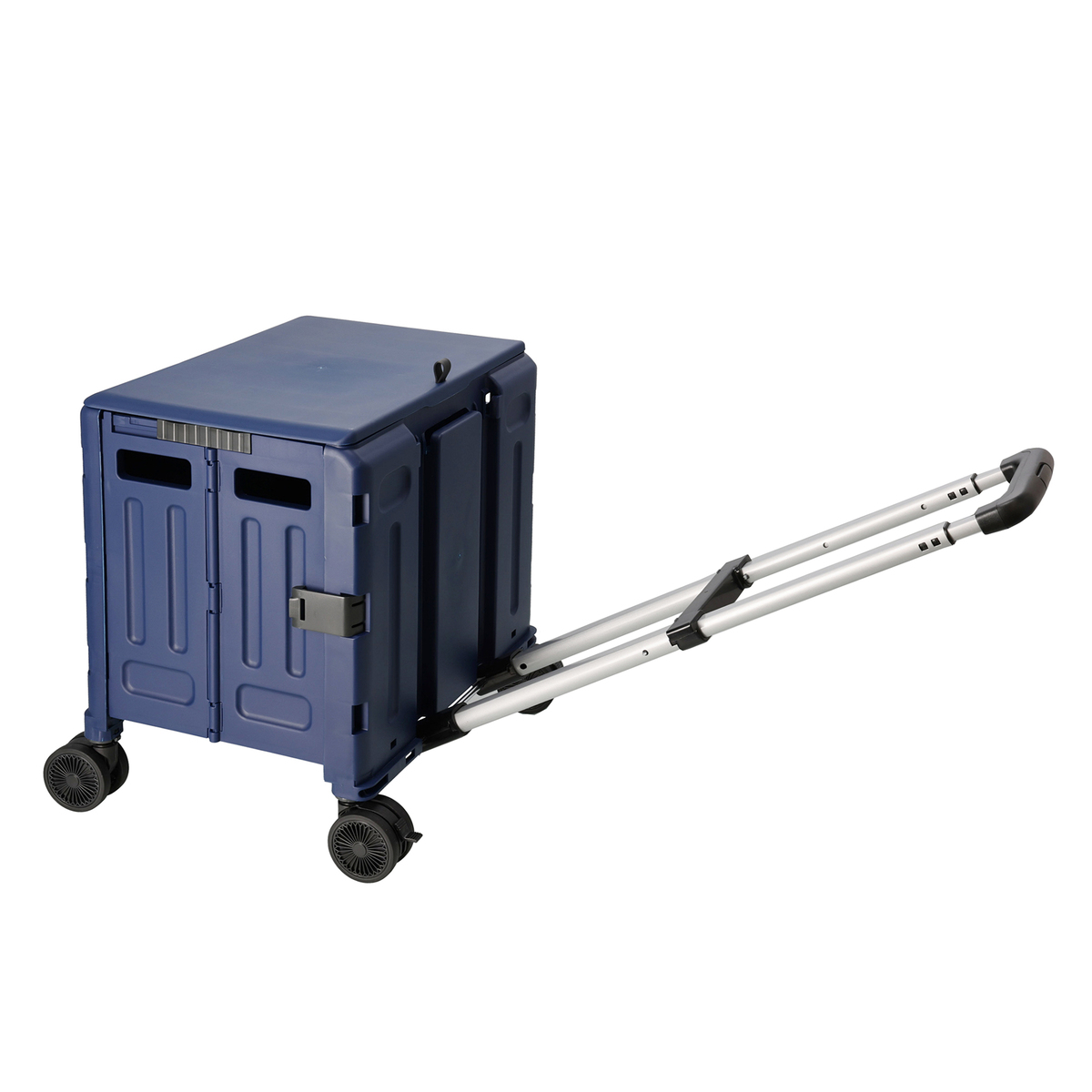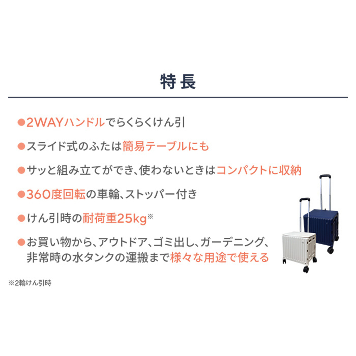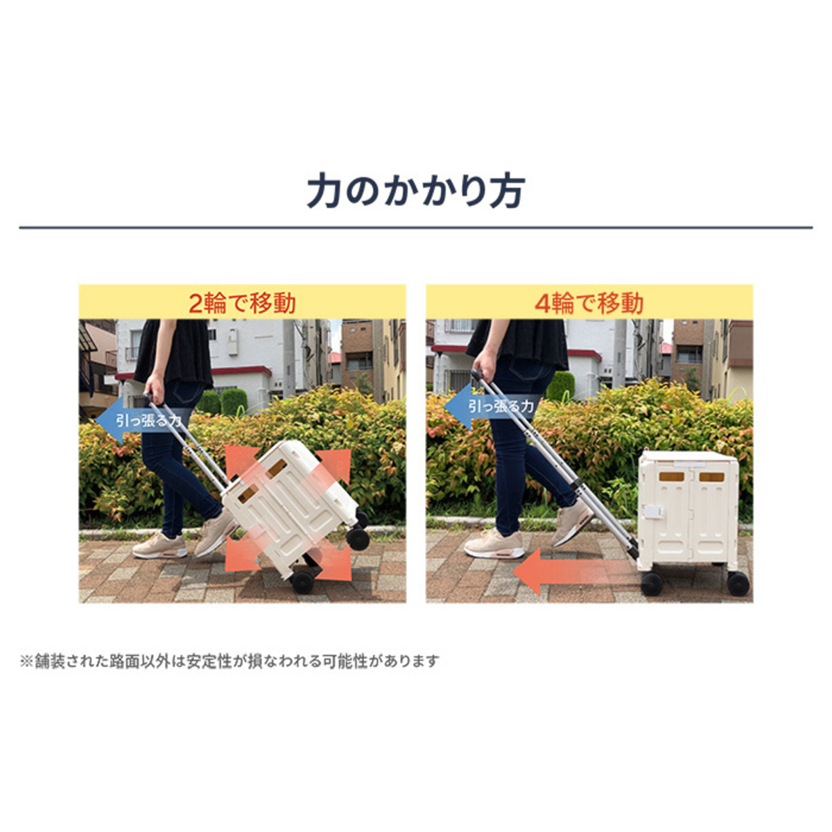工具不要で簡単に組み立てられ、車輪はストッパー付きで直径約7cm。ハンドルは固定した状態で2輪でけん引ができるほか、ハンドルを倒して4輪でけん引することもできます(*3)