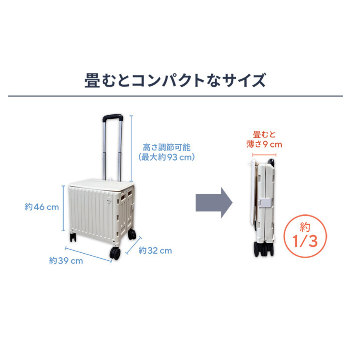 [商品内容] ・本体 ・車輪×4 [サイズ(約)] 幅39×奥32×高46 (ハンドル伸長時最大93)cm 折りたたみ時:幅39×奥9×高46cm 車輪:直径7cm [重量] 約3100g [材質] 本体:PP ハンドル:鉄 フタ:PP 車輪:PP、ABS、PU 両側のロック部分:ABS [耐荷重] 4輪けん引時/静止時50kg(2輪けん引時25kg) [使用方法] 1.本体両サイドにあるロックを外しコンテナを広げて下さい 2.フレームロックを横にスライドさせてロックし、底板を倒して下さい 3.本体と車輪の接続部を正しく合わせ、「カチッ」と音がするまで両手の親指でしっかりと押し込み、車輪を取り付けて下さい。車輪がうまくはまらない場合、本体のフタを閉め、本体を逆さにひっくり返して置き、真上から垂直に車輪を押し込んで下さい 4.ハンドルのポタンを押しながらハンドルを上下することでハンドルの高さを調節できます ※ハンドルの高さは3段階まで調整可能 ※「カチッ」と音がすることを確認して下さい ハンドルを一番上まで上げ、固定具を上に持ち上げて外すことで、ハンドルを倒して使用できます 4.フタをご使用の際は、フタのつまみ部分を持ちコンテナ上面までスライドさせ固定して下さい。ご使用にならない際は、フタのつまみ部分を持ち、コンテナ前面にスライドさせ収納して下さい ■取り扱い説明を充分にご確認の上、ご使用下さい 【中国製】 [注意事項] ※ハンドルに寄りかかると、転倒することがあるのでご注意下さい ※階段または段差が約10cm以上の場所で引き下ろしをしないで下さい。荷物を入れたまま段差のあるところを降りると、車輪・フレーム等が破損する恐れがあります ※可動部に手や足などを挟まないように十分ご注意下さい ※天板には座らないで下さい ※使用前に各部を点検して下さい ※組み立て及び調整は確実に行って下さい。使用前に折りたたみ固定用のロックがかかっているかを確認して下さい ※重い物は下部に収納するようにして下さい ※雨ざらしにしないで下さい ※物を運ぶ際は押して使用しないで下さい ※重い荷物を天板に乗せる場合は、天板の内側のみに重心がかからないようご注意下さい ※中に物を入れる際は、ゆっくりと置いて下さい。重い物を投げ入れるなど、一部の箇所のみに力が加わると、底板が割れてしまう恐れがあります ※部品のガタつきやゆがみ、曲がり、脱落など異常がある場合は使用しないで下さい ※必ず耐荷重(4輪でのけん引時・静止時は50kg/2輪でのけん引時は25kg)の範囲内で使用して下さい ※故障、またはその使用によって生じた直接、間接の損害については弊社はその責を負わないものとします。あらかじめご了承下さい ※直射日光の当たる場所や高温・多湿となる場所、ホコリや油煙などの多い場所で使用したり、保管したりしないで下さい ※強い振動や衝撃、無理な力を与えないで下さい ※お手入れをする場合には、ベンジンやシンナーなどの揮発性有機溶剤が含まれているものは使用しないで下さい ※組み立て時、使用時に指を挟まないよう注意して下さい ※移動時以外はハンドルを固定して下さい ※積み下ろしは平坦で、安全な場所で行って下さい ※包装されていない食品を入れて使用しないで下さい ※コンテナの中に人が入ったり乗ったり、動物を入れたりしないで下さい ※歩行に問題のある方が、歩行の補助として使用しないで下さい ※体調の悪い時は使用しないで下さい ※本来の用途以外では使用しないで下さい ※分解・修理・加工・改造はしないで下さい ※運搬は必ず人力で行って下さい。自動車、自転車などでけん引しないで下さい ※シルバーカー、歩行者、つえの代わり、椅子として使用しないで下さい