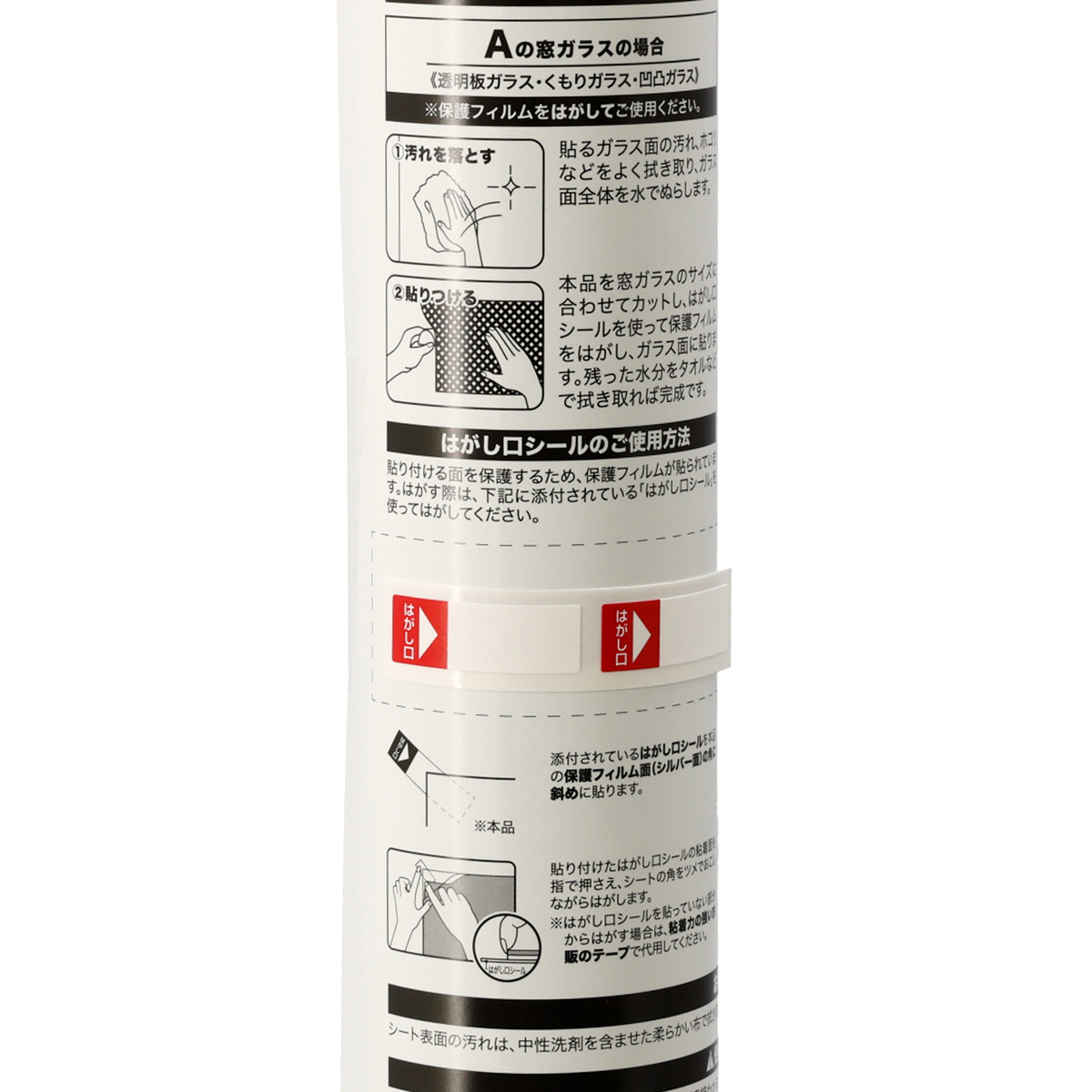 [サイズ] 約92×90cm [材質] 表面:塩化ビニル樹脂 保護フィルム:ポリエステル樹脂 [使用方法] <透明板ガラス・くもりガラス・凹凸ガラスの場合> ※保護フィルムをはがしてご使用ください 1、貼るガラス面の汚れ、ホコリなどをよく拭き取り、ガラス面全体を水でぬらします 2、本品を窓ガラスのサイズに合わせてカットし、はがし口シールを使って保護フィルムをはがし、ガラス面に貼ります。残った水分をタオルなどで拭き取れば完成です <2重(ペア)ガラスの場合> ※保護フィルムをはがさずご使用ください 1、貼るガラス面の汚れ、ホコリなどをよく拭き取ります 2、付属の面ファスナーの「A:硬い面」と「B:柔らかい面」を約2cmの正方形にカットしてください 3、カットした「B」の離型紙をはがして、窓に8箇所(本品1枚につき4箇所)貼り付ける 4、窓に貼り付けた面ファスナー「B」に、カットした面ファスナー「A」を貼り合わせ、離型紙をはがす 5、本品を窓ガラスのサイズに合わせてカットし、本品のシルバー面を4.で貼り付けた面ファスナー「A」の粘着面に押し当てる ※必ずシルバー面を太陽光側に向けてください [お手入れ] シート表面の汚れは、中性洗剤を含ませた柔らかい布で拭き取ってください。シンナー・ベンジン等のご使用は、お避けください [注意事項] ※網入り、その他特殊ガラスでのご使用は避けてください。ガラスが破損する可能性があります ※水が直接かかる浴室内のガラス戸などにはご使用出来ません ※車のガラスには使用しないでください ※本品は室内側から取り付けてください ※ペアガラスに直接貼った場合、ガラスにヒビが入るおそれがあります ※室内の平らなガラス面にご使用ください ※割れたガラスには使用しないでください ※貼る時に部分的に引っぱりすぎると変形するおそれがありますのでご注意ください ※不要になった保護フィルムは、すべりやすいのでご注意ください ※製品のにおいが気になるときは風通しの良いところで1日陰干ししてください ※飛散防止効果はありません ※製品にラベルが付着した場合、水拭きで取り除くことができます 【日本製】
