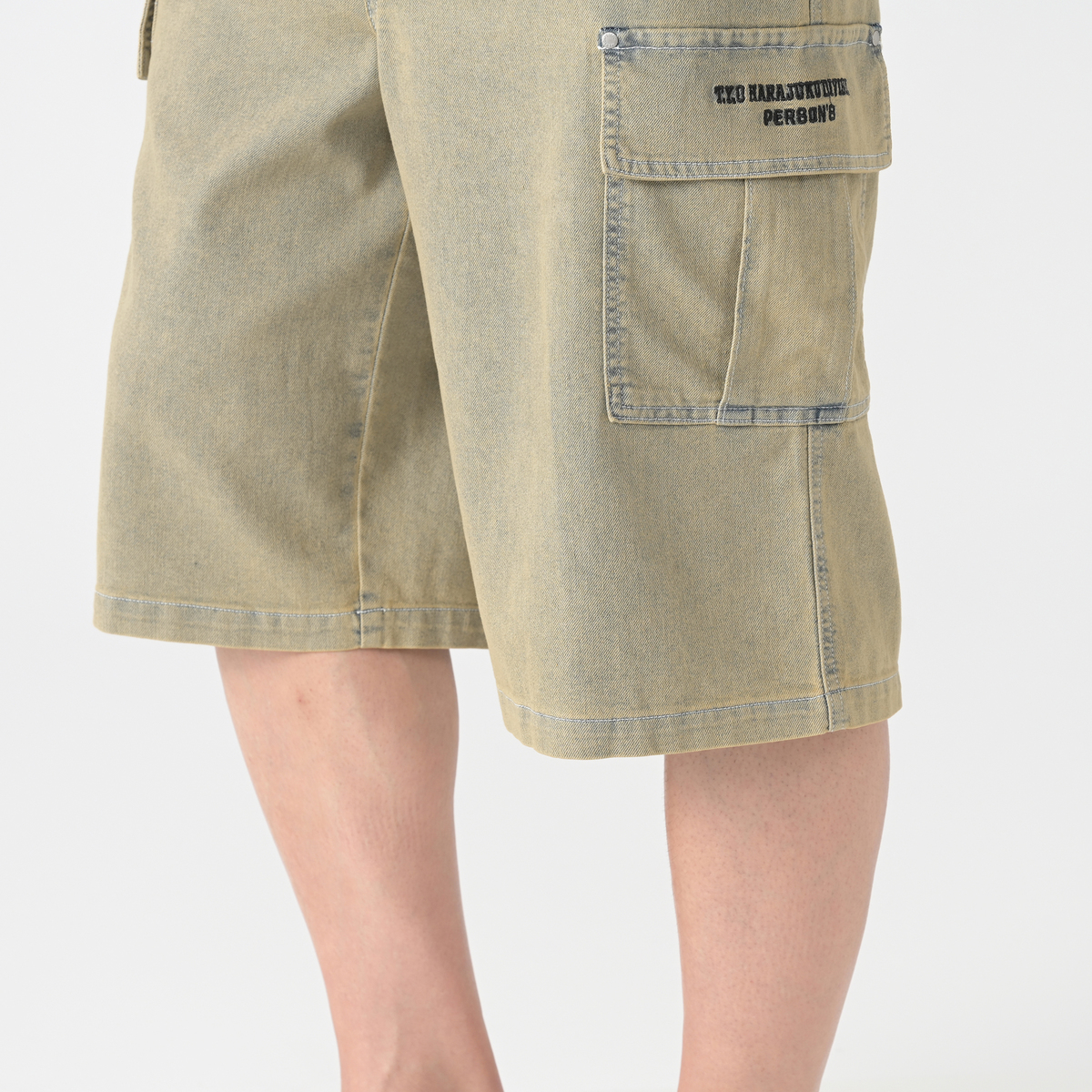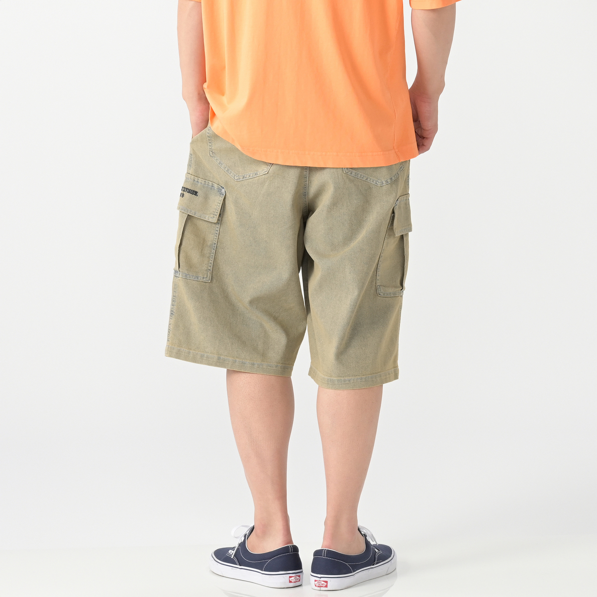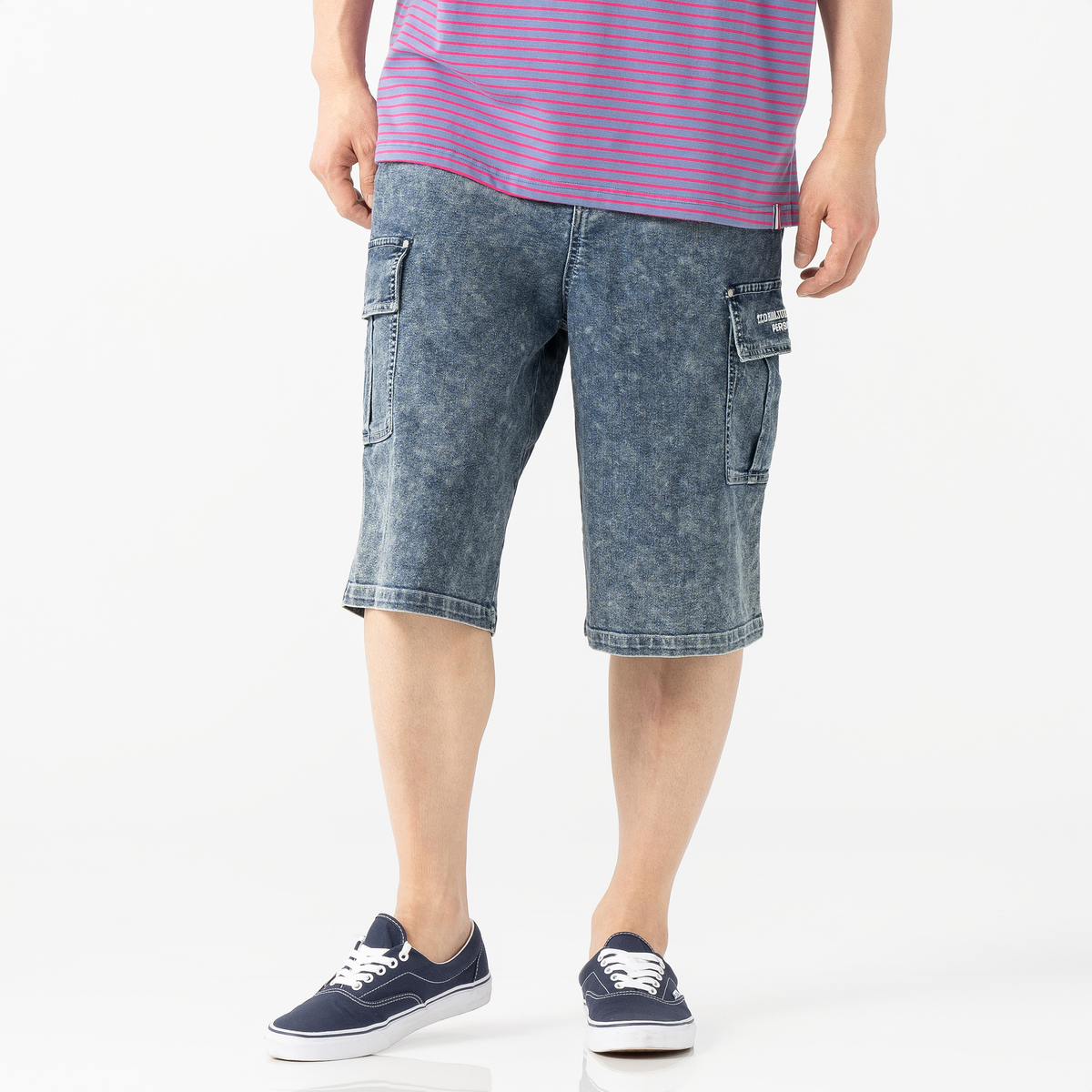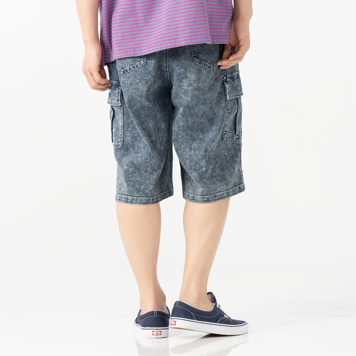 製品加工を施し、色と風合いにこだわったデニムハーフパンツです。薄手素材で暑い日も快適な穿き心地。立体的なカーゴポケットが、ボディラインをさりげなくカモフラージュします