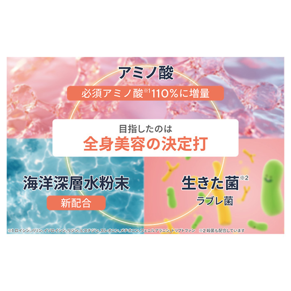 [アレルギー物質特定原材料8品目] なし [内容量] 495g(5.5g×90袋) [目安量] 1日1〜3袋 [保存方法] 直射日光と高温多湿を避けて保存してください [栄養成分表示] 製品1袋(5.5g)あたり エネルギー 21.62kcal たんぱく質 4.81g 脂質 0g 炭水化物 0.57g 食塩相当量 0.004g [お召し上がり方] 1日1〜3袋を目安に、お召し上がりください。口にそのまま入れる場合は、水などと一緒にお召し上がりください。水に溶かしてお召し上がりいただく場合は50〜100ml程度がおすすめです。お好みの飲料に混ぜてもお召し上がりいただけます [注意事項] ※原材料をご参照の上、アレルギーがある方、妊娠中の方、疾病治療中の方の摂取はお控えください ※まれに体質に合わない場合がございます。お召し上がり後、体調のすぐれない場合はお召し上がりを中止してください ※植物由来の原材料を使用しているため、若干の味・色調等にばらつきがある場合がございますが、品質に問題はありません [原料原産地] グレープフルーツ濃縮果汁末(国内製造) [原産国] 日本 [原材料] グレープフルーツ濃縮果汁末(国内製造)、イソマルトオリゴ糖粉あめ、海洋深層水粉末、乳酸菌殺菌末(ラブレ菌)、乳酸菌生菌末(ラブレ菌)/グリシン、L-グルタミン、L-ロイシン、L-セリン、L-アスパラギン、酸味料(リンゴ酸)、L-リジン塩酸塩、トレハロース、L-イソロイシン、L-バリン、L-スレオニン、アラニン、L-フェニルアラニン、L-メチオニン、L-ヒスチジン、L-トリプトファン、甘味料(ラカンカ抽出物)、乳化剤(ヒマワリ由来)、L-シスチン、L-チロシン、L-アスパラギン酸ナトリウム、L-アルギニン、L-グルタミン酸、L-プロリン