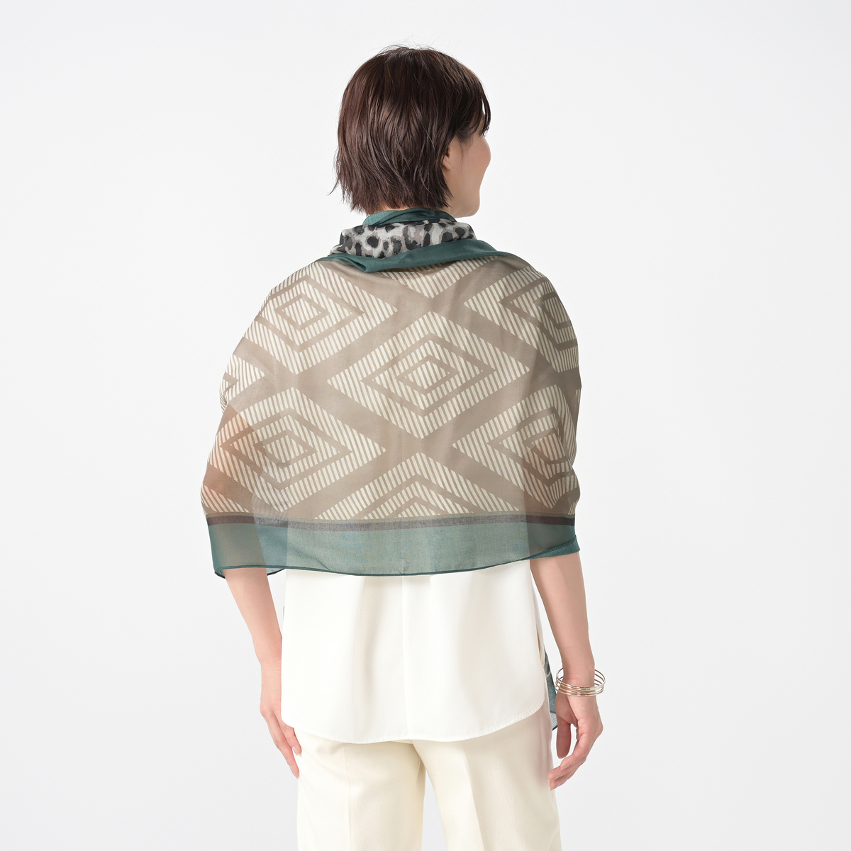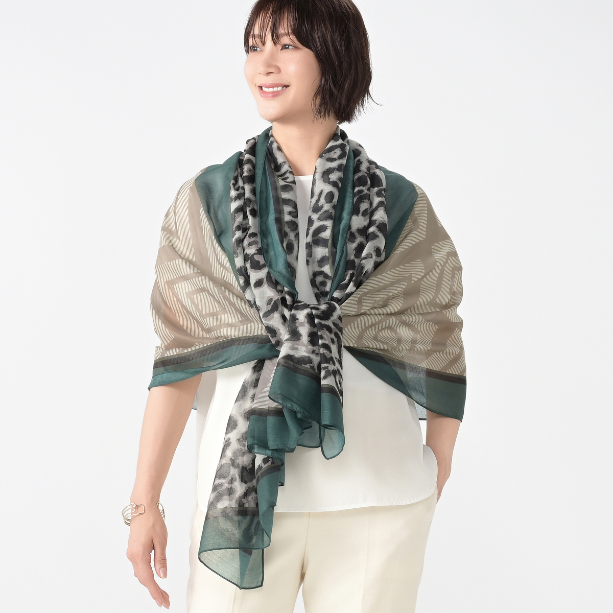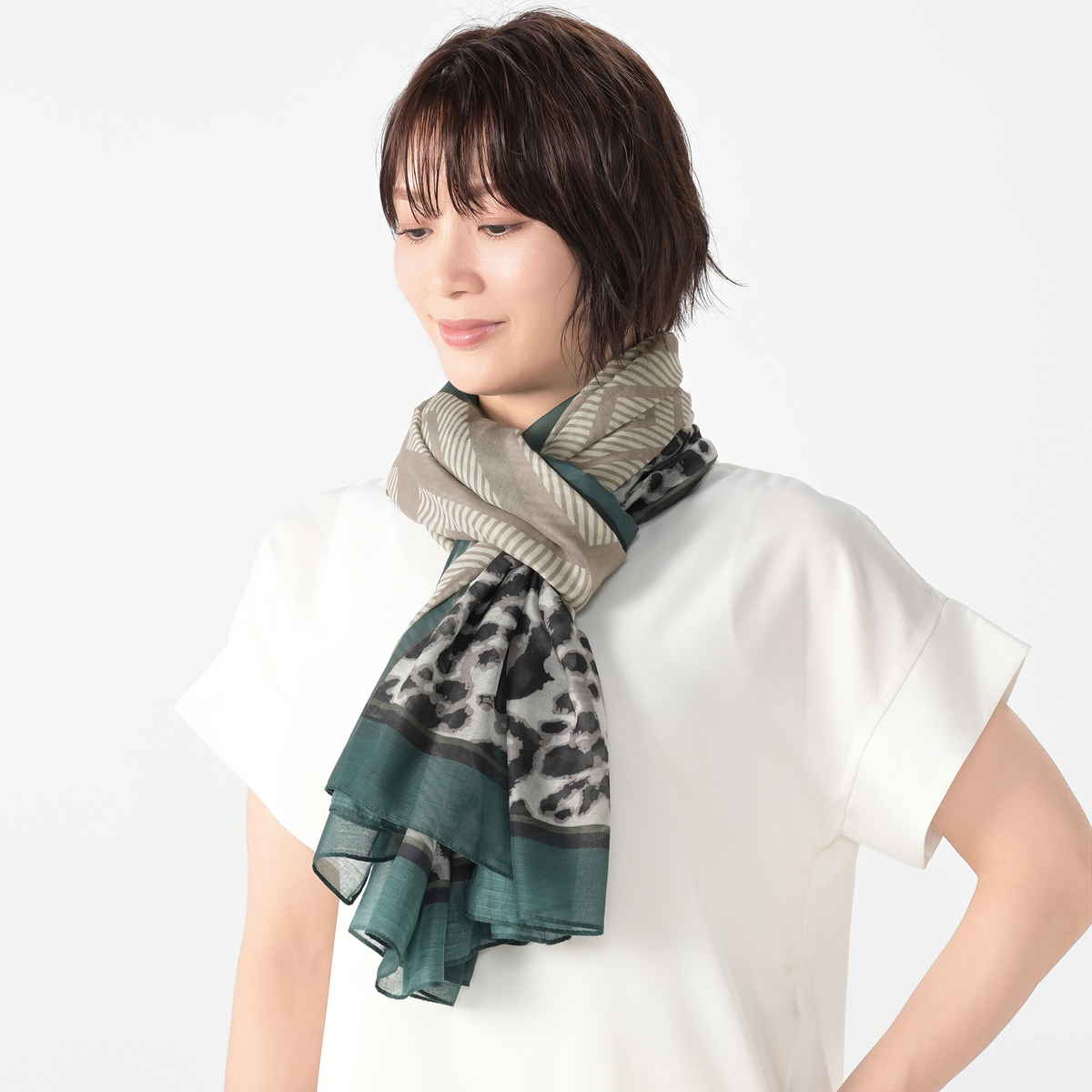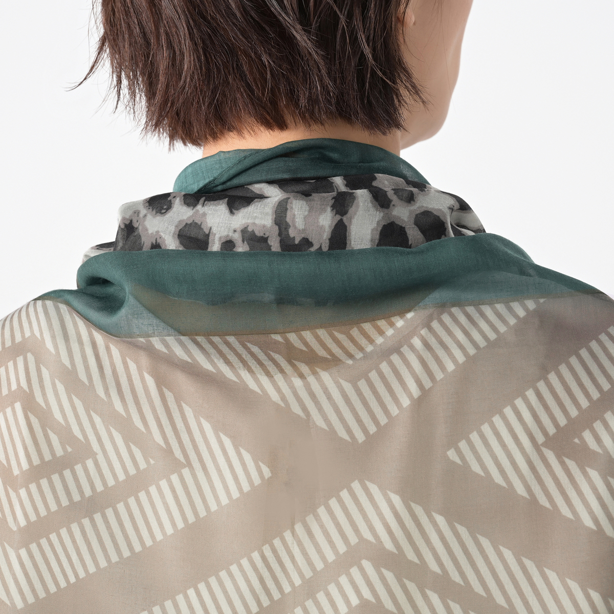 縦長に半分ずつ柄の違う大判ストール。折りたたんでそれぞれの柄だけ見せても、両方の柄感を見せても、お好きに使い分けられます。薄手のボイル素材で、軽くてしなやかな風合いです