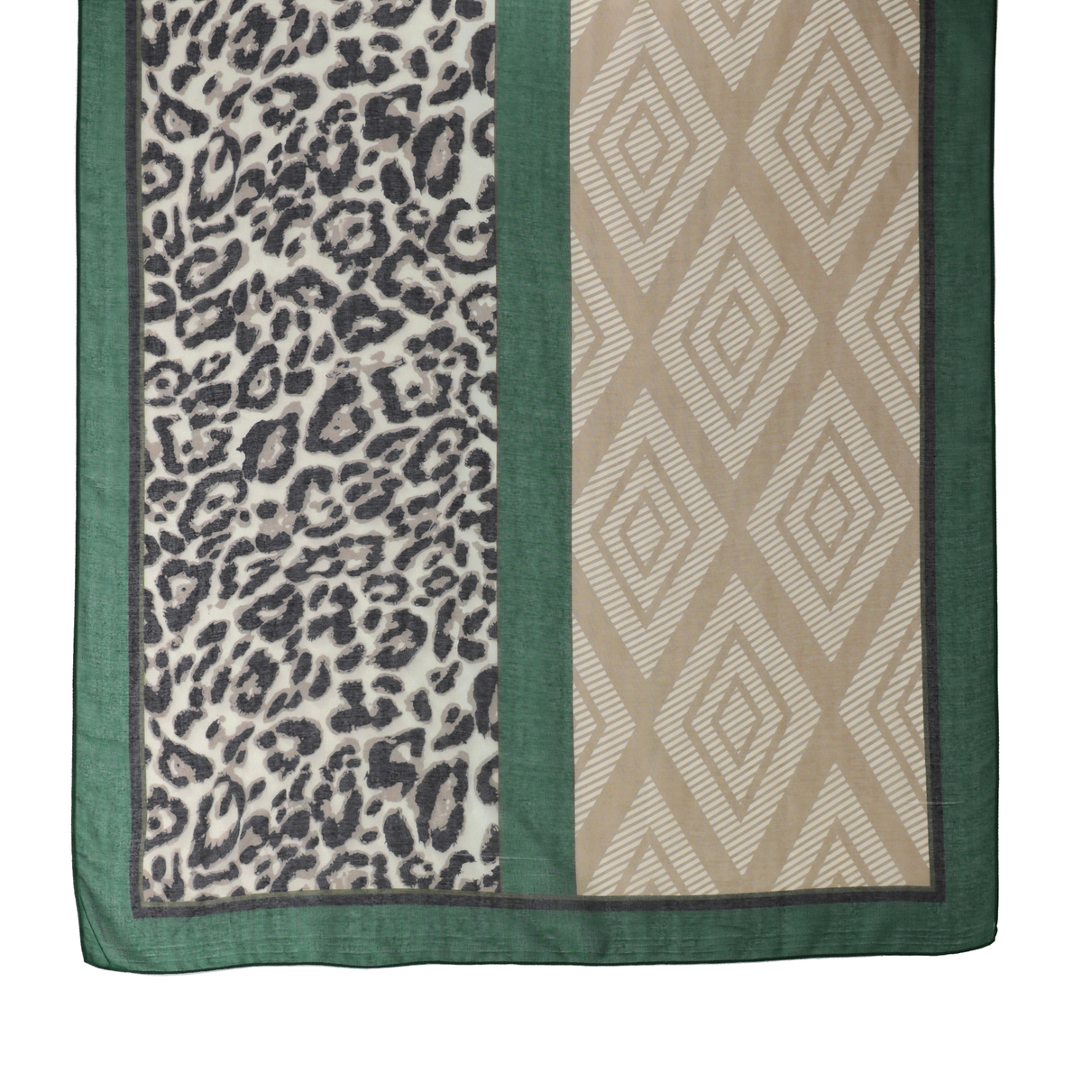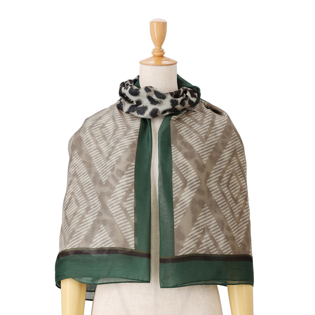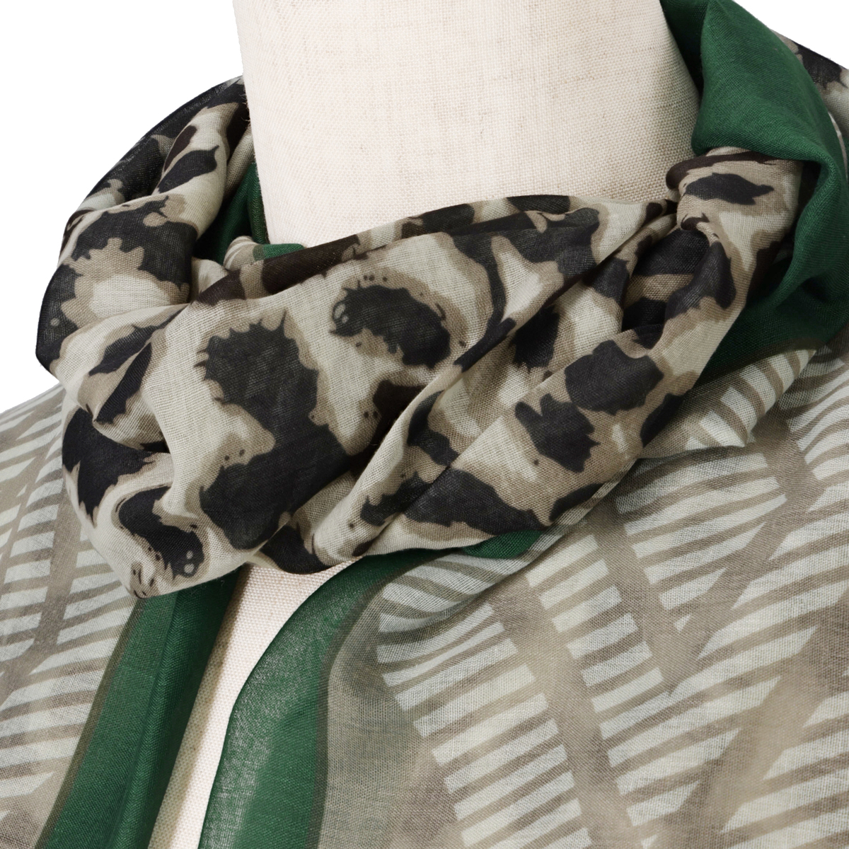 縦長に半分ずつ柄の違う大判ストール。折りたたんでそれぞれの柄だけ見せても、両方の柄感を見せても、お好きに使い分けられます。薄手のボイル素材で、軽くてしなやかな風合いです